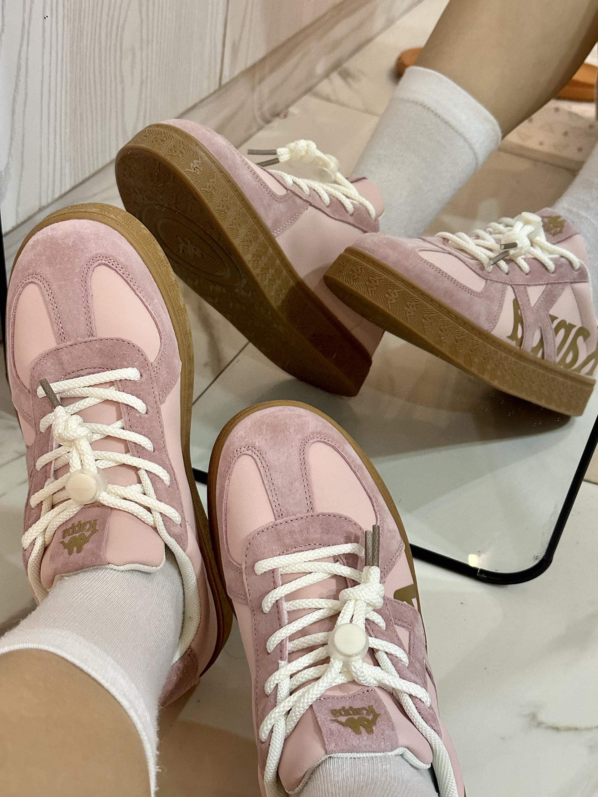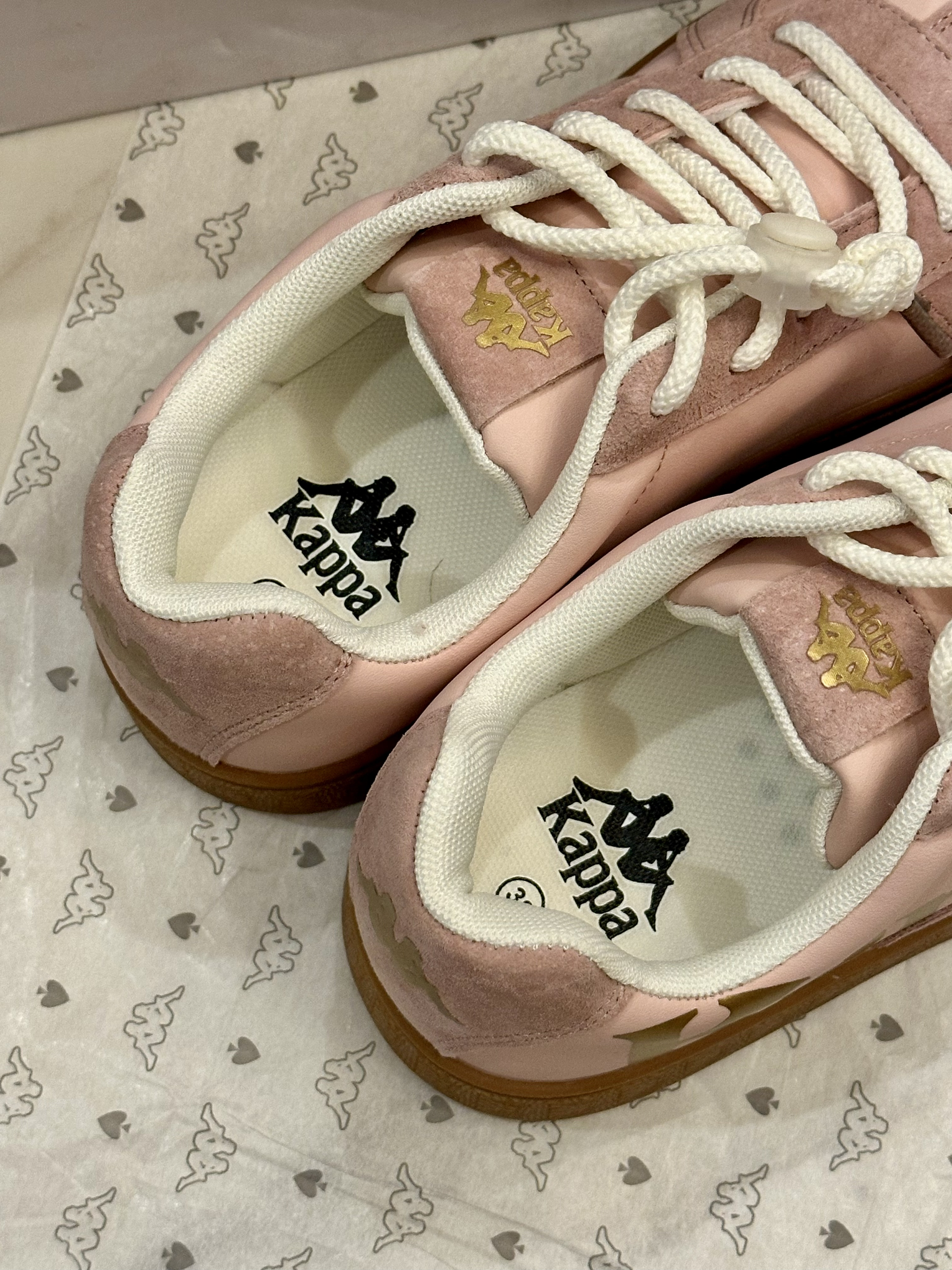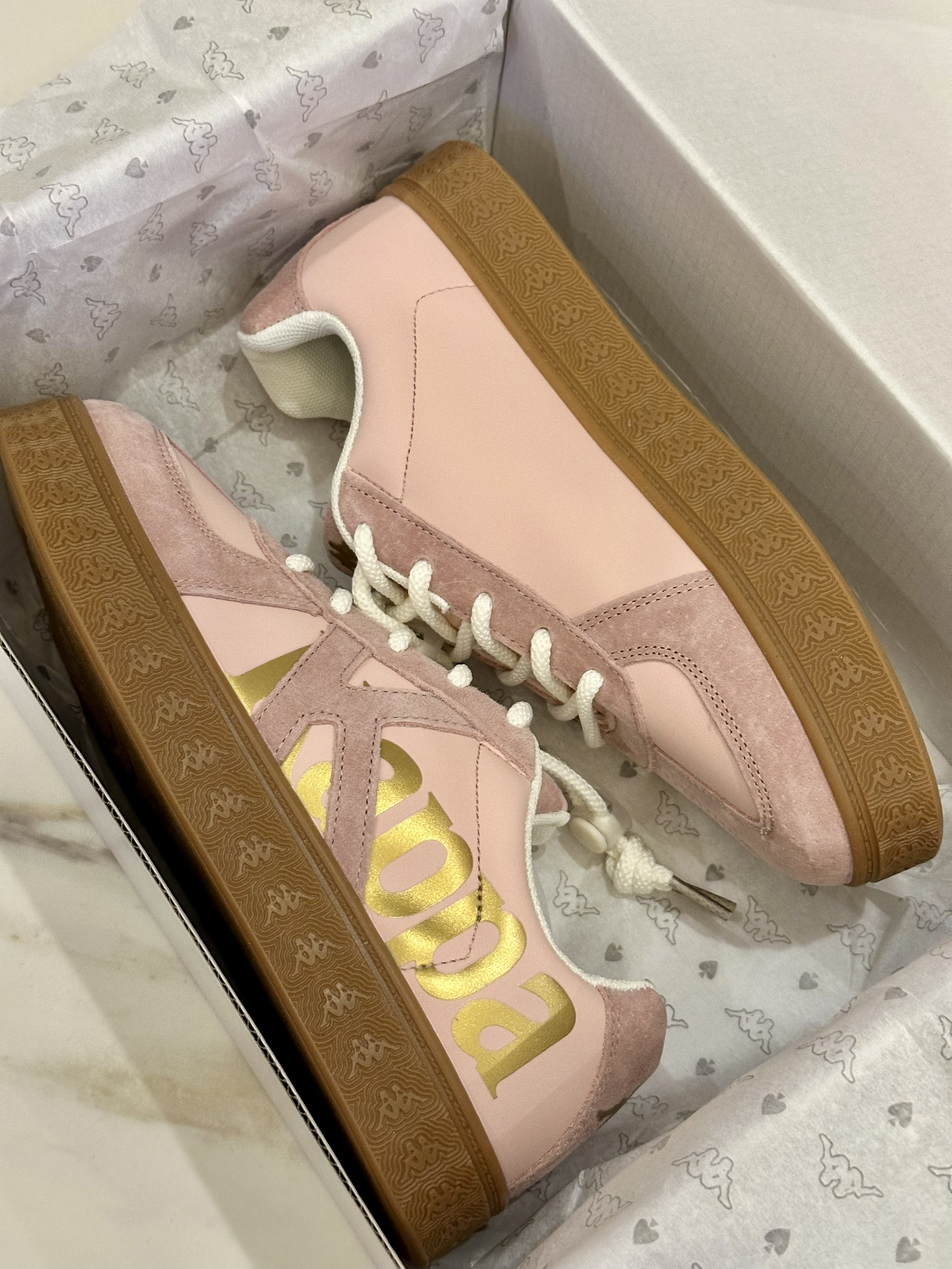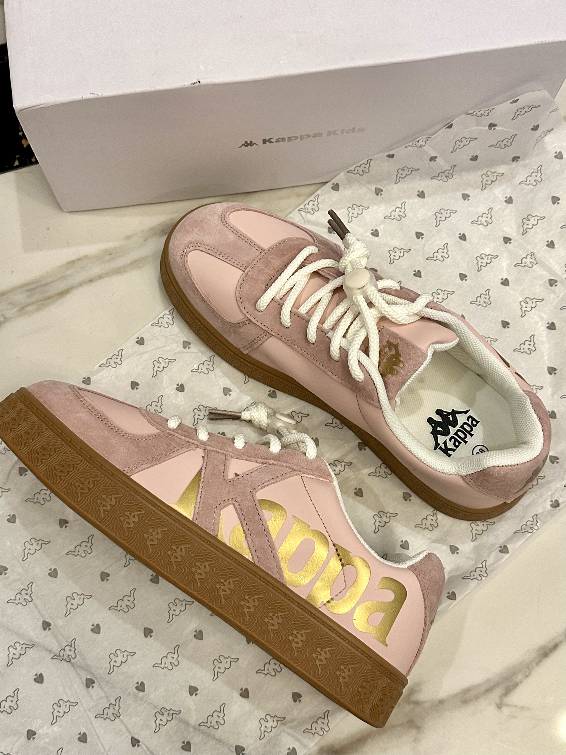 第一次买童鞋,没想到意外的好穿啊 粉嫩嫩的,金标logo,好好看 鞋底很软,上脚老舒服了 而且敲百搭哇, 是女孩子会爱不释手的一双板鞋吖🌸