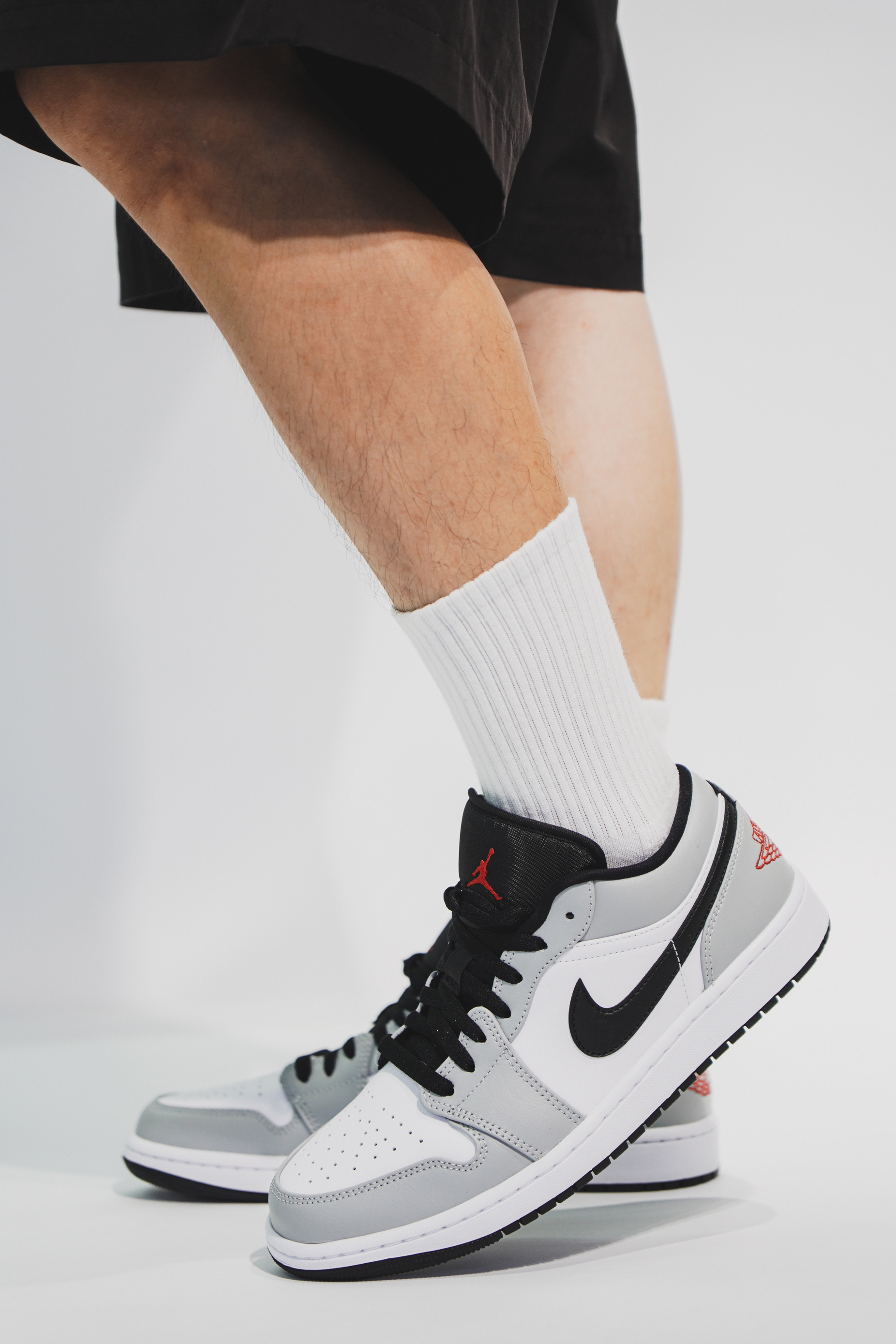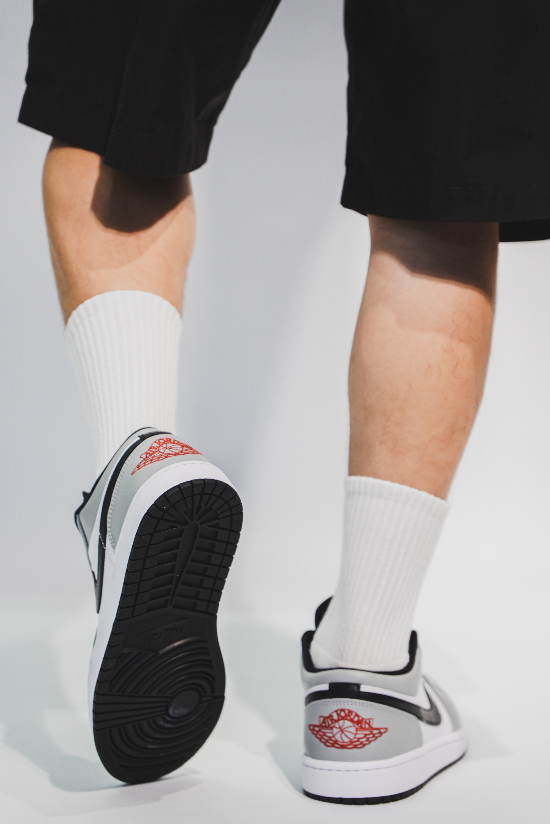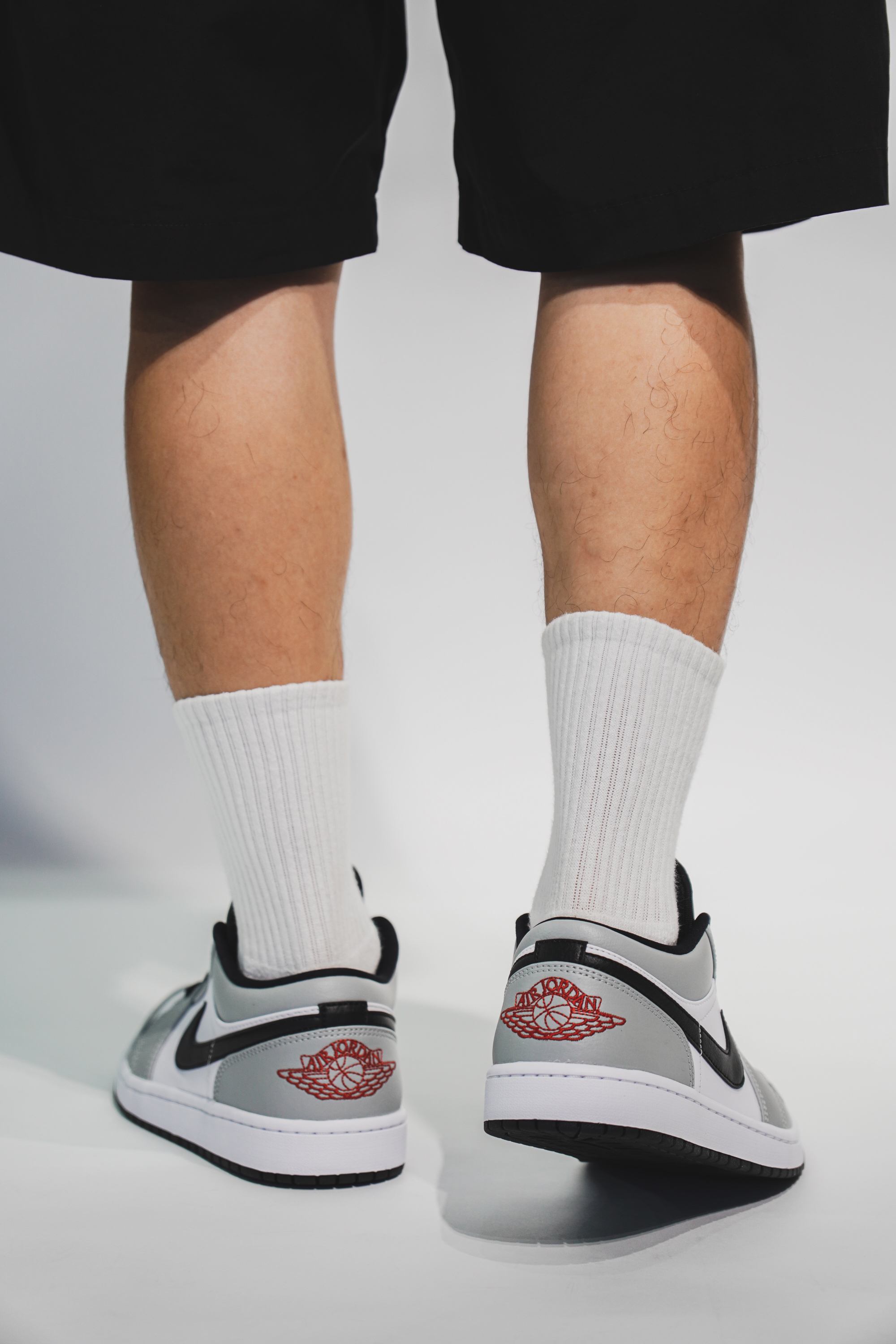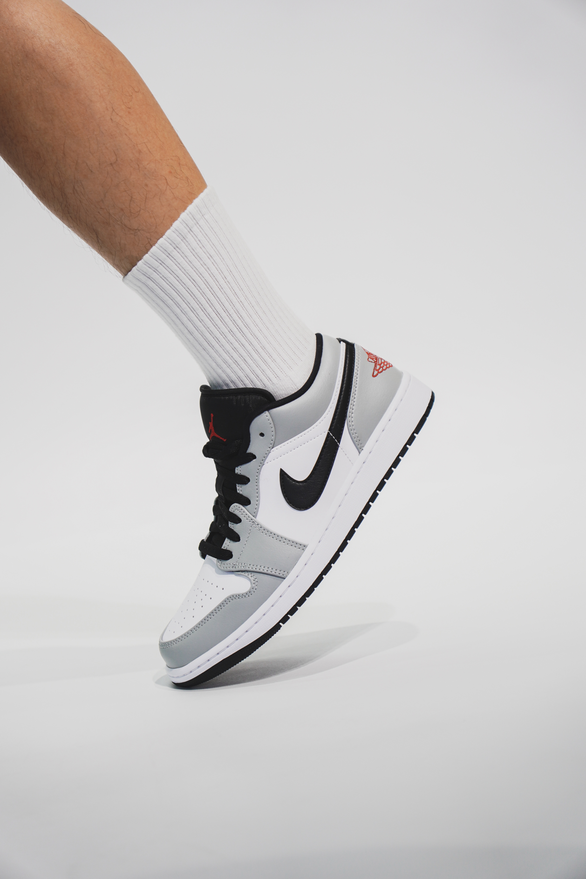 这双鞋的整体配色其实与高帮非常的相像,之所以叫烟灰,当然是采用了灰色和白色为主色调。鞋子的侧面钩子和鞋舌处都采用了黑色做填充,鞋后跟处采用了跟高帮不一样的效果,有着醒目的红色标,最后则采用了白色的中底与黑色鞋底来完成收尾。低帮在搭配上比高帮多了随性与休闲的空间,灰白的主色调显得十分沉稳。