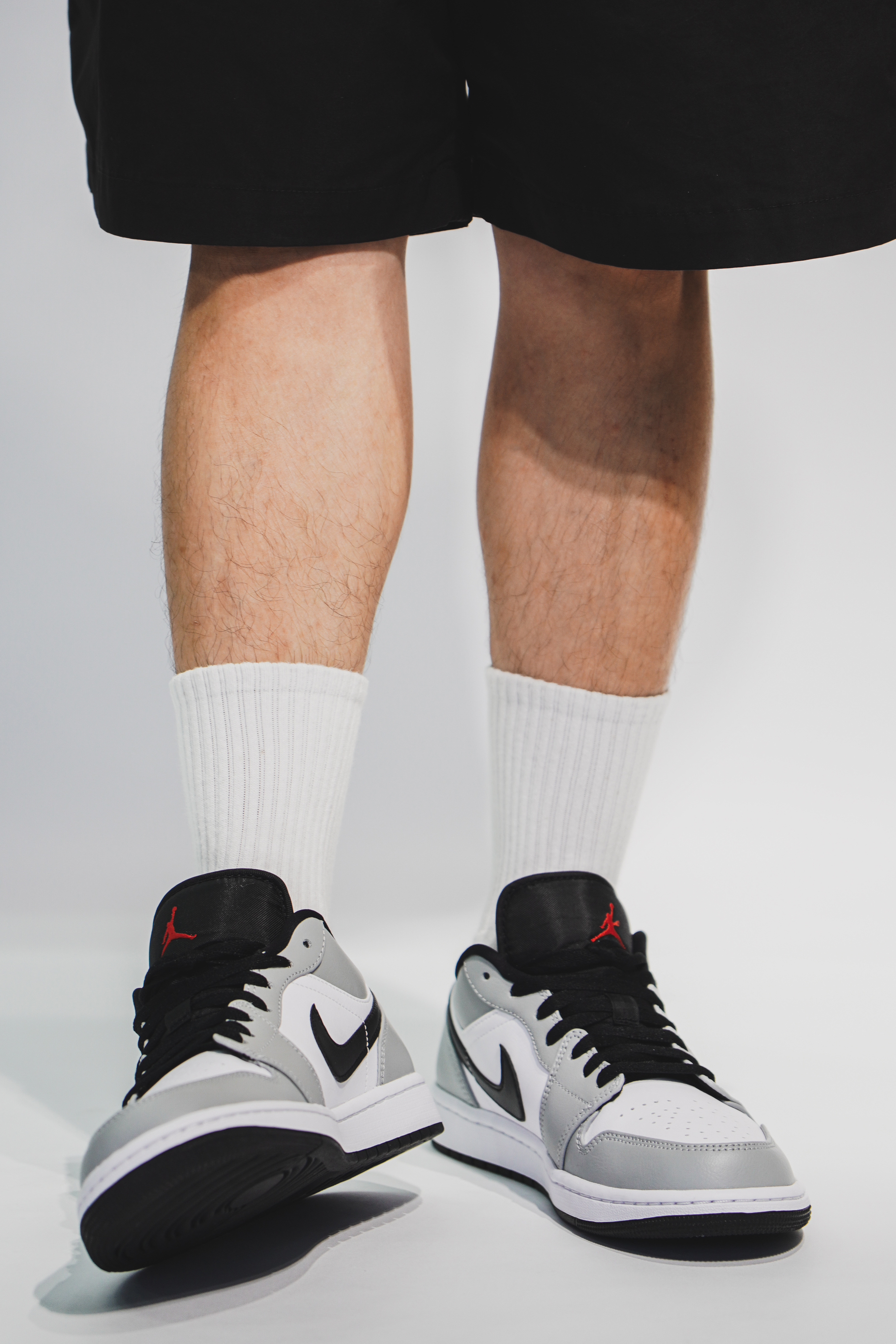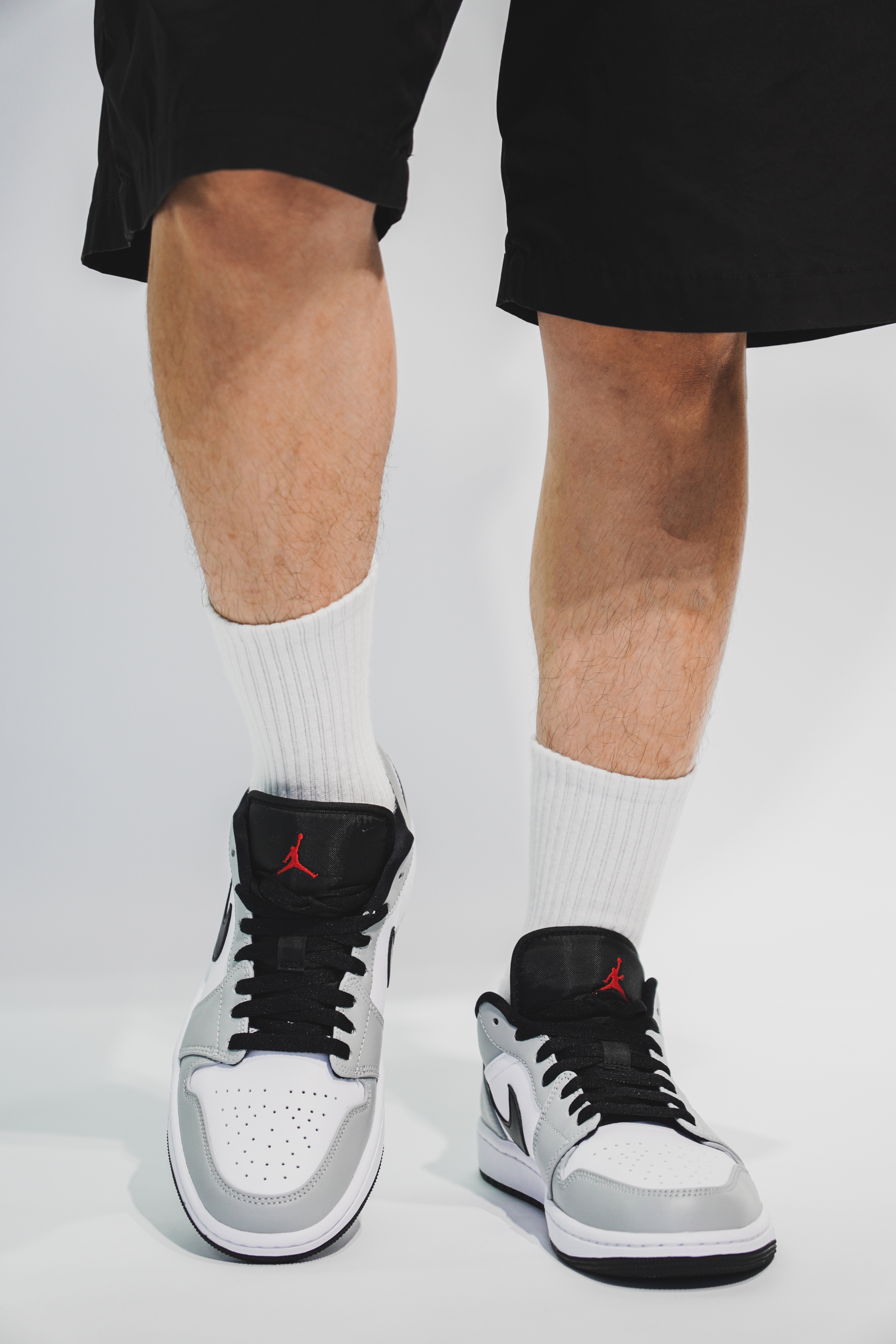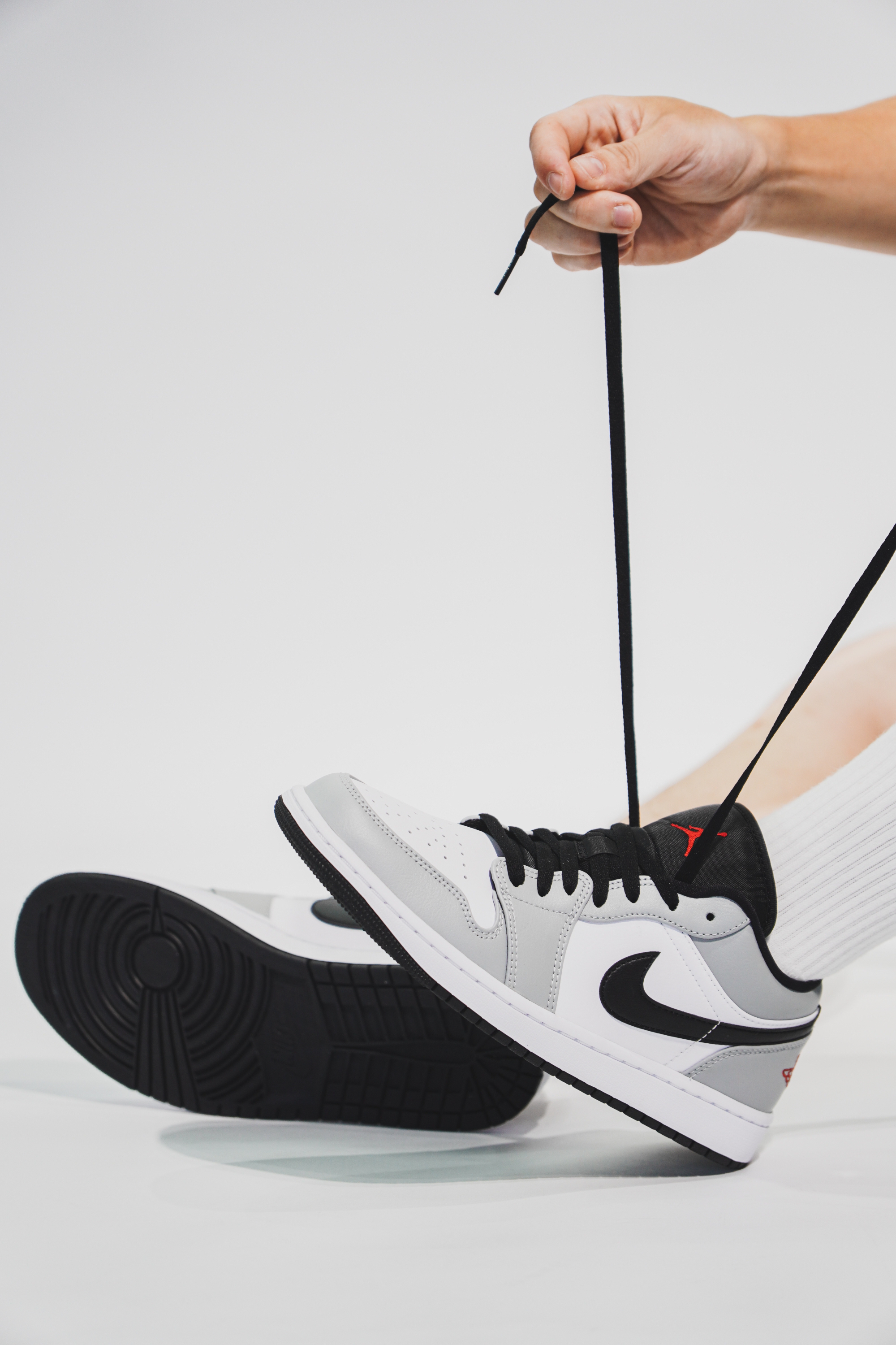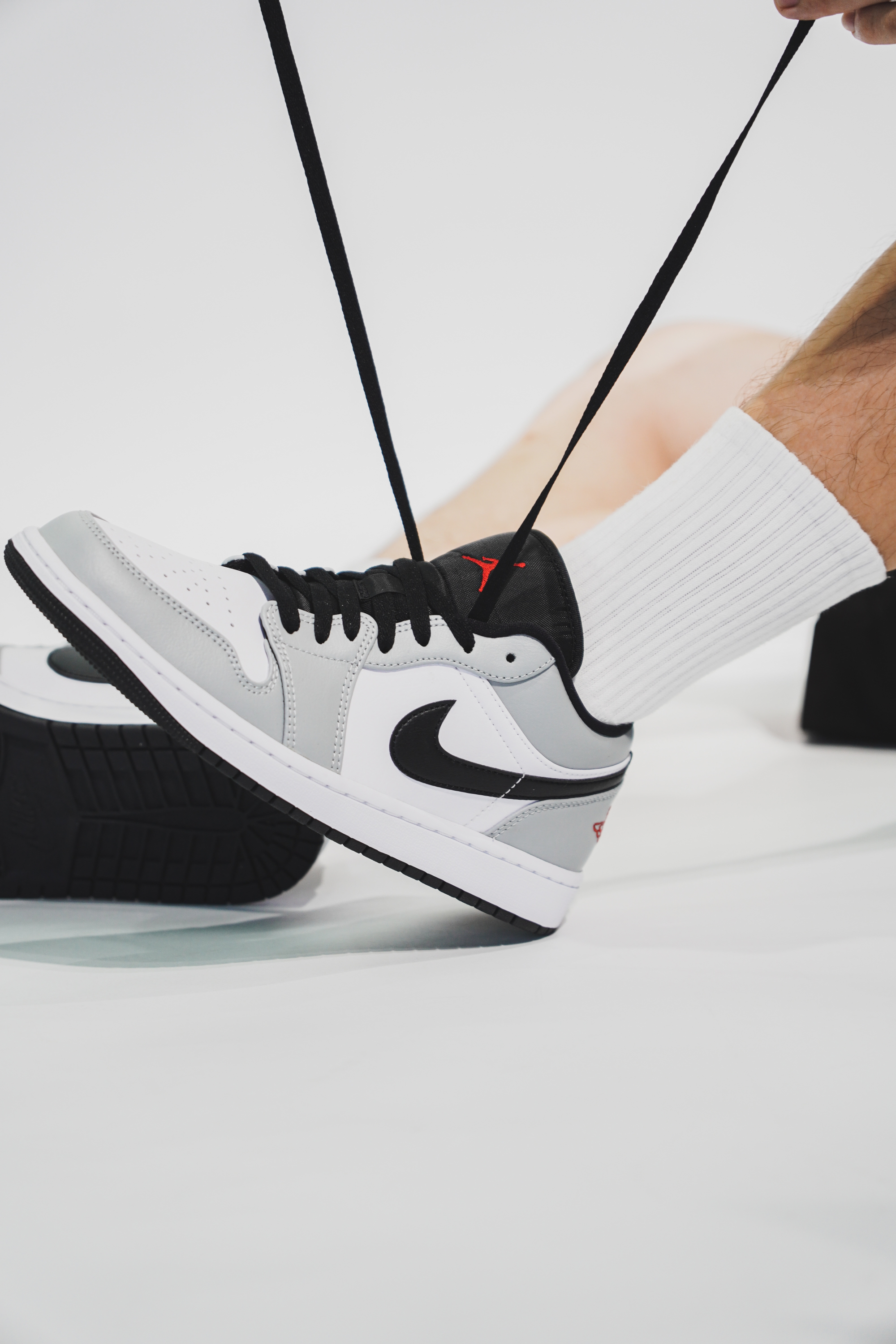 这双鞋的整体配色其实与高帮非常的相像,之所以叫烟灰,当然是采用了灰色和白色为主色调。鞋子的侧面钩子和鞋舌处都采用了黑色做填充,鞋后跟处采用了跟高帮不一样的效果,有着醒目的红色标,最后则采用了白色的中底与黑色鞋底来完成收尾。低帮在搭配上比高帮多了随性与休闲的空间,灰白的主色调显得十分沉稳。