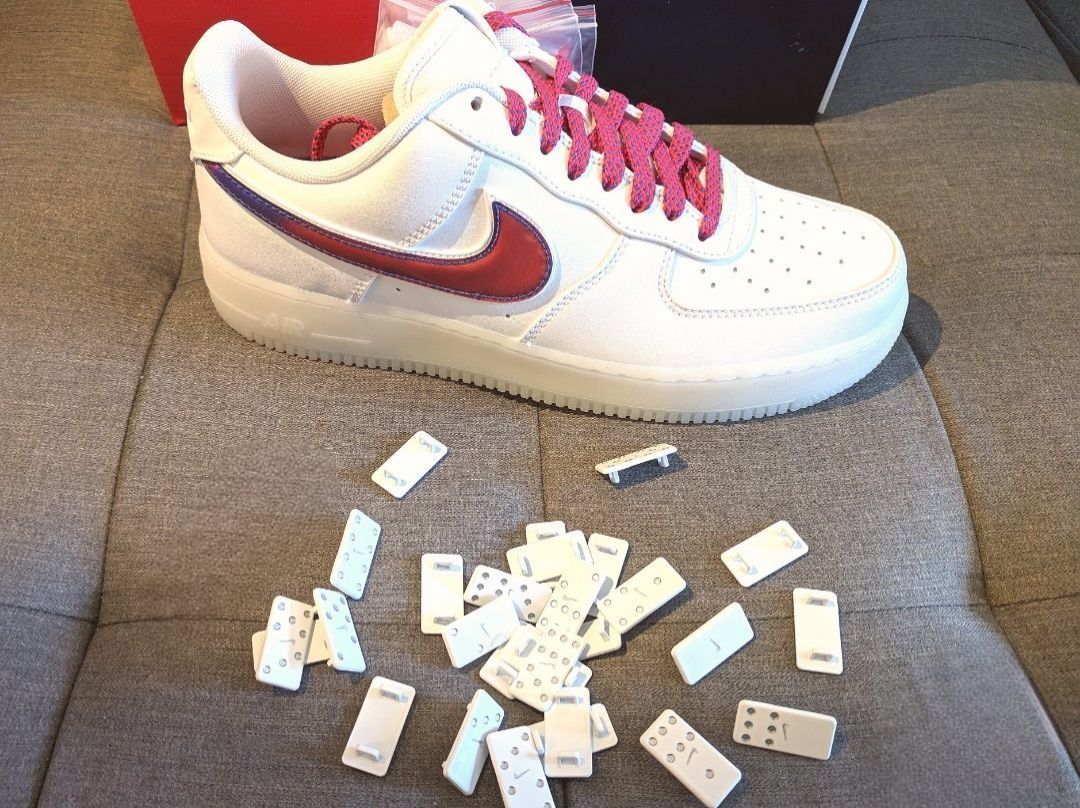 今天分享一双很不错的AF老图Air Force De Lo Mio多米尼加这是一双全身3M又有炫酷 大勾的空军 他有着米白半透明大底大底下面 有这De Lo Mio和勾子的花纹非常的漂亮鞋 子除了设计外还有很多有趣的配件比如鞋纸 印有关于多米尼加和耐克的故事而鞋带上平 时的金属牌则给了一整包的骨牌来替代可玩 性很高 不过唯一可惜的是因为3M材质鞋身 容易起皱 所以得真珍惜着穿!!!