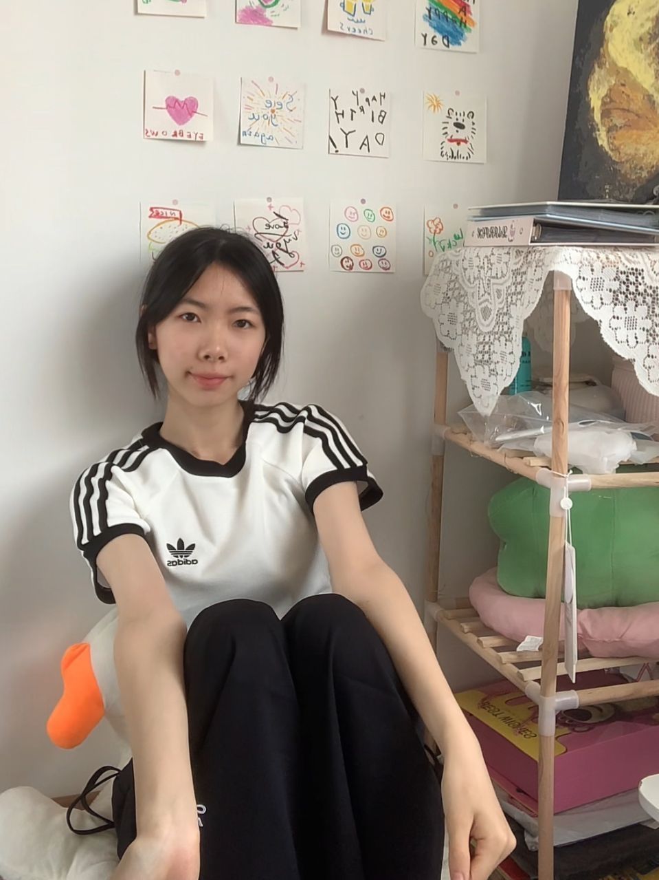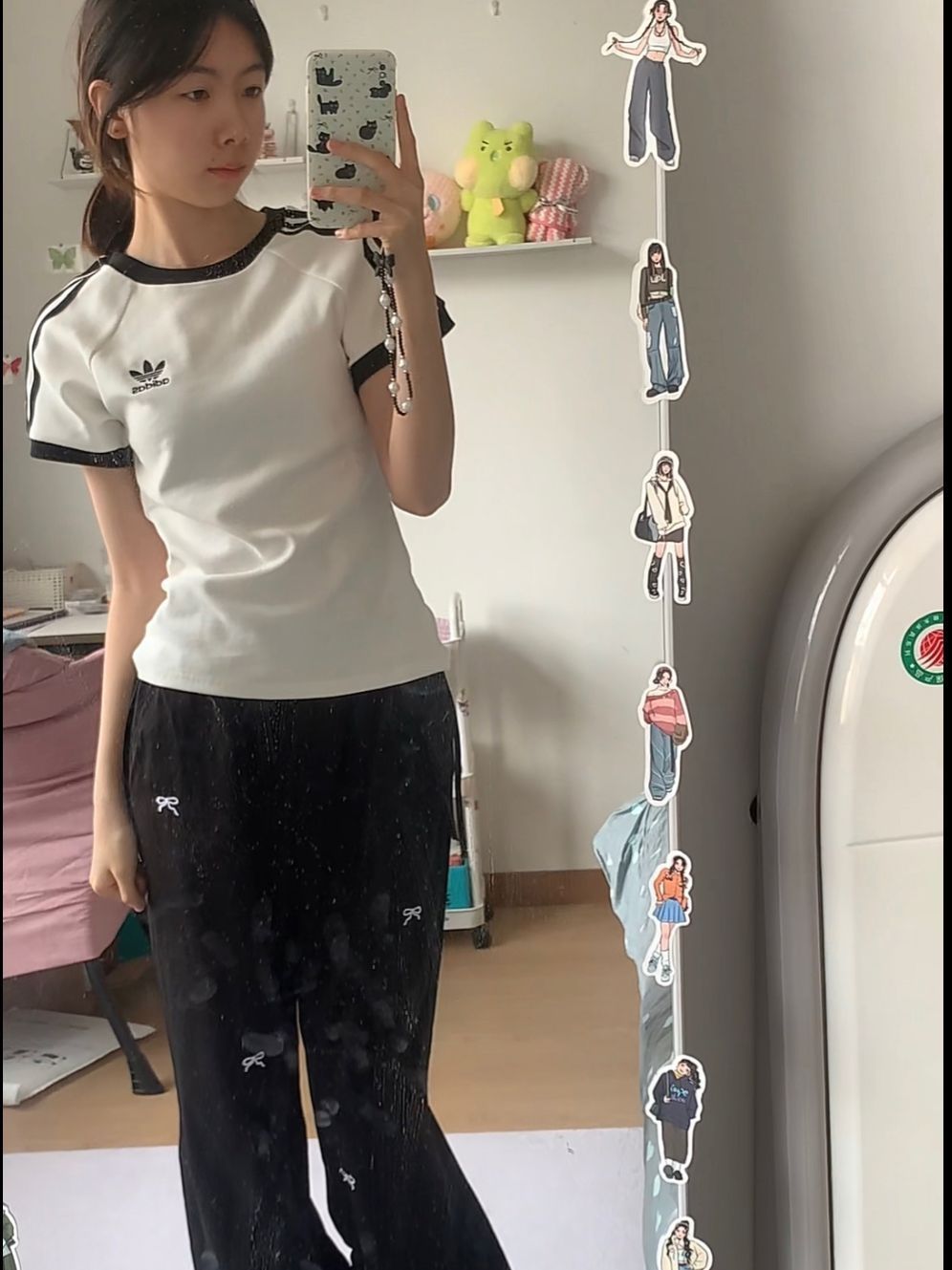 今日穿搭 这样穿真的好有艺术感 👕 特别是这件阿迪的短袖 真的很好看 👖 下面配这条黑色的蝴蝶结裤子也很百搭