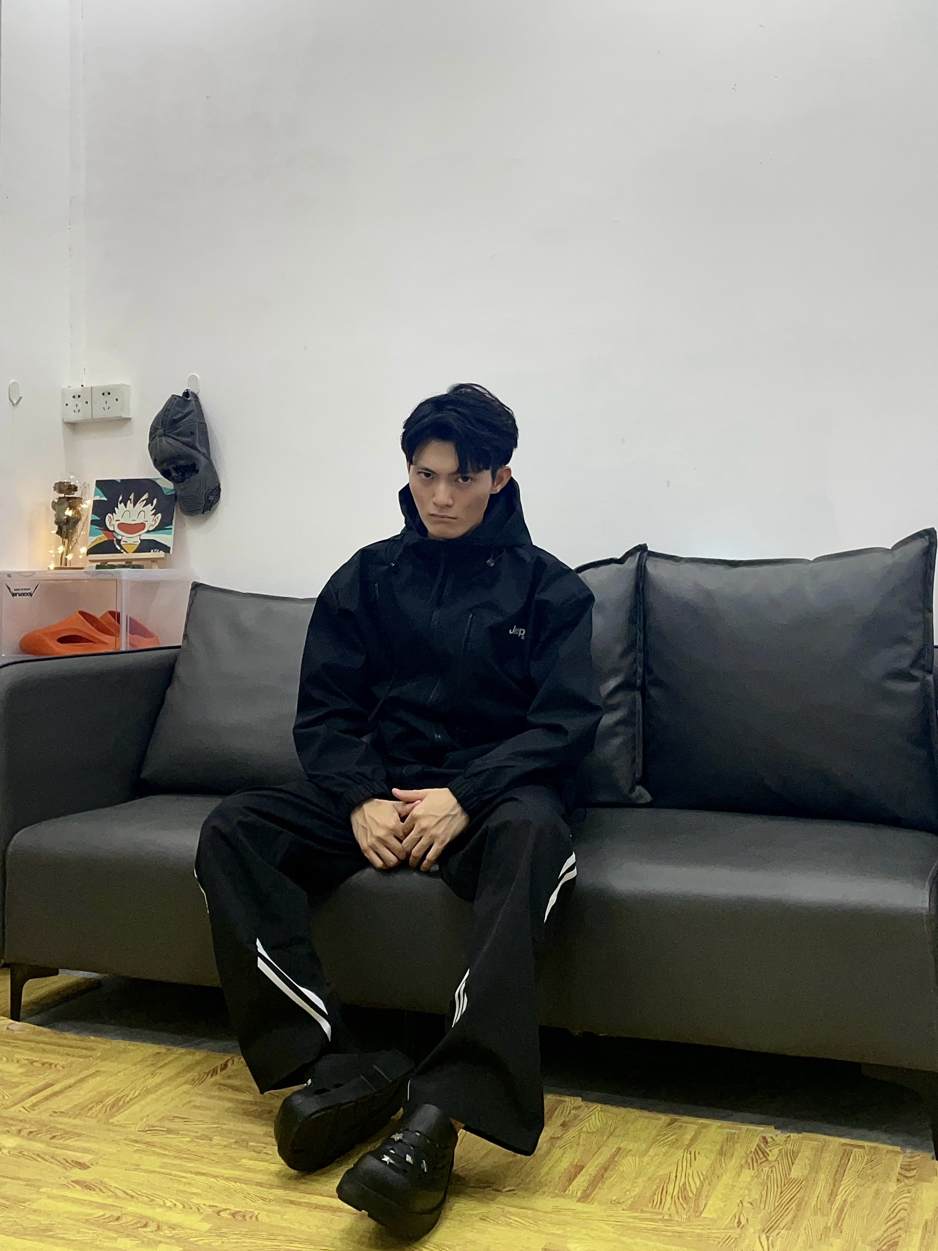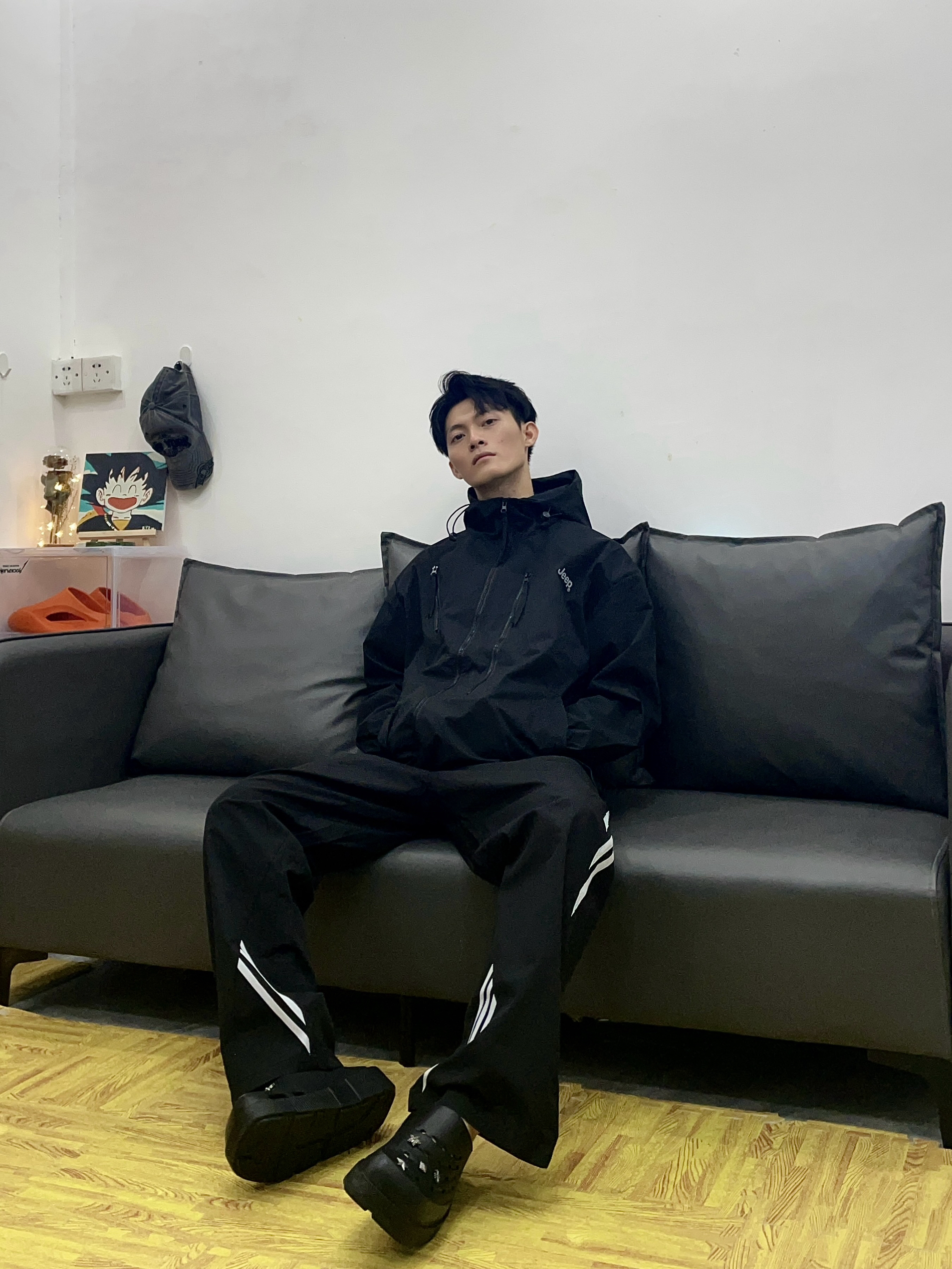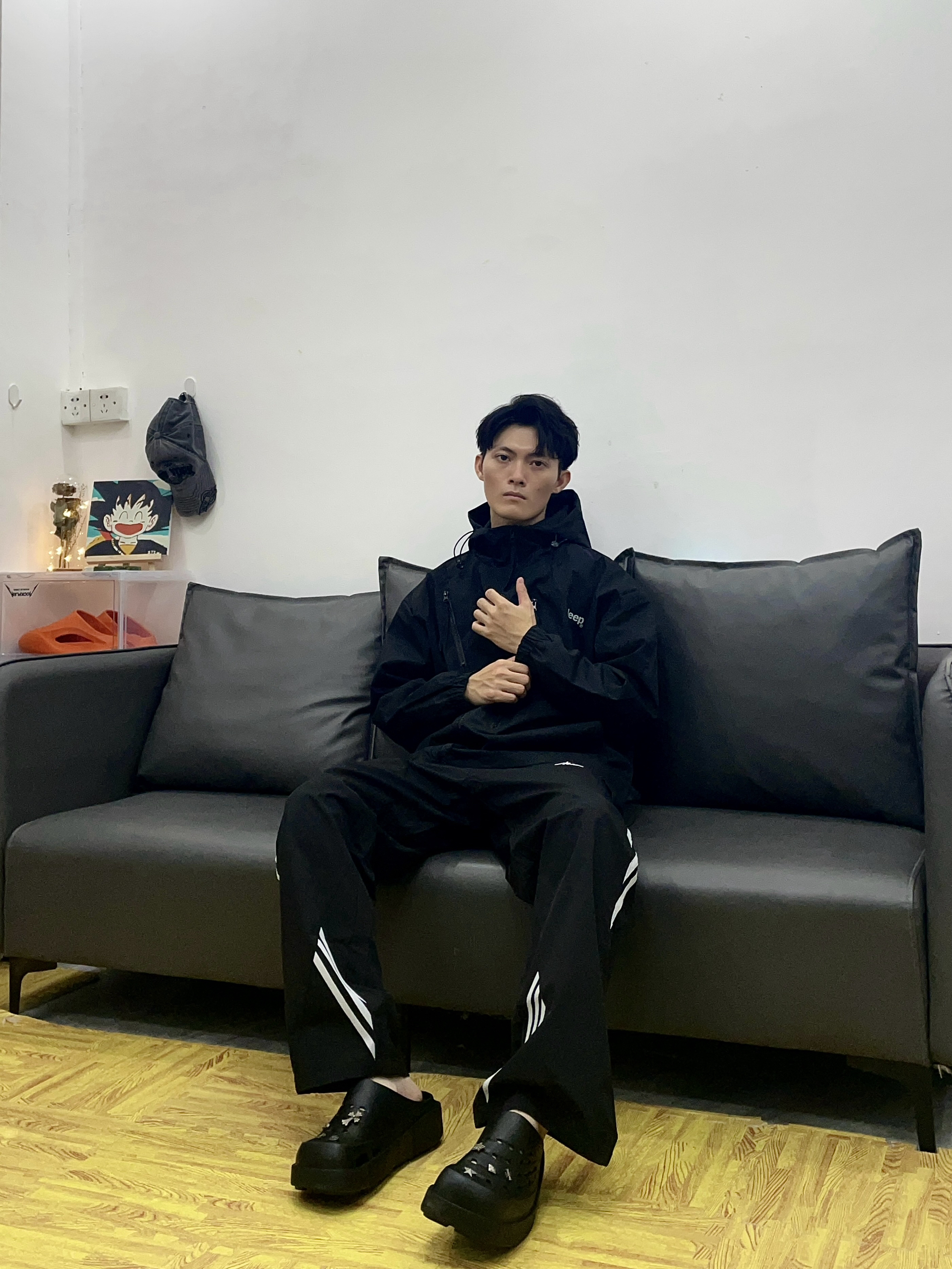 🎧简单一下今天的这身穿搭吧[机智_blue] 📸机能风冲锋衣➕条纹休闲长裤 — — — — — — — — — — — — — — — ①OOTD 👔户外山系登山冲锋衣,可御寒山地多用途,面料也防水防风透气耐磨,男女同款七夕限定 — 👖黑色经典三条杠撞色条纹休闲裤,机能风宽松设计风格简约感强,面料易防水的材质, — ②tips✨ 秋季安可雷一身黑色出行,整体更加高级简约,休闲显气质