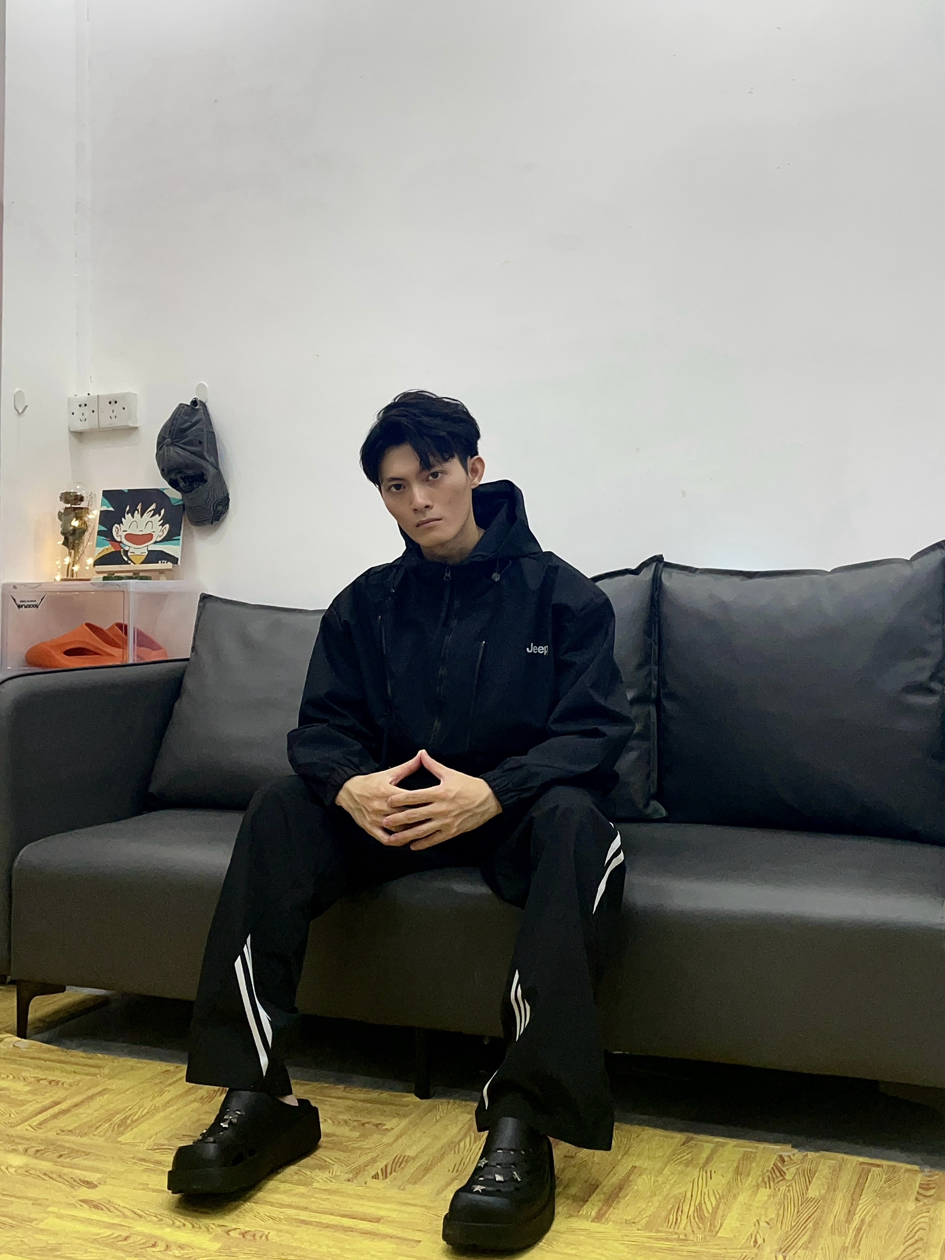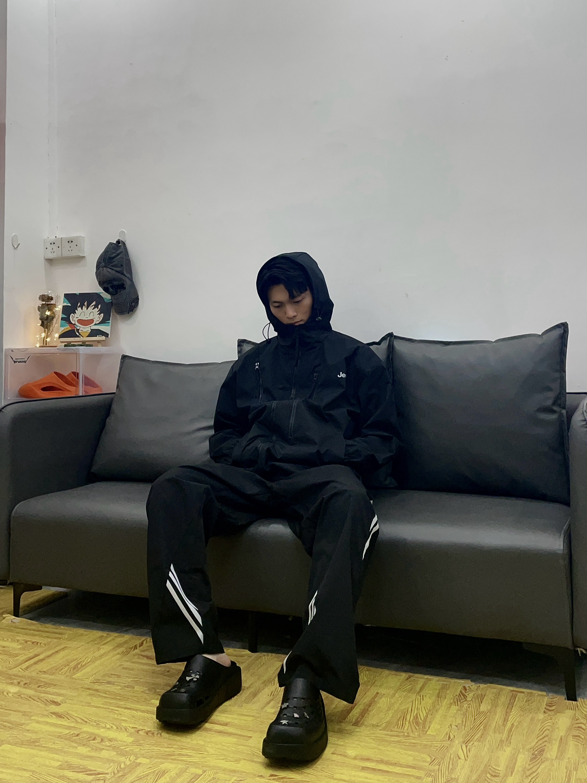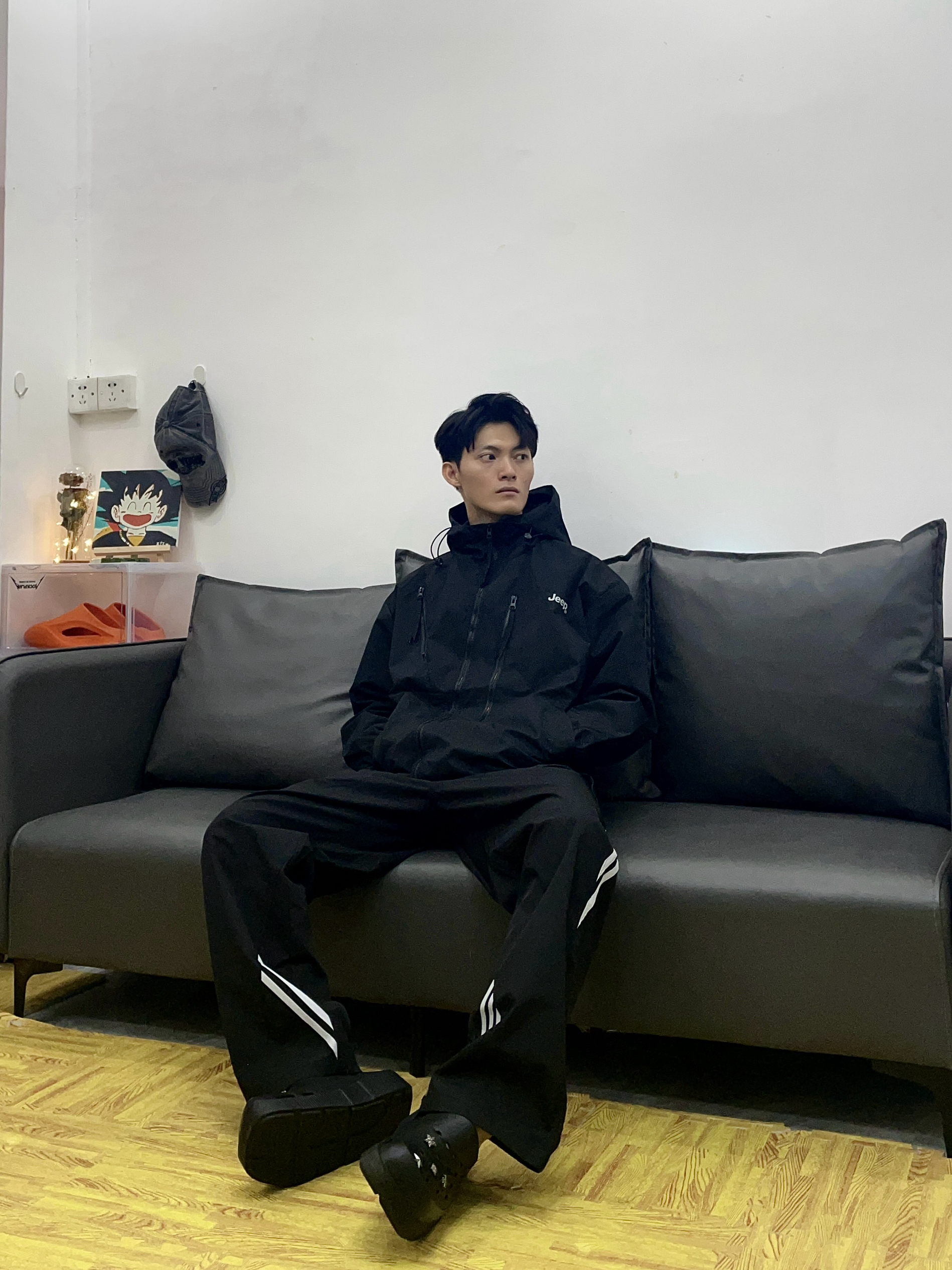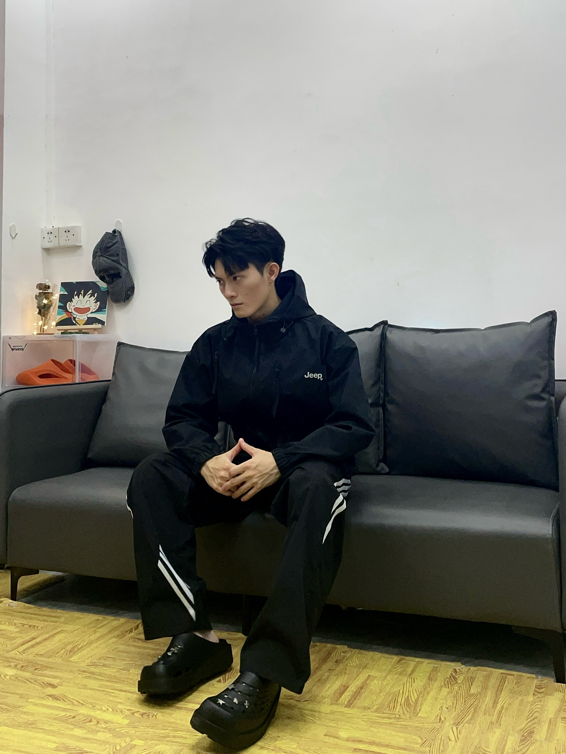 🎧简单一下今天的这身穿搭吧[机智_blue] 📸机能风冲锋衣➕条纹休闲长裤 — — — — — — — — — — — — — — — ①OOTD 👔户外山系登山冲锋衣,可御寒山地多用途,面料也防水防风透气耐磨,男女同款七夕限定 — 👖黑色经典三条杠撞色条纹休闲裤,机能风宽松设计风格简约感强,面料易防水的材质, — ②tips✨ 秋季安可雷一身黑色出行,整体更加高级简约,休闲显气质
