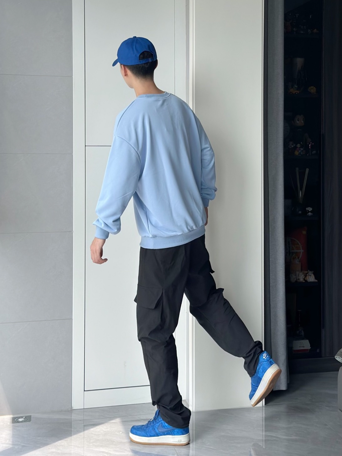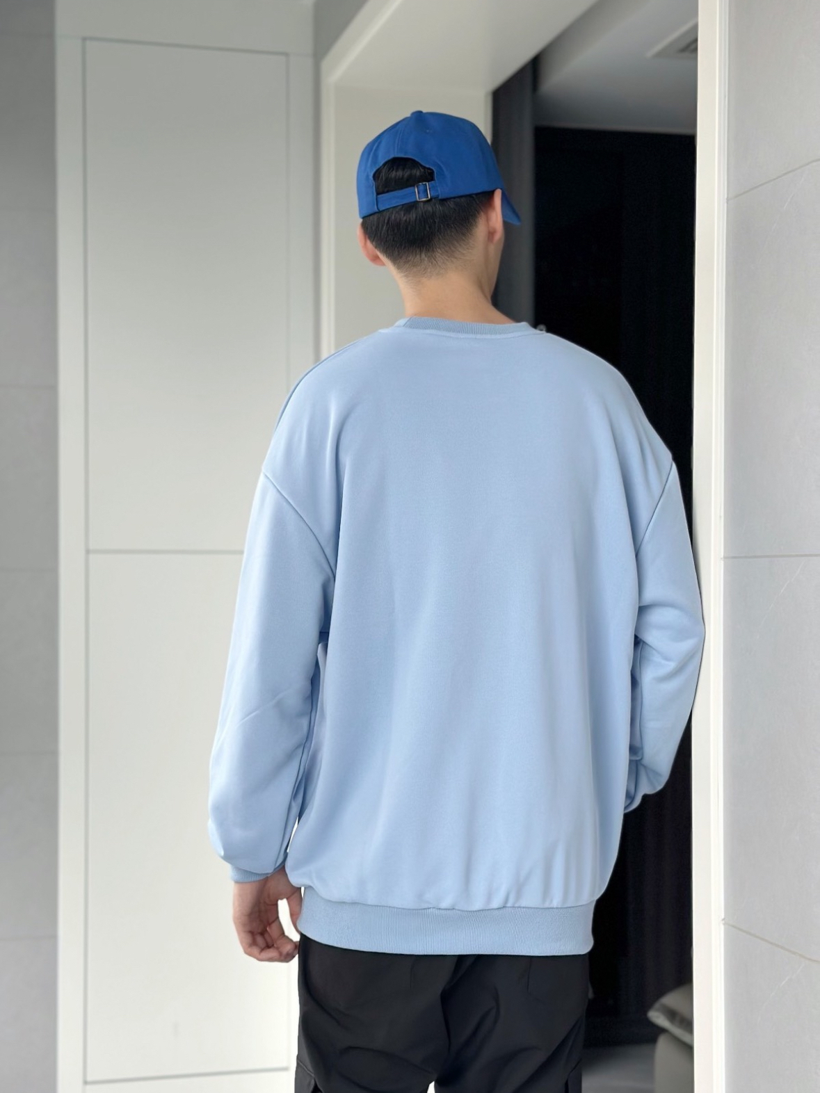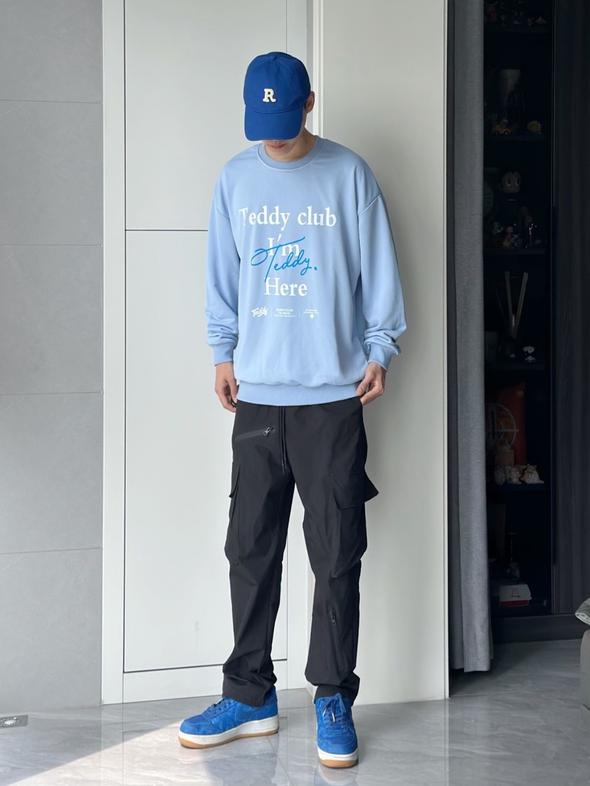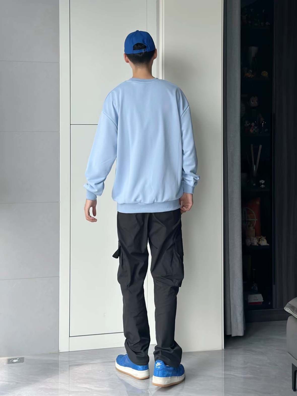 不得不说 浅蓝色真的很显白啊 好看的婴儿蓝 在这个季节来点亮颜色 主打的就是一身蓝色系穿搭 宽松的卫衣穿着就是很舒服 👔 用黑色裤子衬托的蓝色更加好看了 帽子和鞋子都是同色系呼应 穿搭小心机 👔 身高:175 体重:64 L 宽松