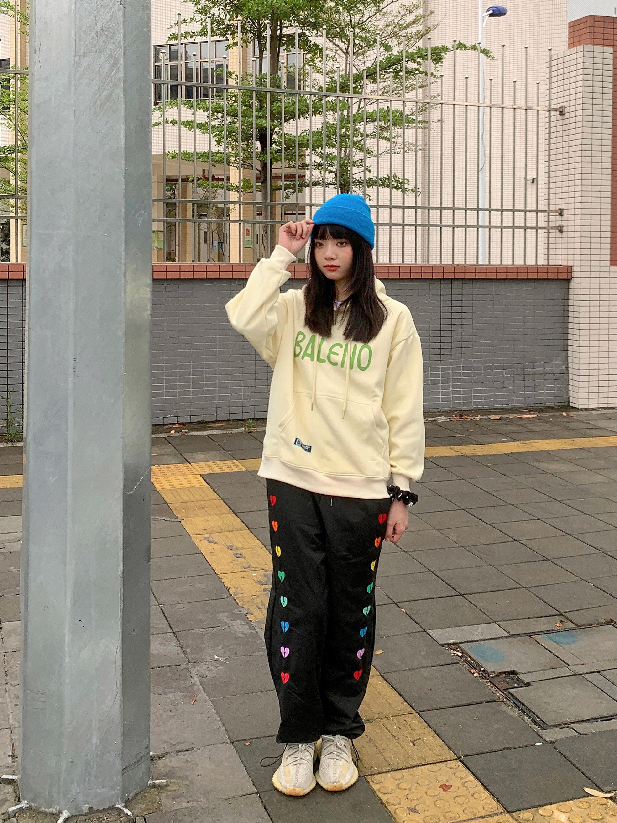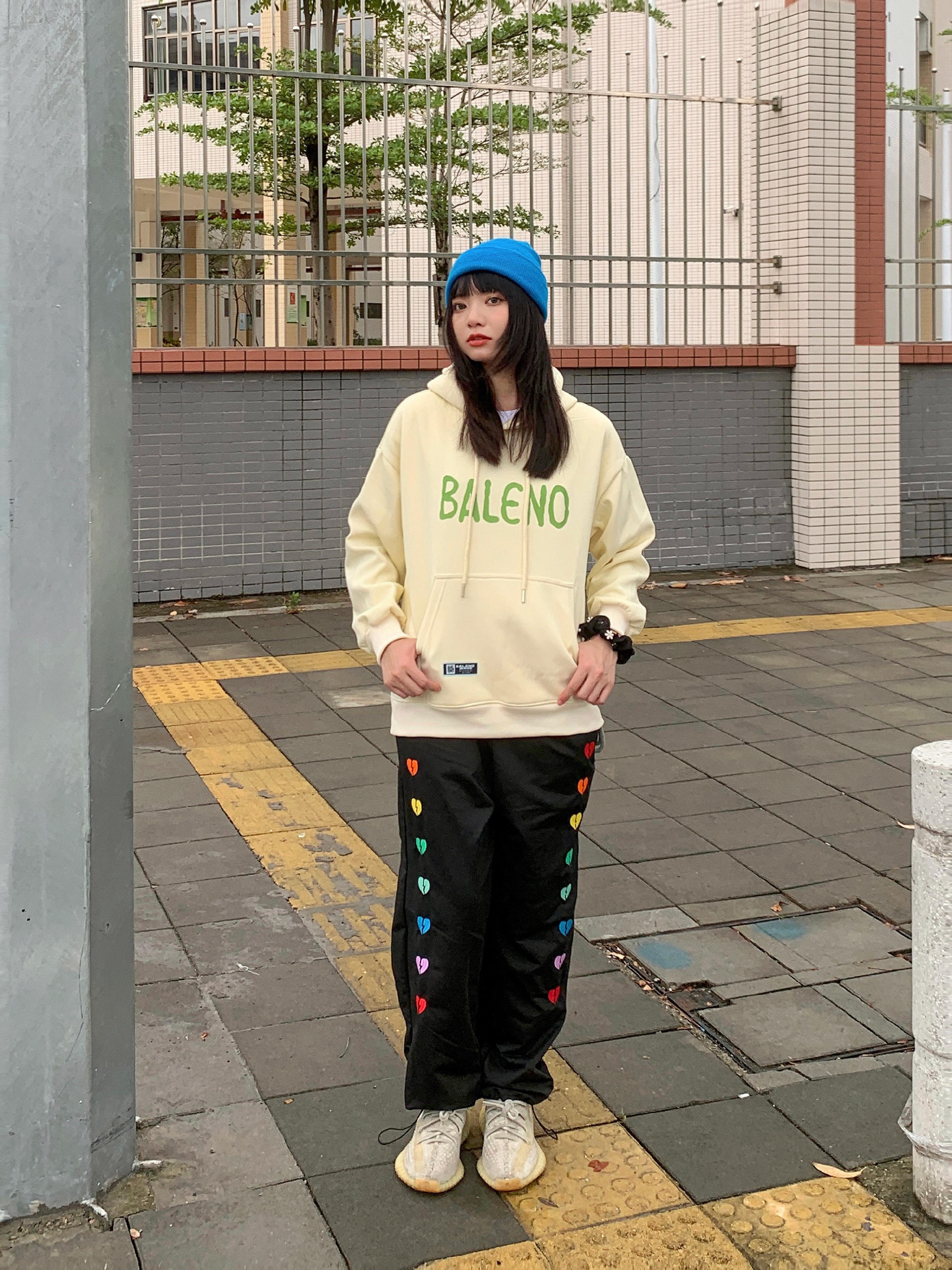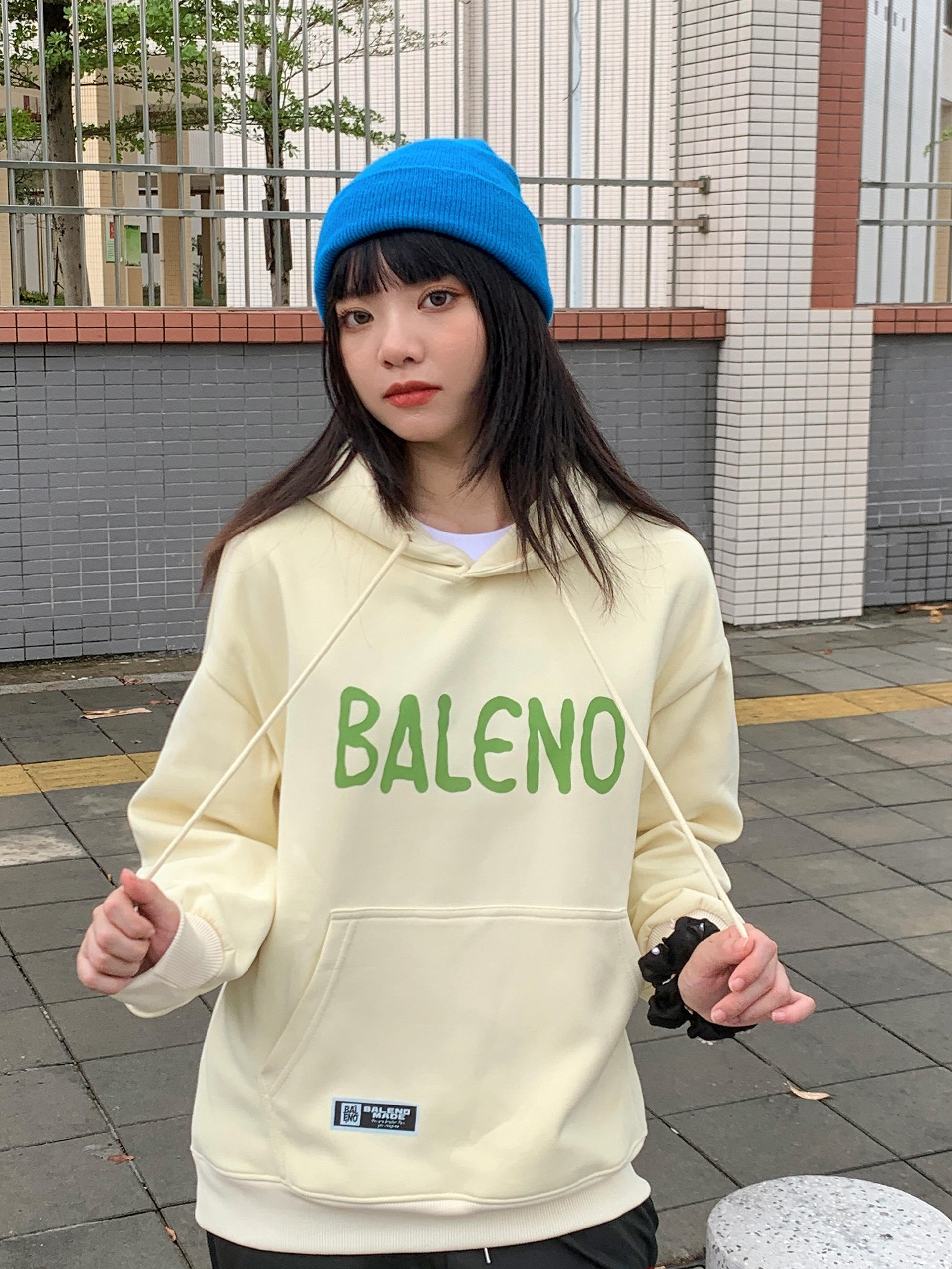 初秋第一件卫衣 大logo的图案设计特别亮眼 内衬件白t穿出层次感 再搭个亮色的配色就很加分了 蓝色的针织帽给整体穿搭增添了色彩
