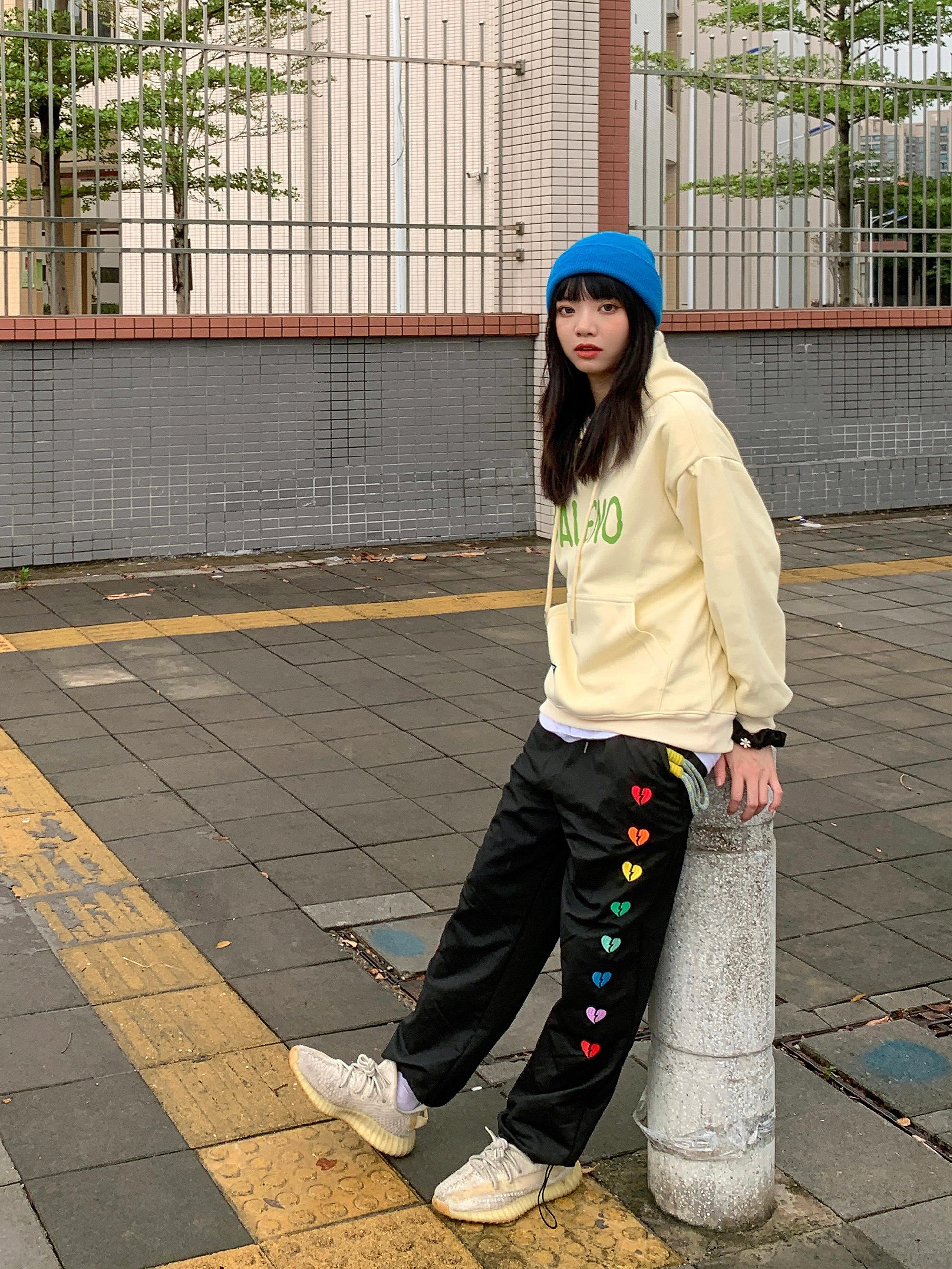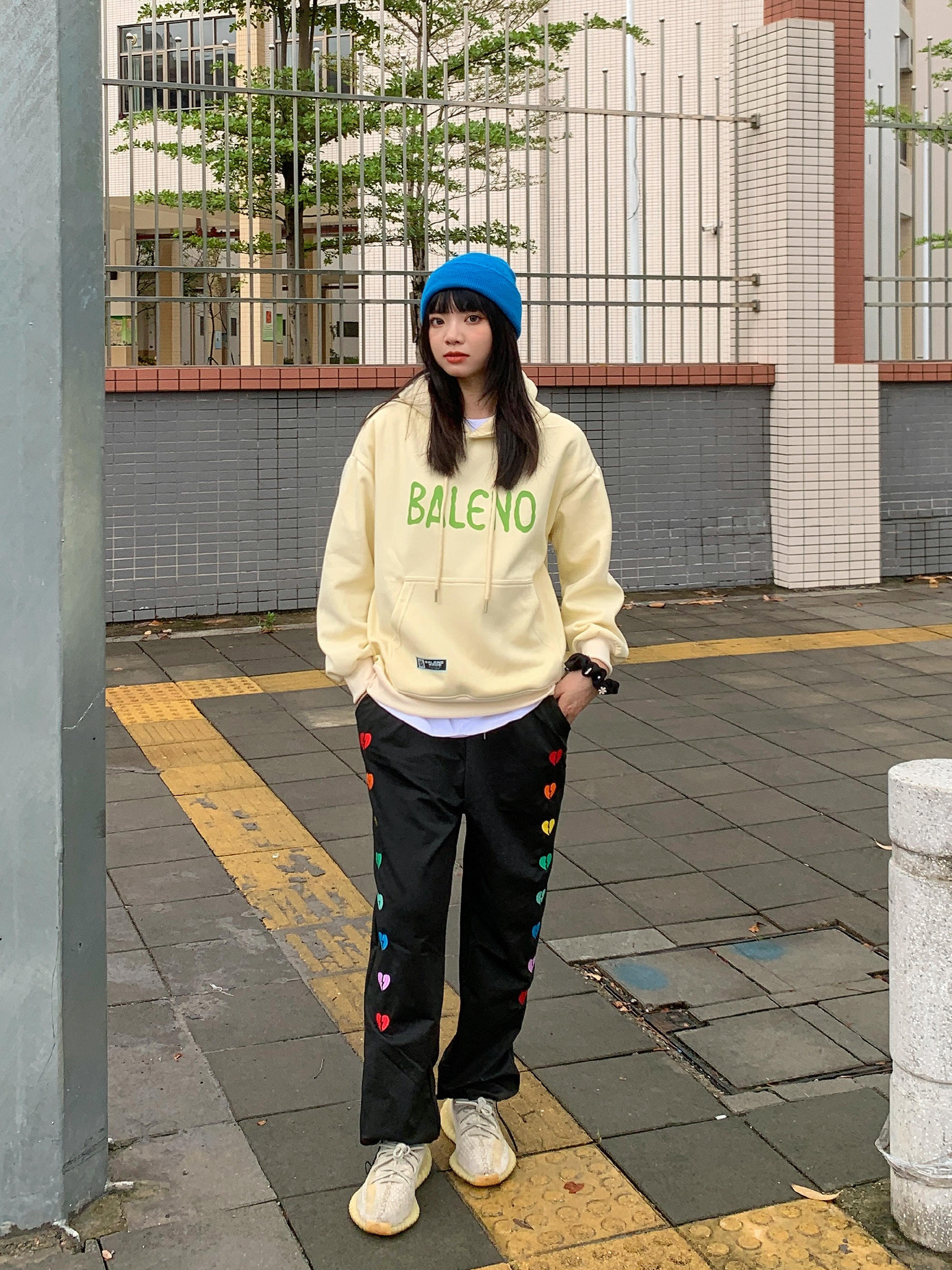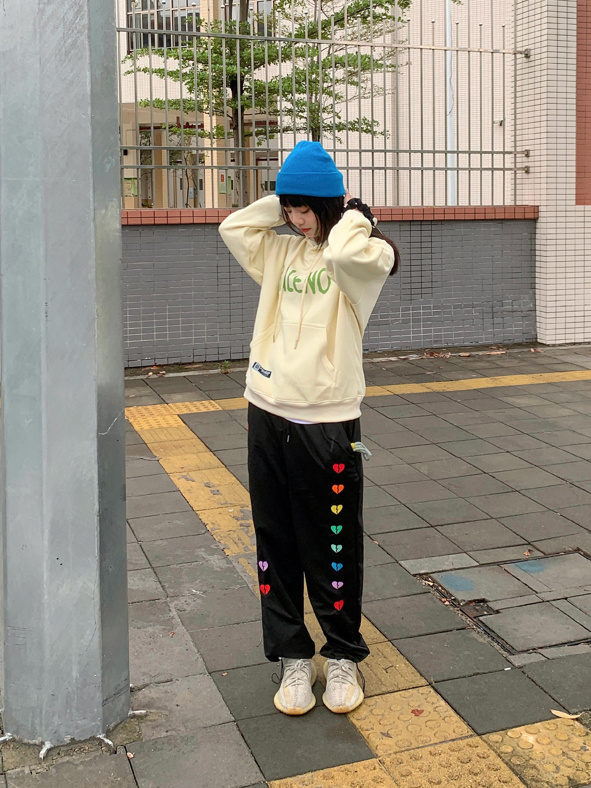 初秋第一件卫衣 大logo的图案设计特别亮眼 内衬件白t穿出层次感 再搭个亮色的配色就很加分了 蓝色的针织帽给整体穿搭增添了色彩