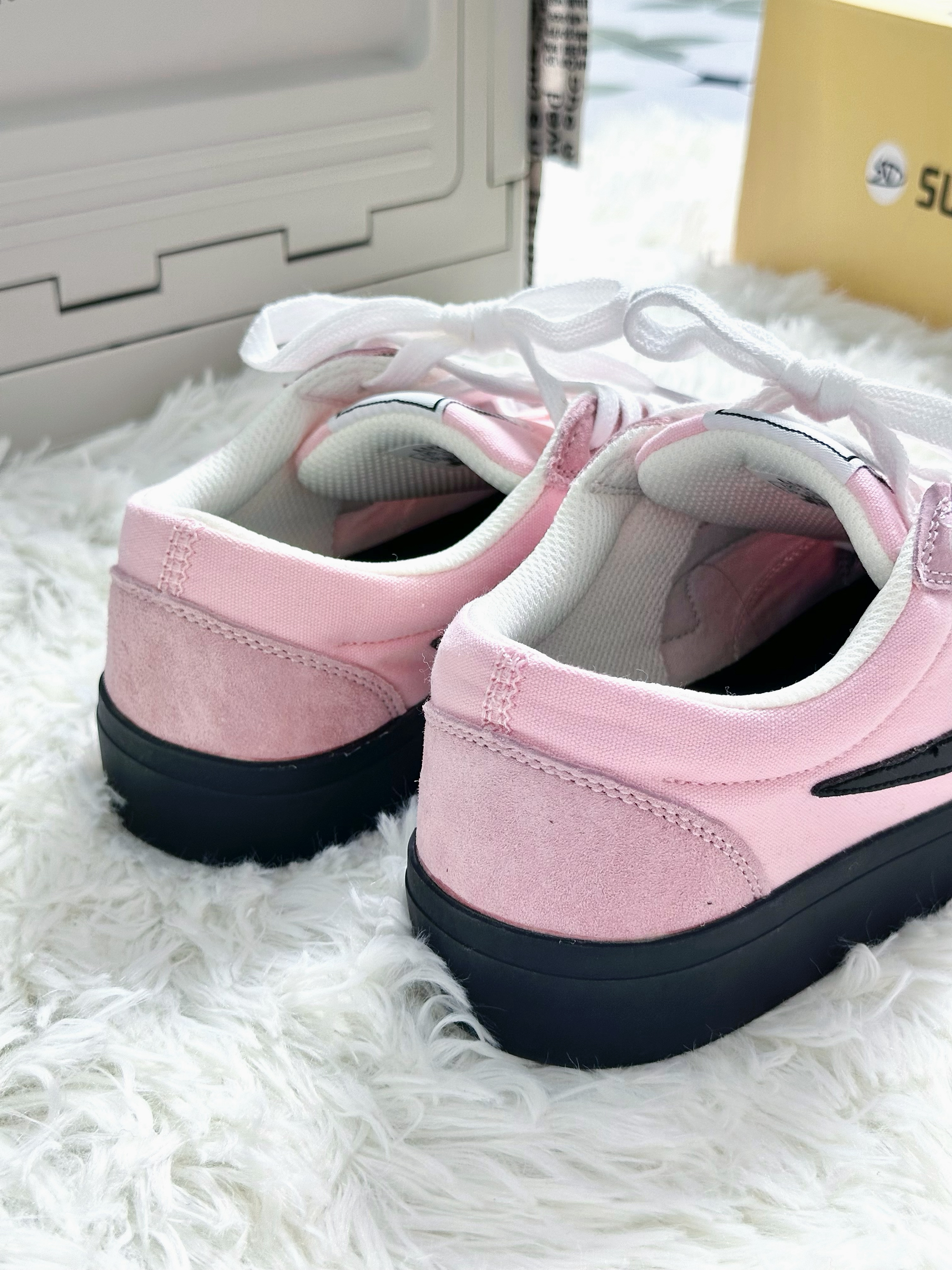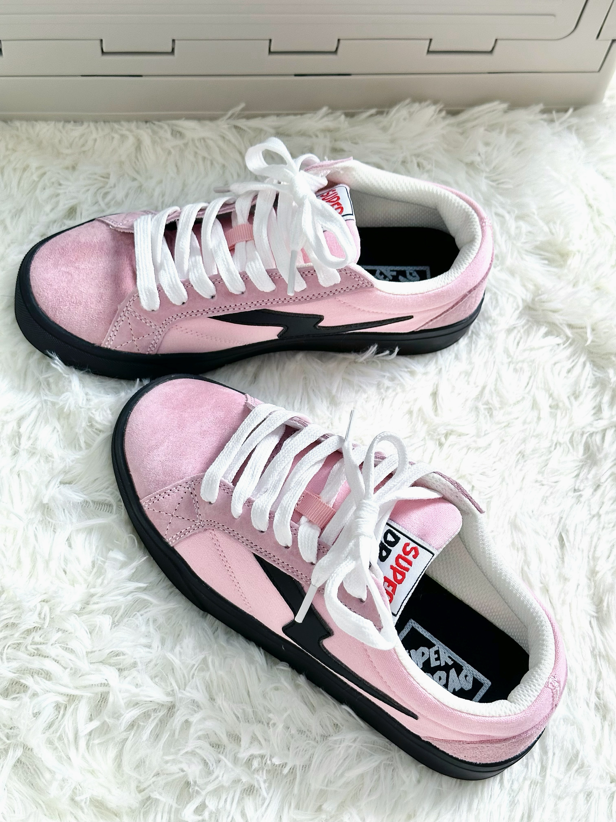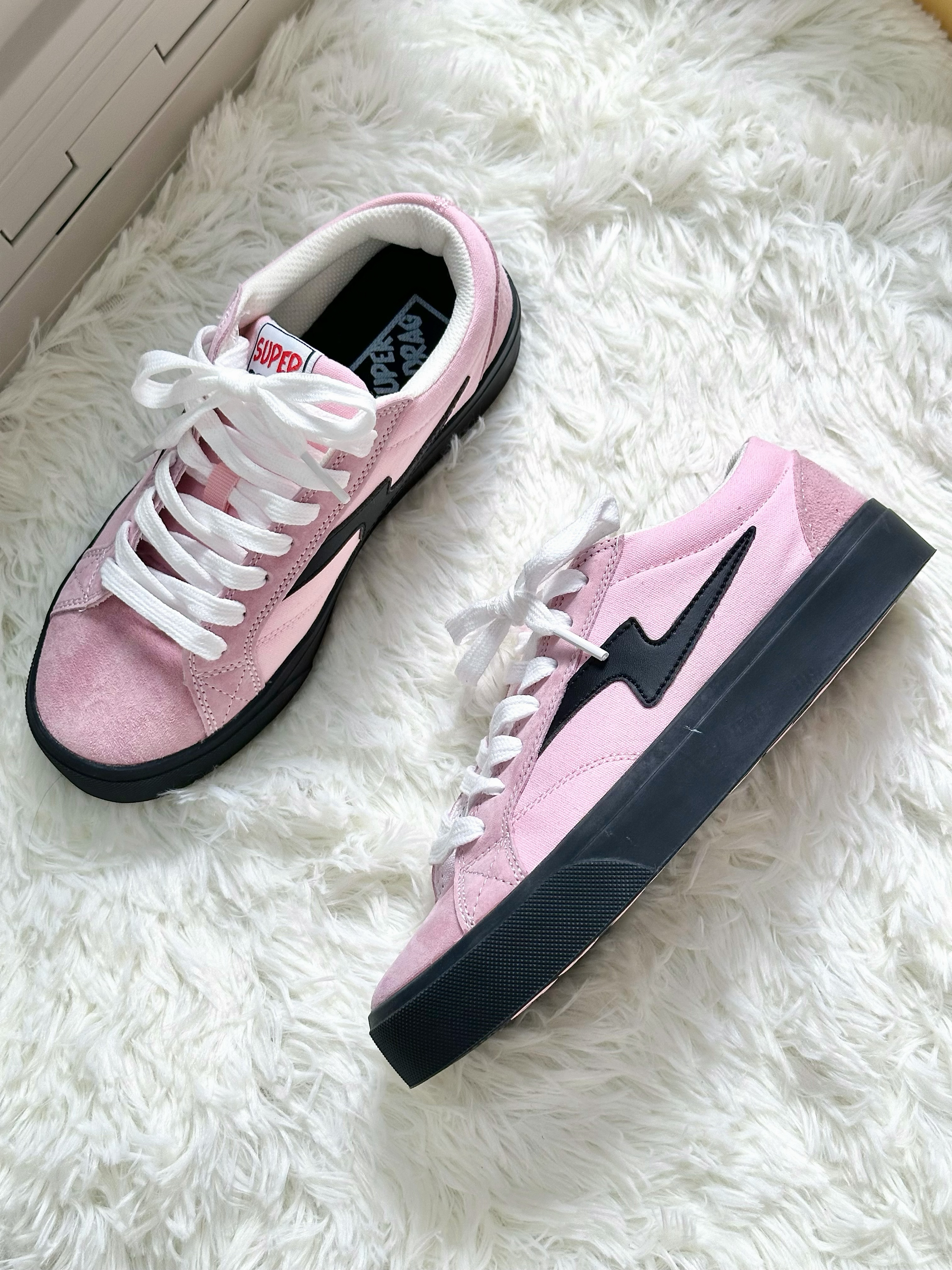 Super Drag ‼️超拽 黑粉配色也是可甜可酷的配色 鞋面软乎乎的🍞 鞋底本来穿着两边小脚趾有一点硬硬的感觉 😝第二次穿就没有了 这个配色的小板鞋还挺百搭的 甜系🍭盐系🕶️都会搭出不一样的感觉