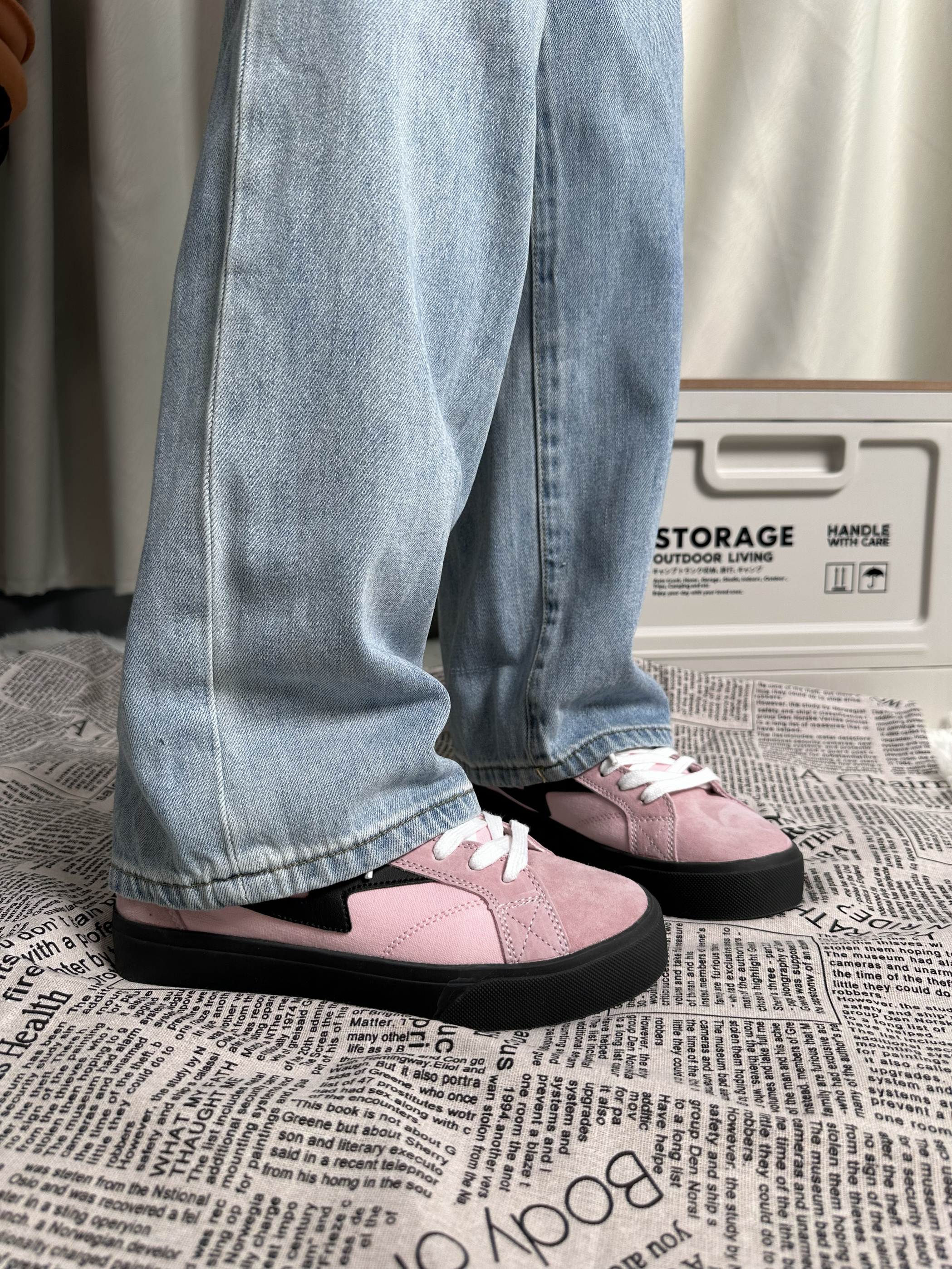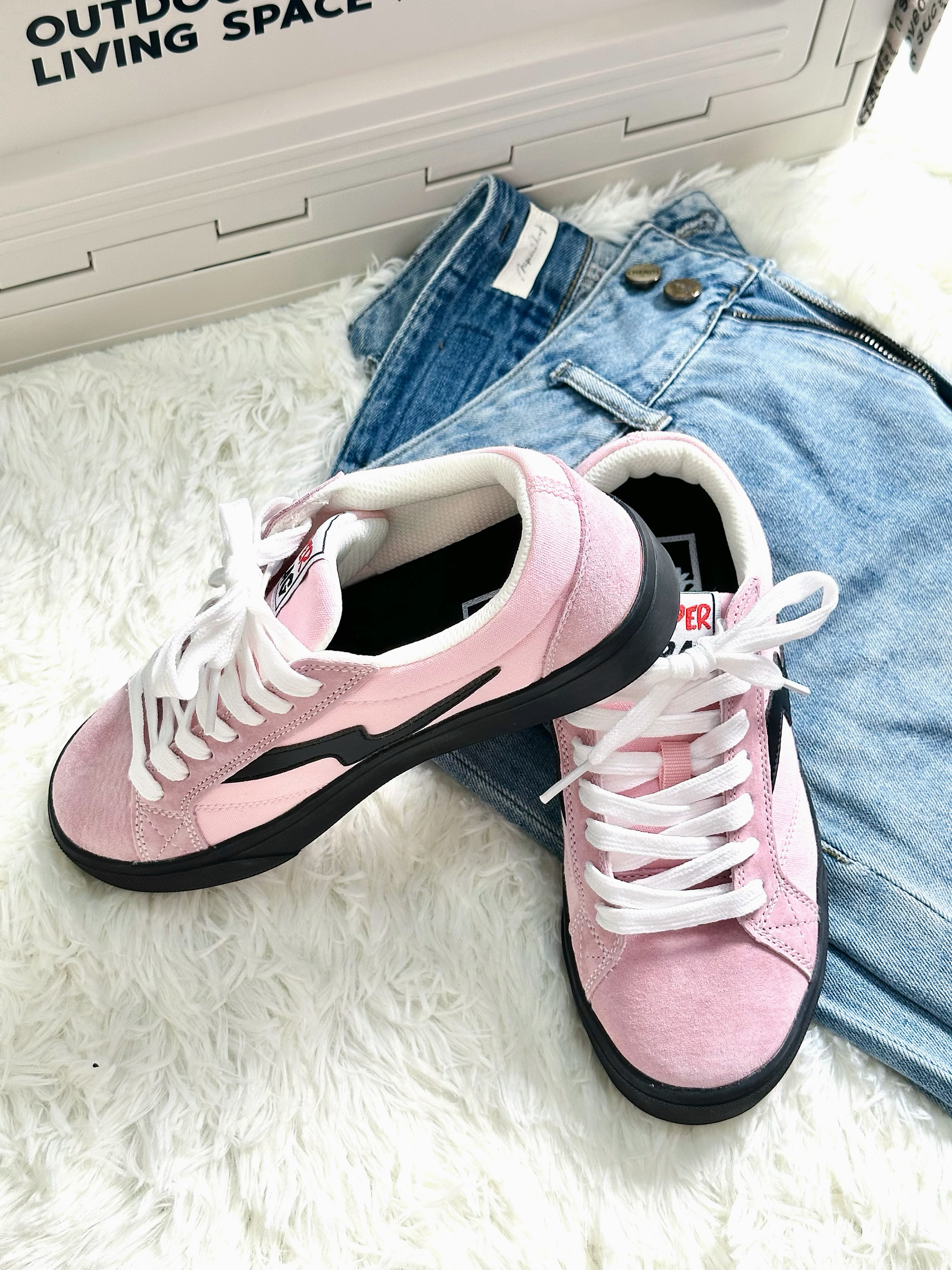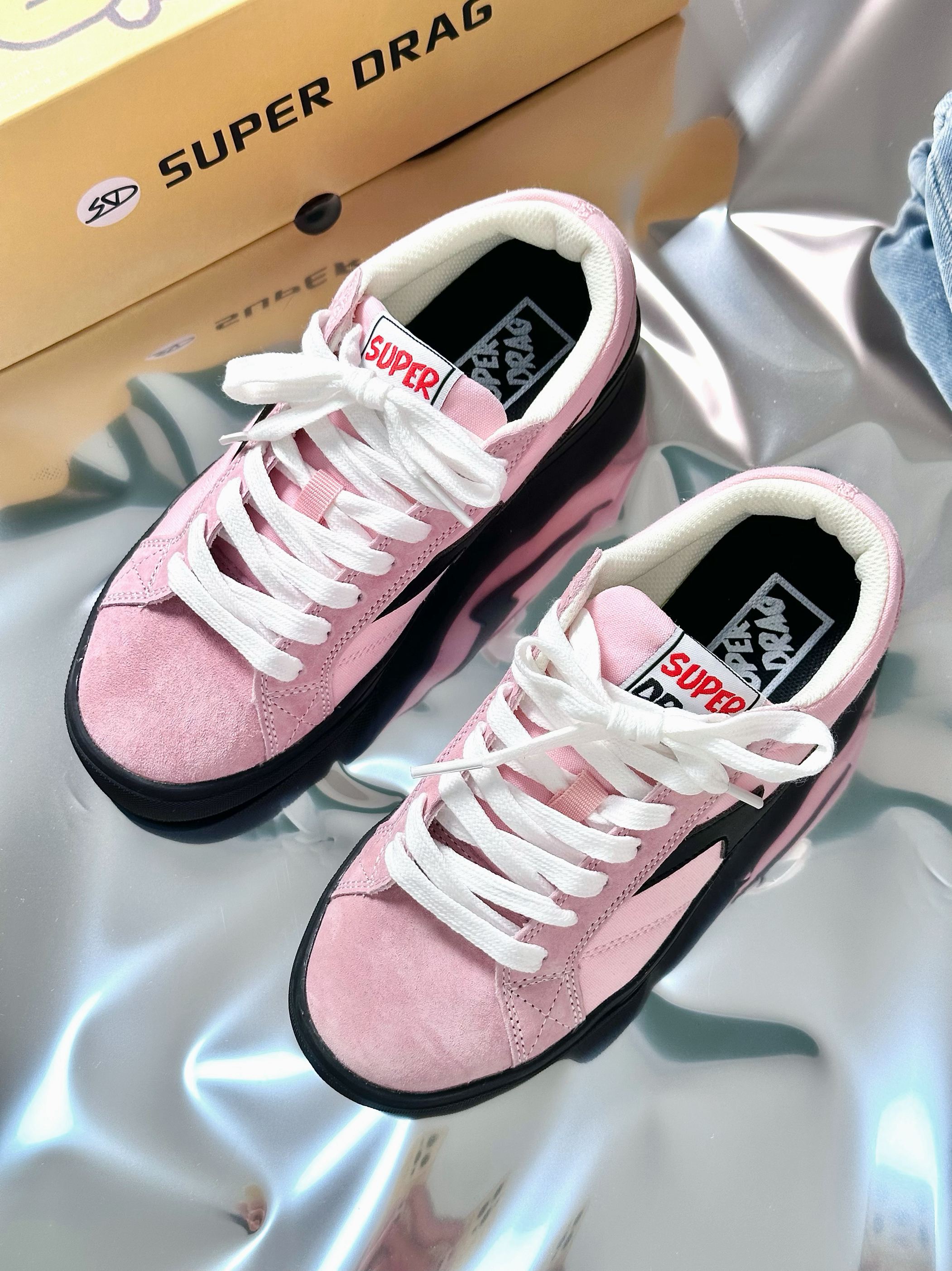 Super Drag ‼️超拽 黑粉配色也是可甜可酷的配色 鞋面软乎乎的🍞 鞋底本来穿着两边小脚趾有一点硬硬的感觉 😝第二次穿就没有了 这个配色的小板鞋还挺百搭的 甜系🍭盐系🕶️都会搭出不一样的感觉