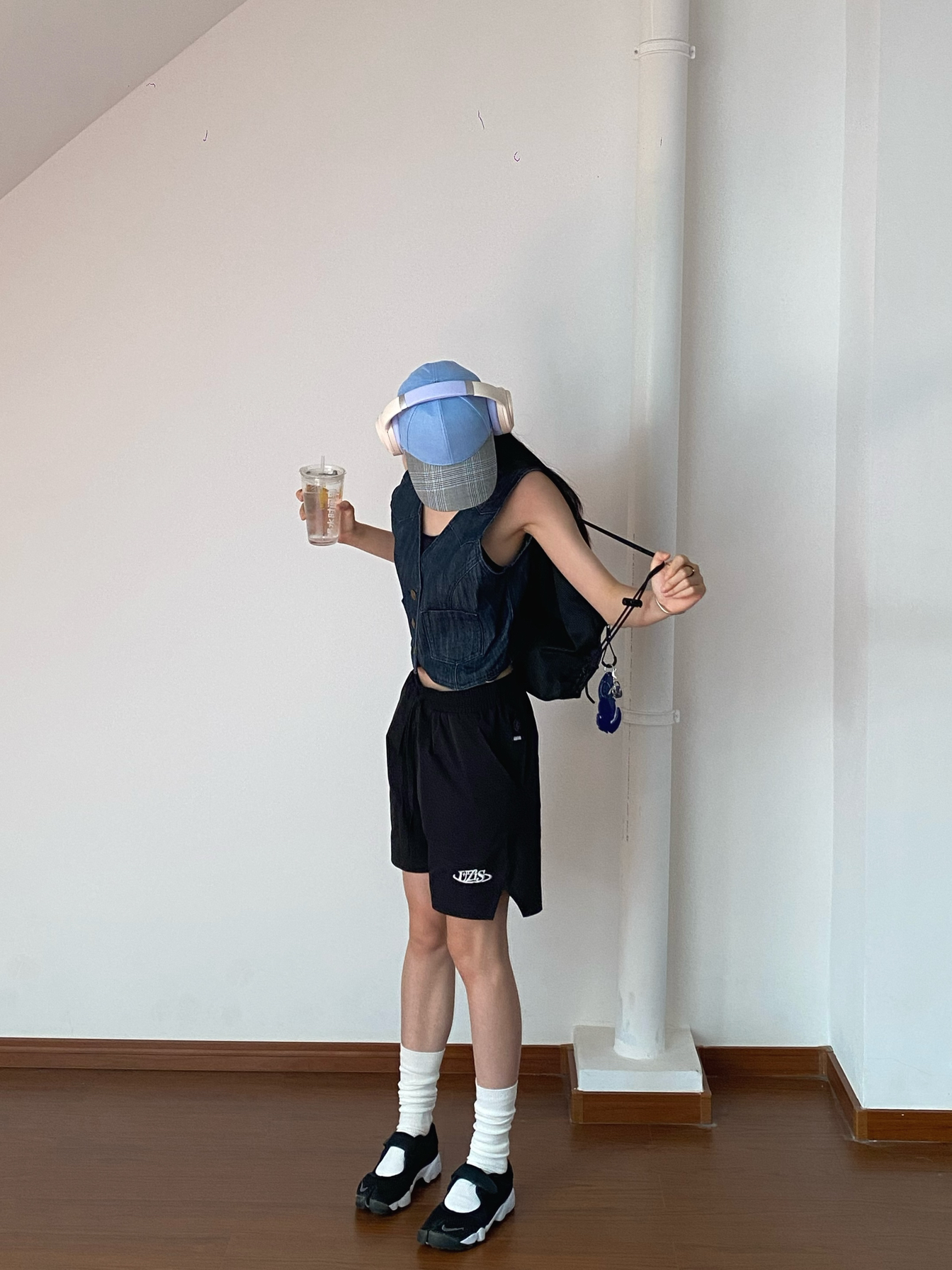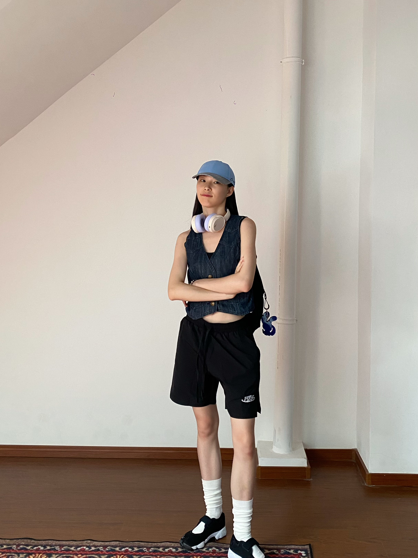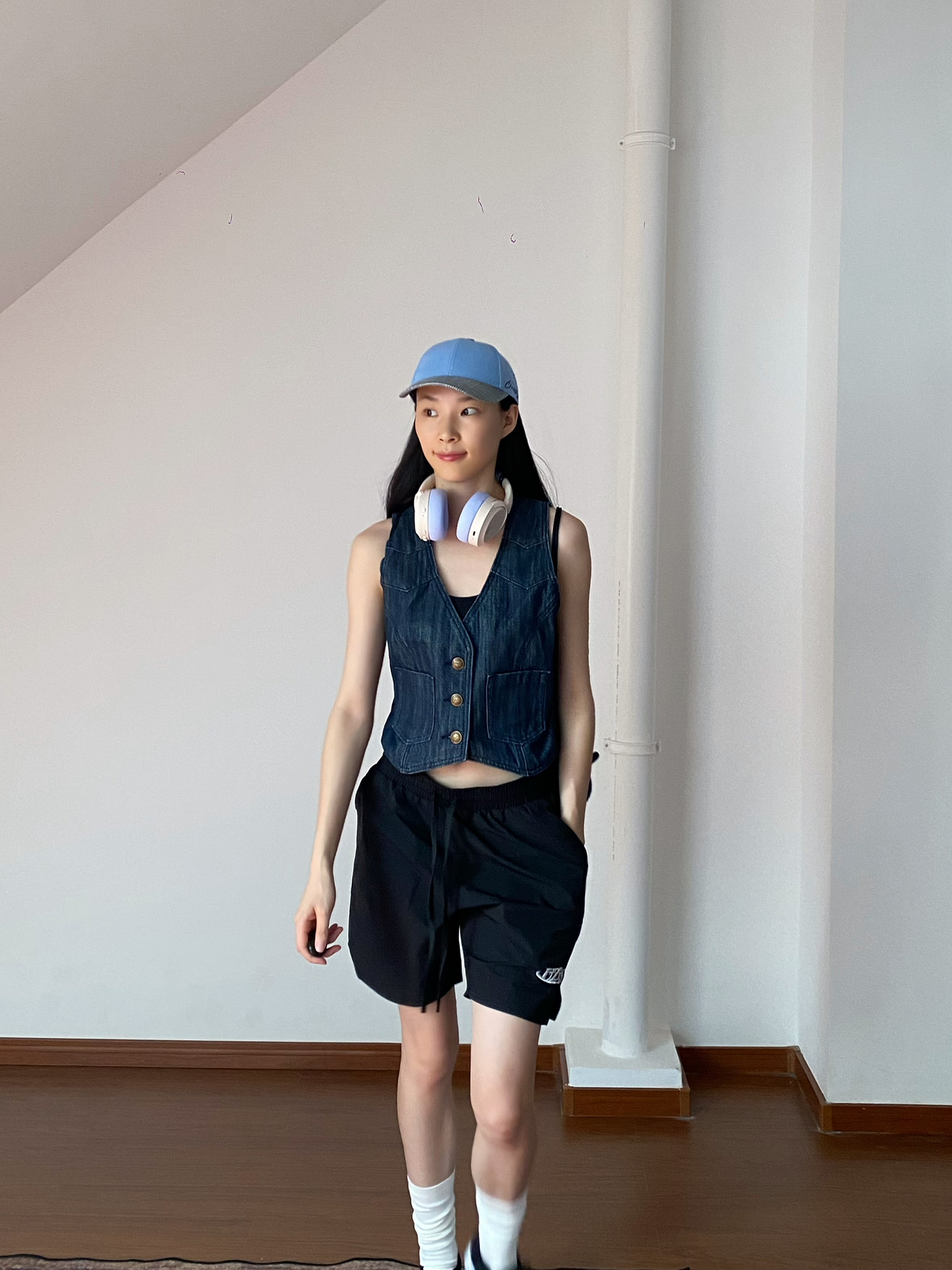 偏休闲的一条速干运动裤. 拿来跟我的马甲, 居然还能碰撞出这么和谐的look. 再搭配上亮色🧢 有一股ins博主味儿. 速干透气的面料, 很适合出门旅游的时候穿, 方便又好看🤨 裤边分叉不会束缚动作,还显瘦.