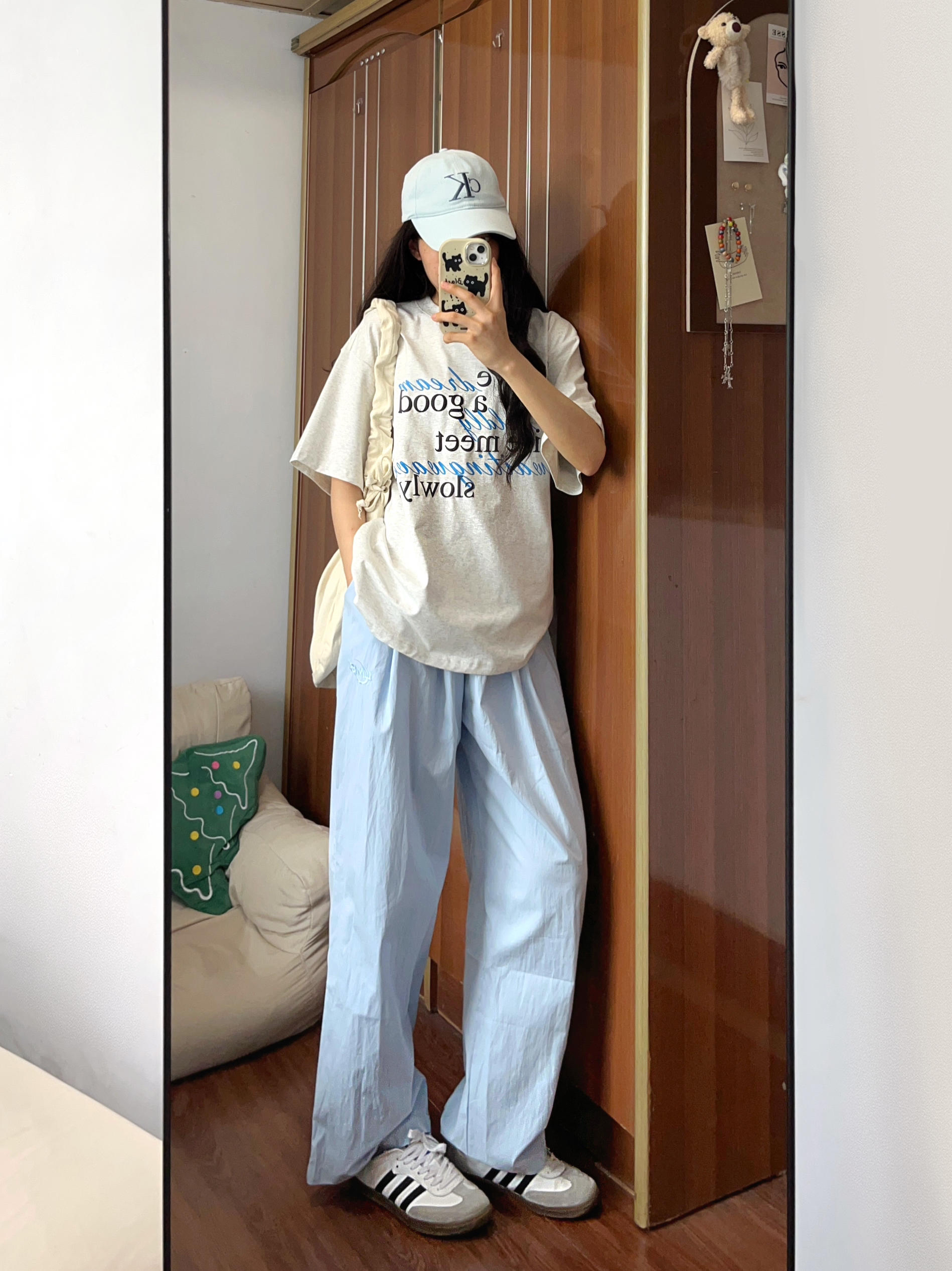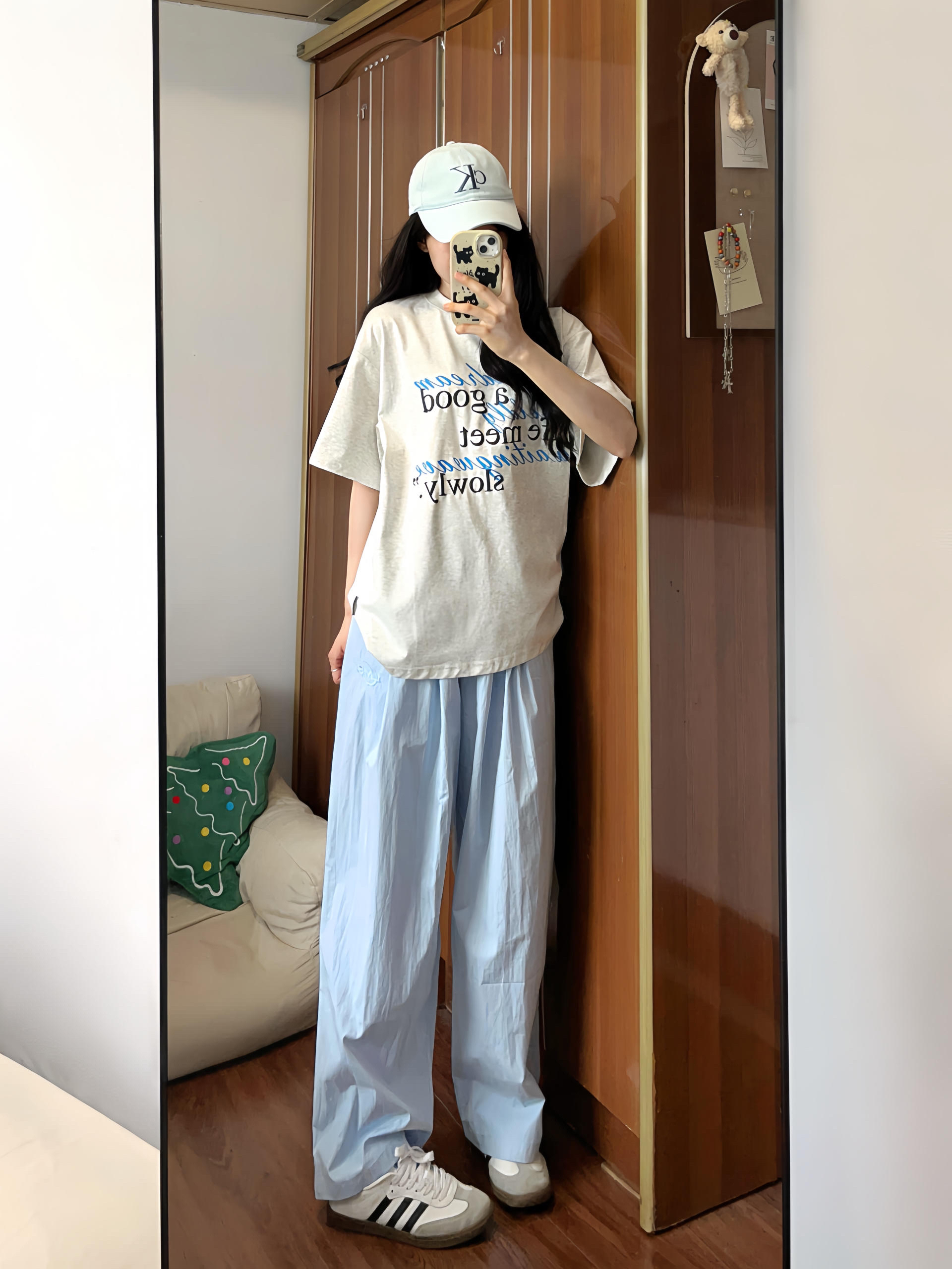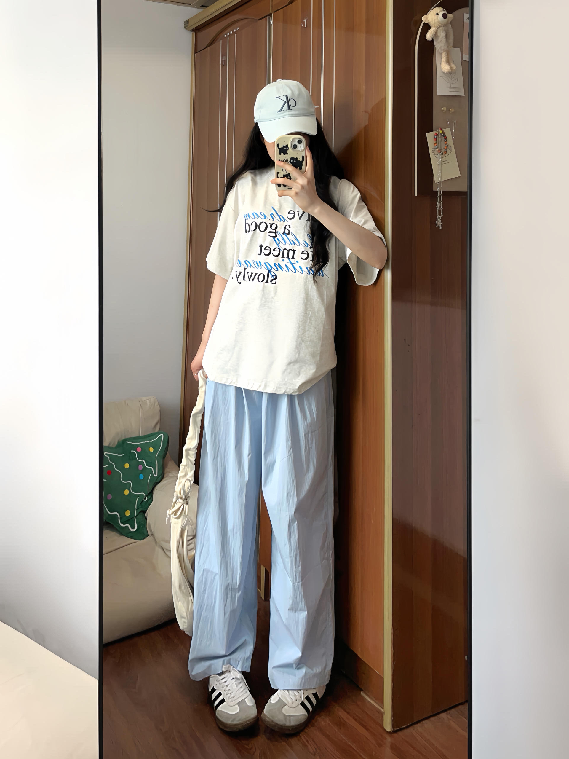 今日穿搭分享~ 白T➕冰蓝色裤子好好看! 版型宽松 上身破松弛感十足 夏日这样穿 给视觉降降温叭~