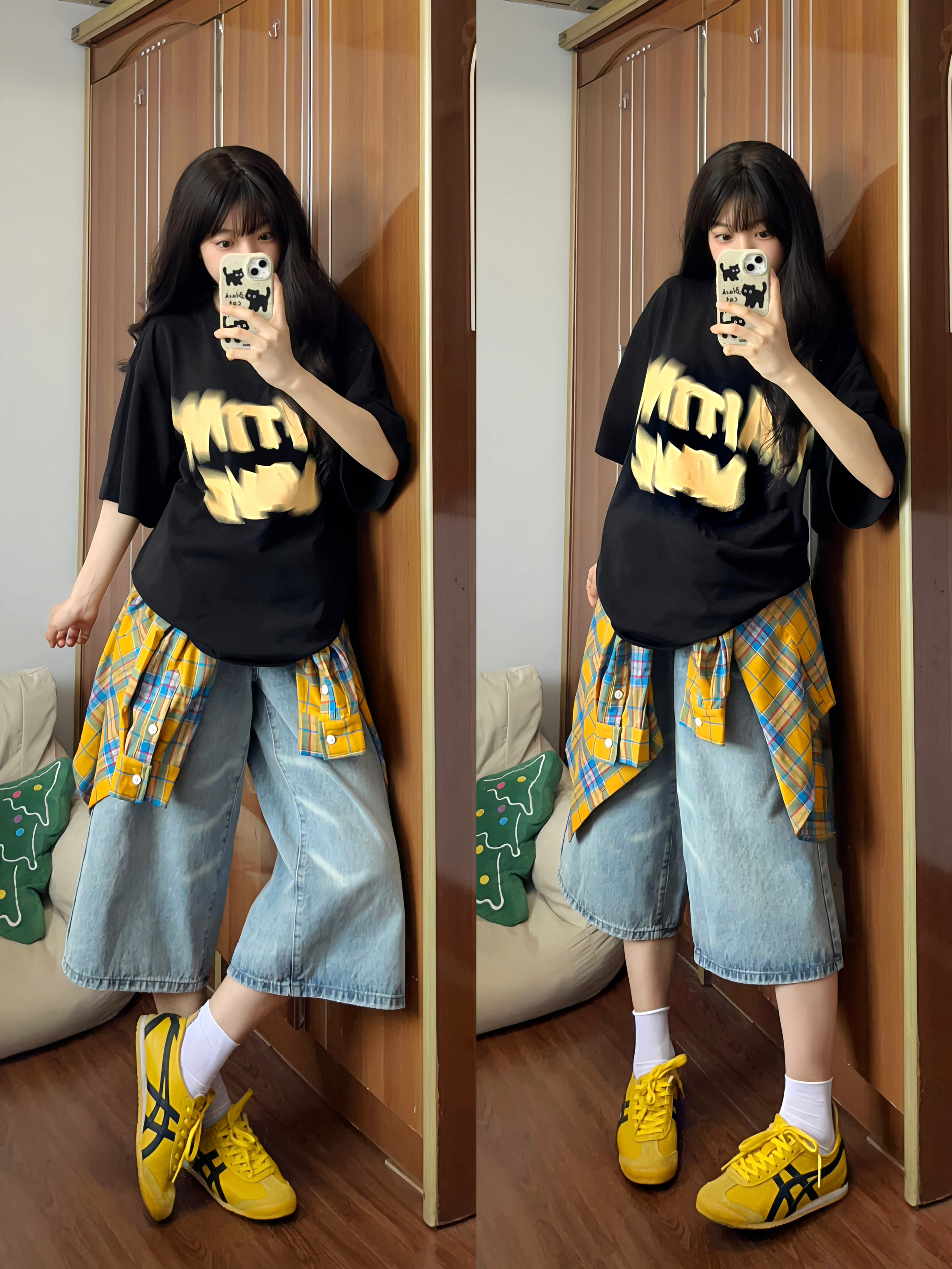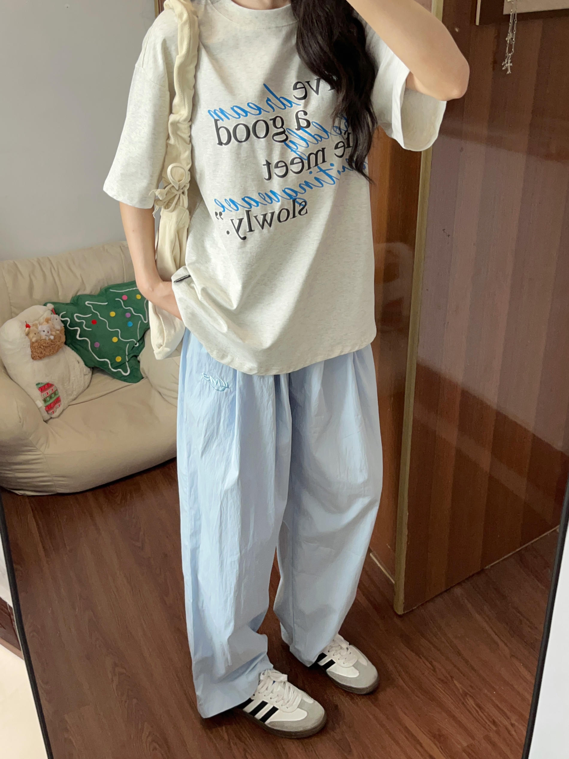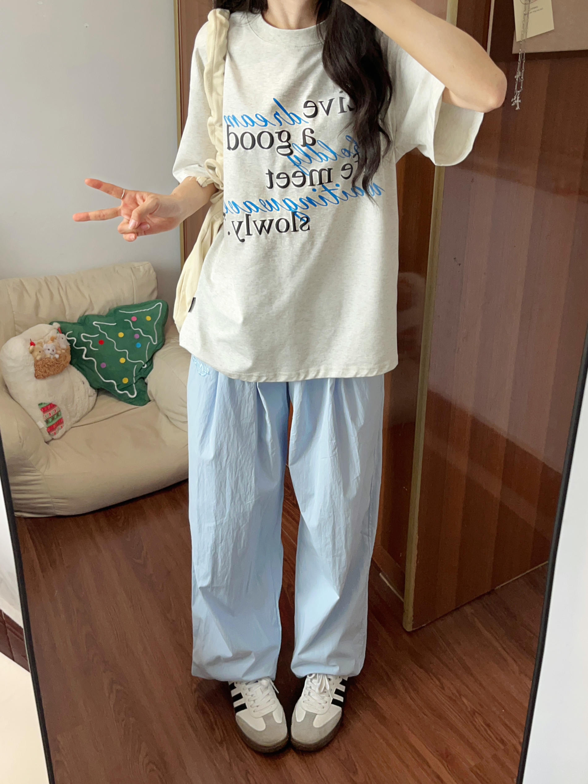 今日穿搭分享~ 白T➕冰蓝色裤子好好看! 版型宽松 上身破松弛感十足 夏日这样穿 给视觉降降温叭~