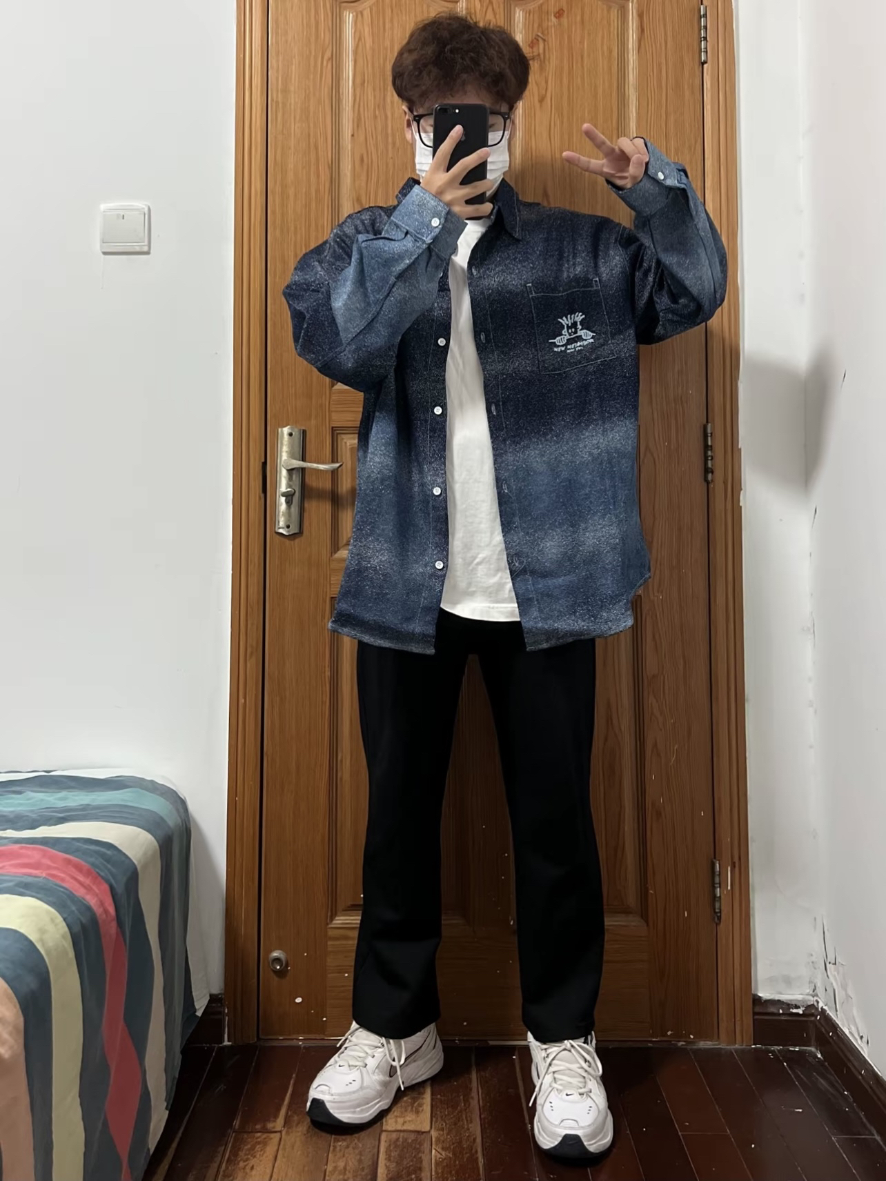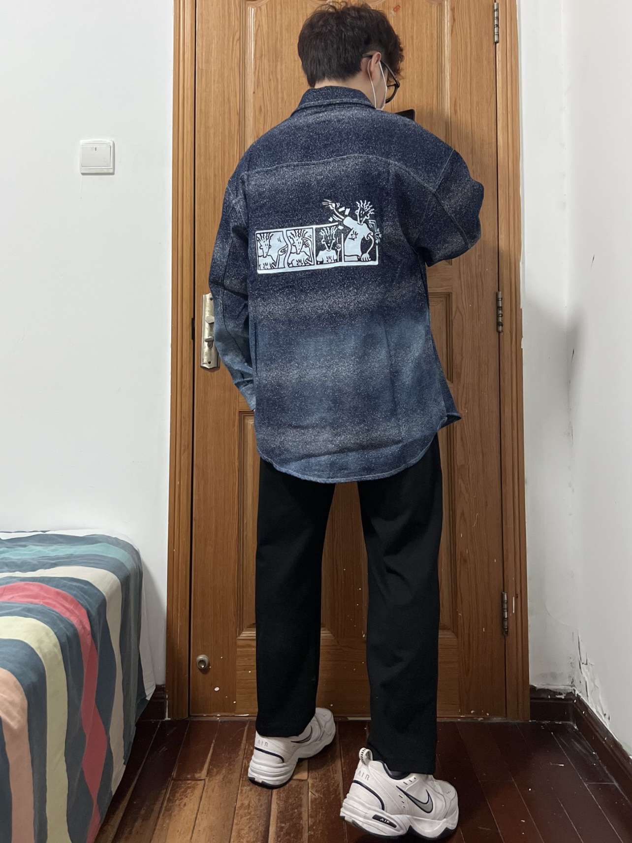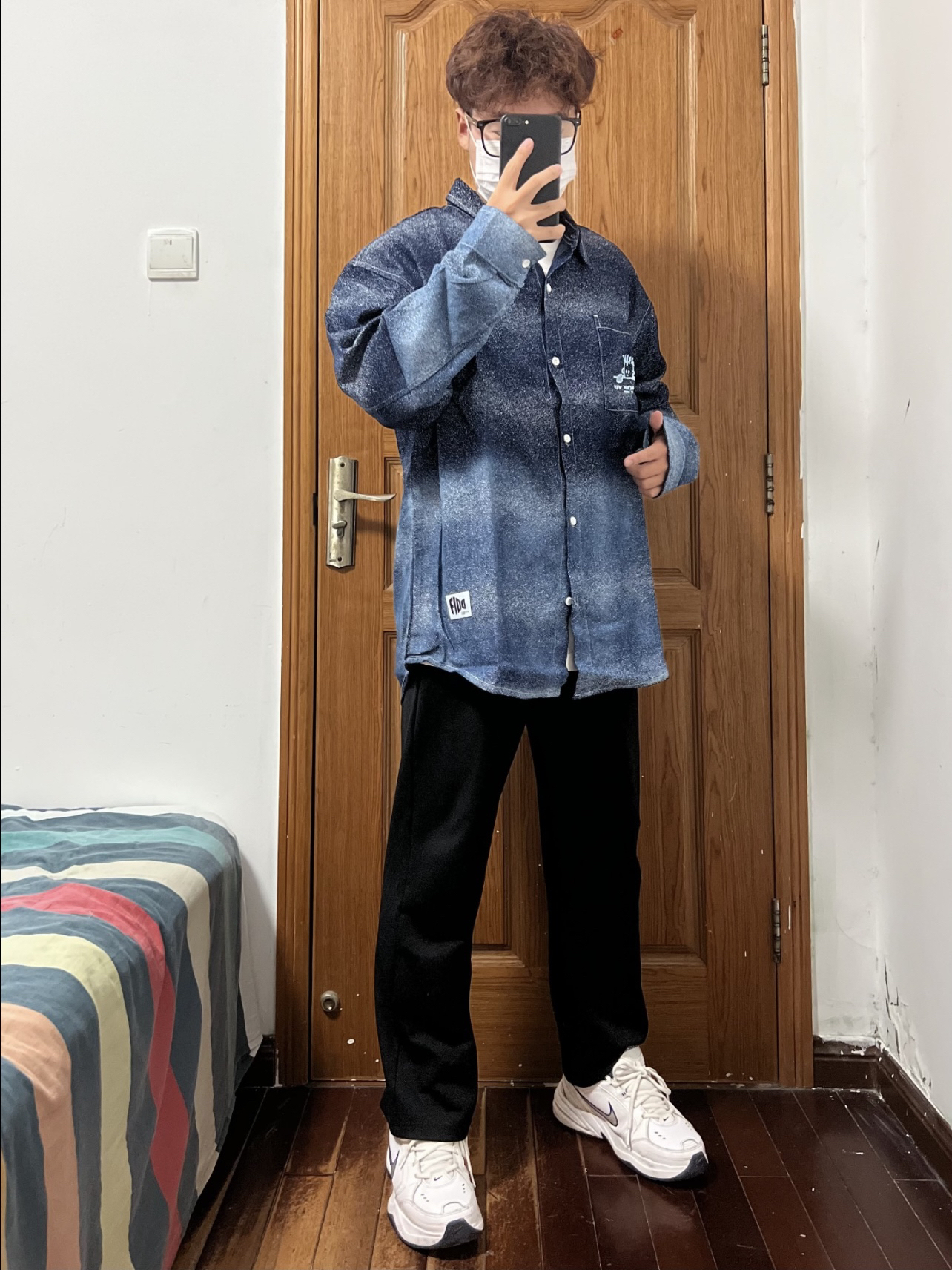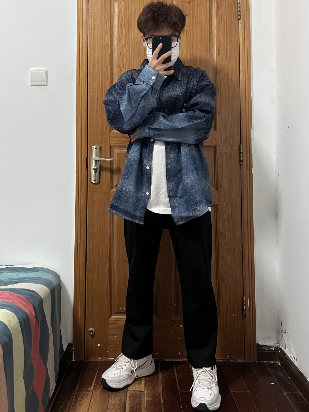 上衣是一件 FIDO DIDO 的星空衬衫外套 渐变的星空蓝真的很好看啊关键显帅 正面小口袋➕logo印花背后也是大图案 面料适中不是很厚早秋穿完全OK 版型尽量选大一码显瘦的根本没有道理 内搭一件白色短袖就可以很好穿搭 裤子就听我的选黑色长裤够简单 最后搭配一双小白鞋 👔 FIDO DIDO 👖 黑色长裤 👟 Nike 🙋♂️ 170/120斤 2XL