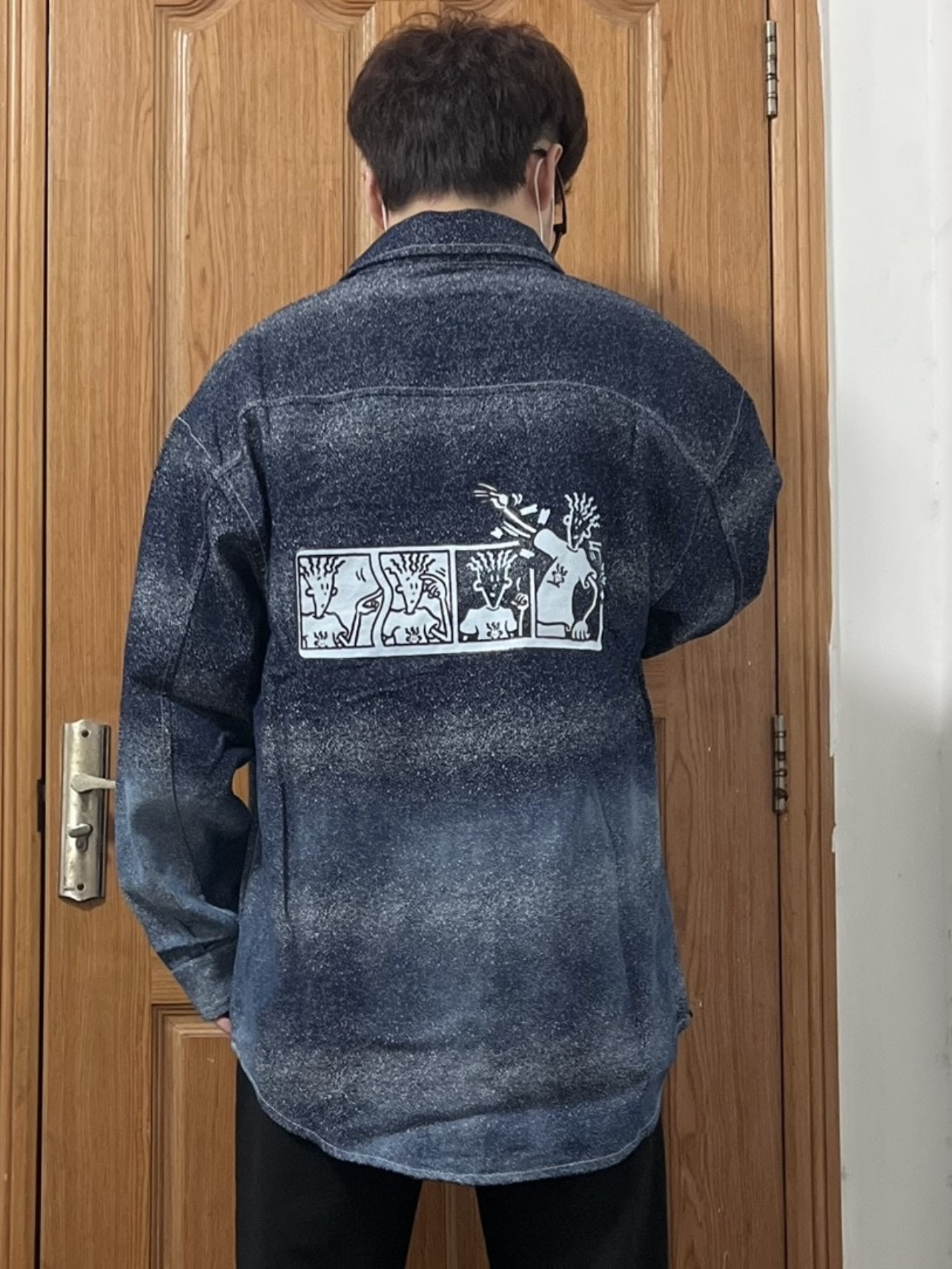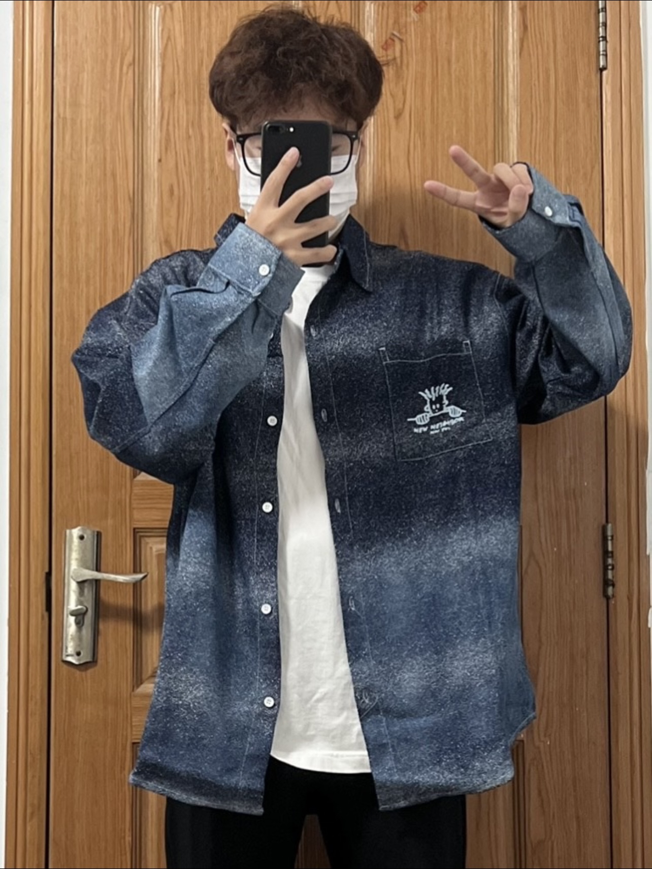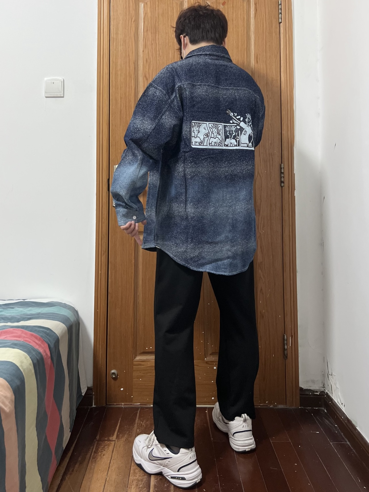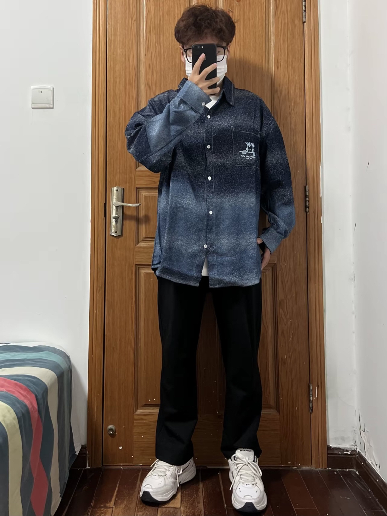 上衣是一件 FIDO DIDO 的星空衬衫外套 渐变的星空蓝真的很好看啊关键显帅 正面小口袋➕logo印花背后也是大图案 面料适中不是很厚早秋穿完全OK 版型尽量选大一码显瘦的根本没有道理 内搭一件白色短袖就可以很好穿搭 裤子就听我的选黑色长裤够简单 最后搭配一双小白鞋 👔 FIDO DIDO 👖 黑色长裤 👟 Nike 🙋♂️ 170/120斤 2XL