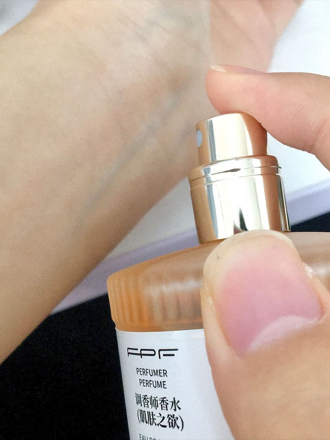 就是FPF家的这款肌肤之欲香水啦 外观是很有质感的磨砂质地 是一款花香调淡香,但是留香时间蛮长的 甜而不腻,略有点痱子粉香,是让人很想靠近的伪体香 前调:茉莉 中调:棉花 后调:麝香 可以喷到手腕、耳后、发尾或脚踝上