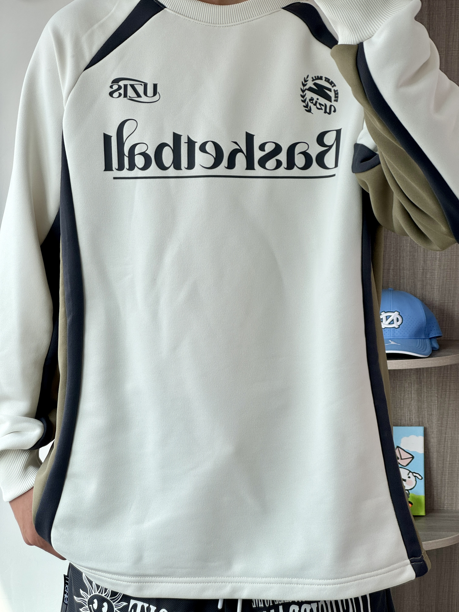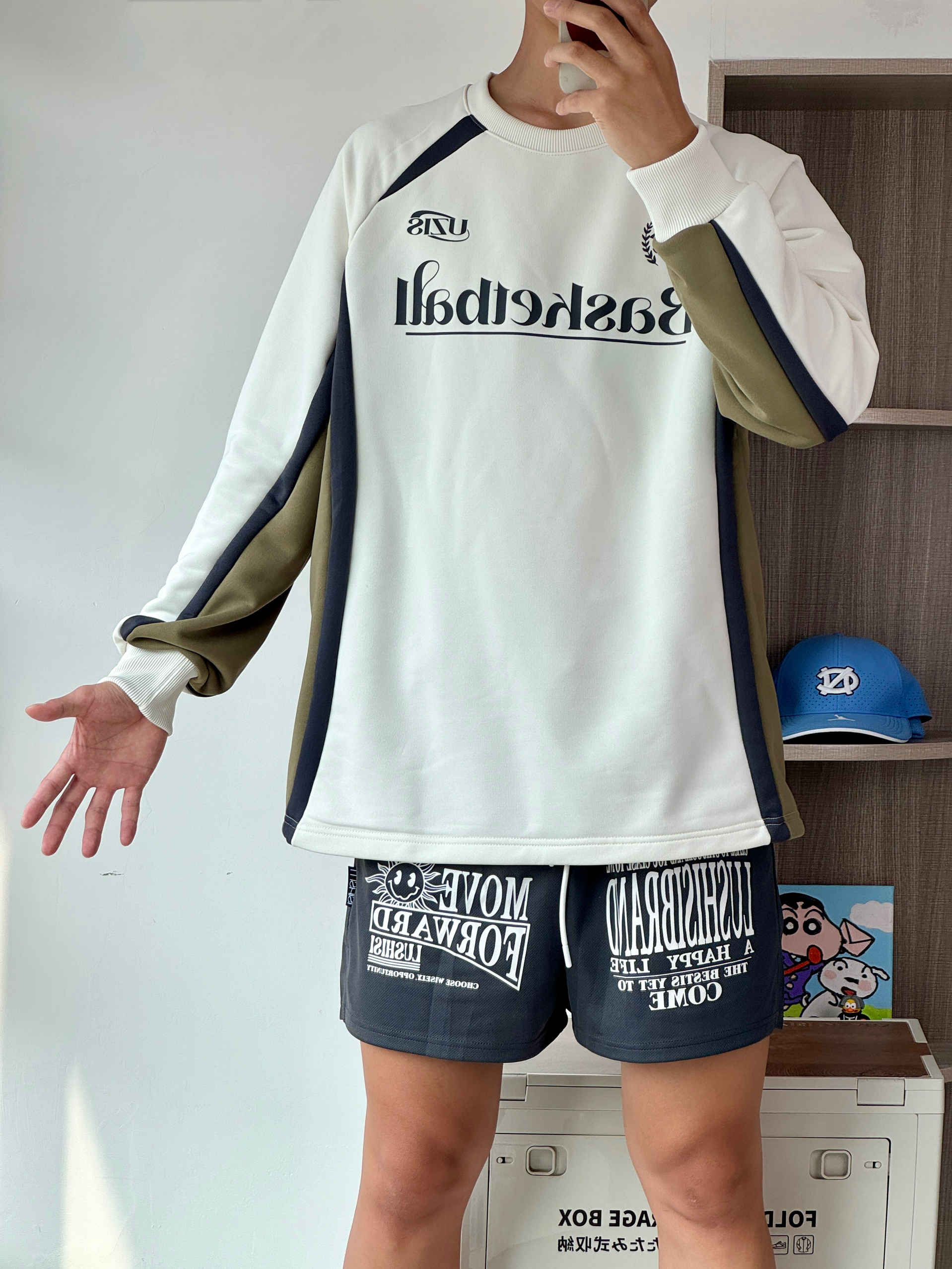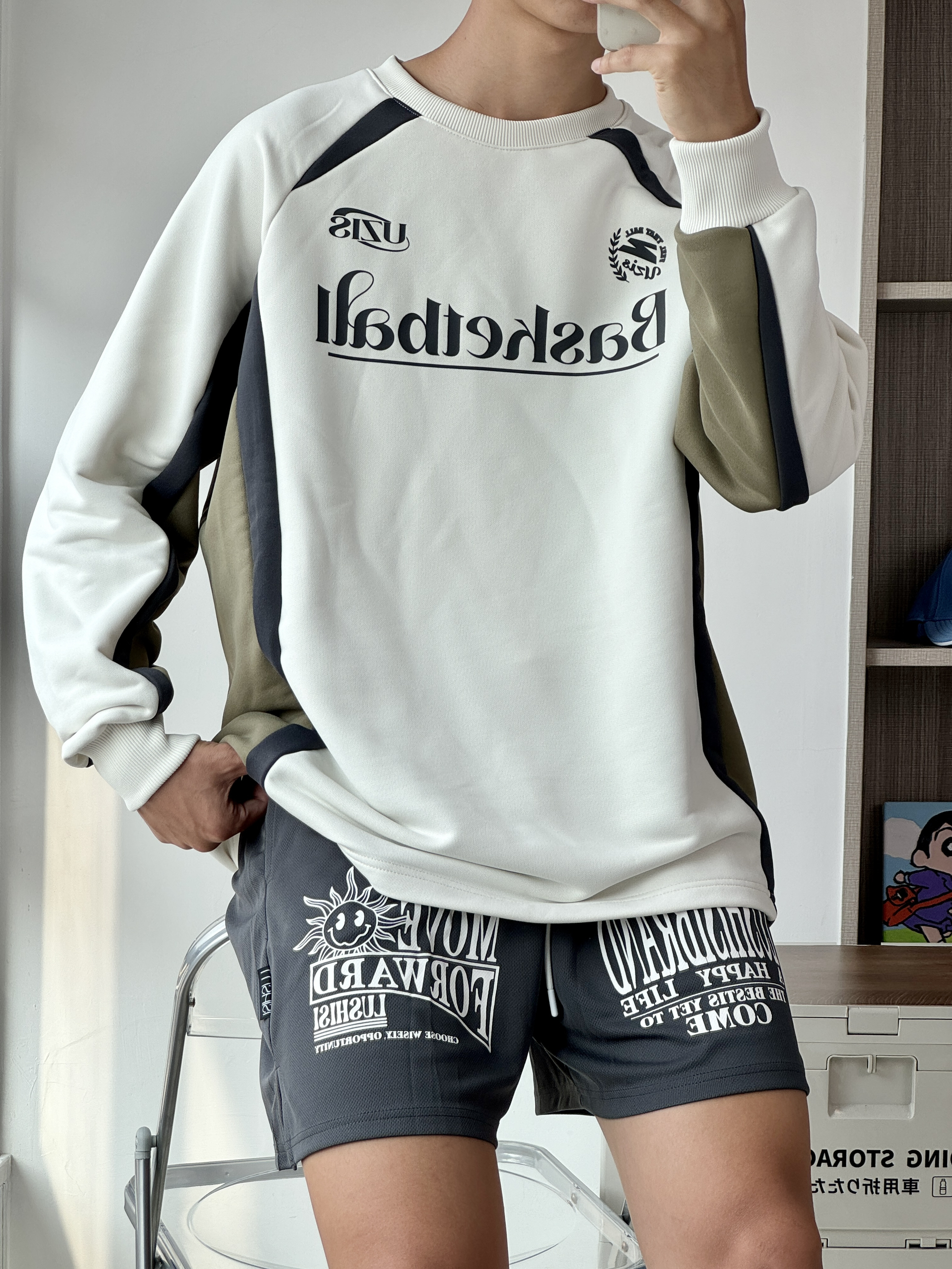 oi又到了长袖配短裤的季节爱运动的男生穿这套美式穿搭不会出错噢 👔一件浅杏色百搭又好看胸口的美式印花和侧面的拼接设计非常的复古 🩳搭配一条灰黑色短裤满满的美式感很帅7 👟 book1日常穿搭和打球都能驾驭的篮球鞋