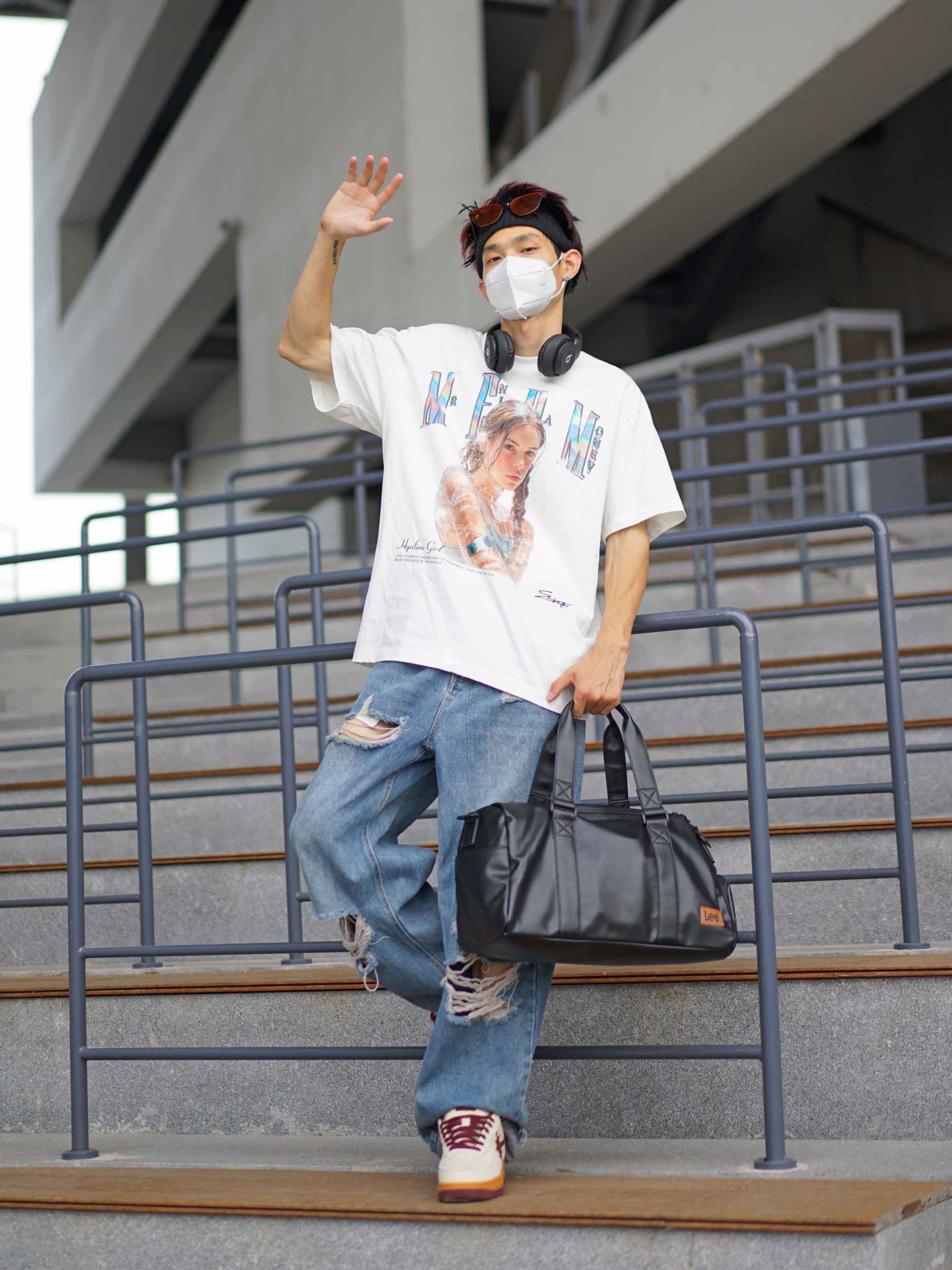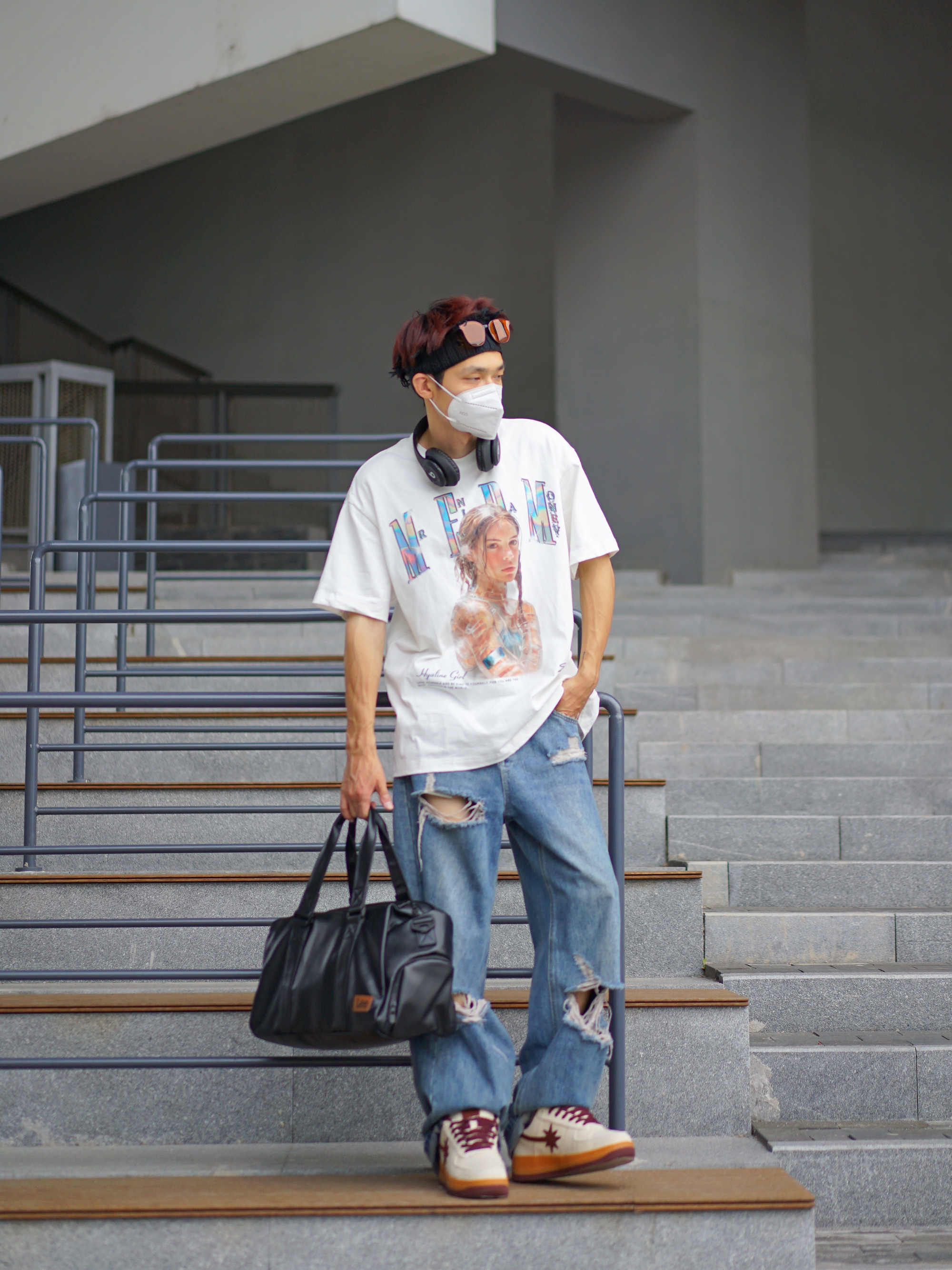 又到开学季了 夏末初秋穿搭来啦 今天出门主打一个松弛感 上身美式人像印花T恤 搭配一条破洞牛仔裤 这一套是白蓝配色为主 视觉上还是挺醒目的 出门挎上咱的皮质手提包 是我要的松弛感