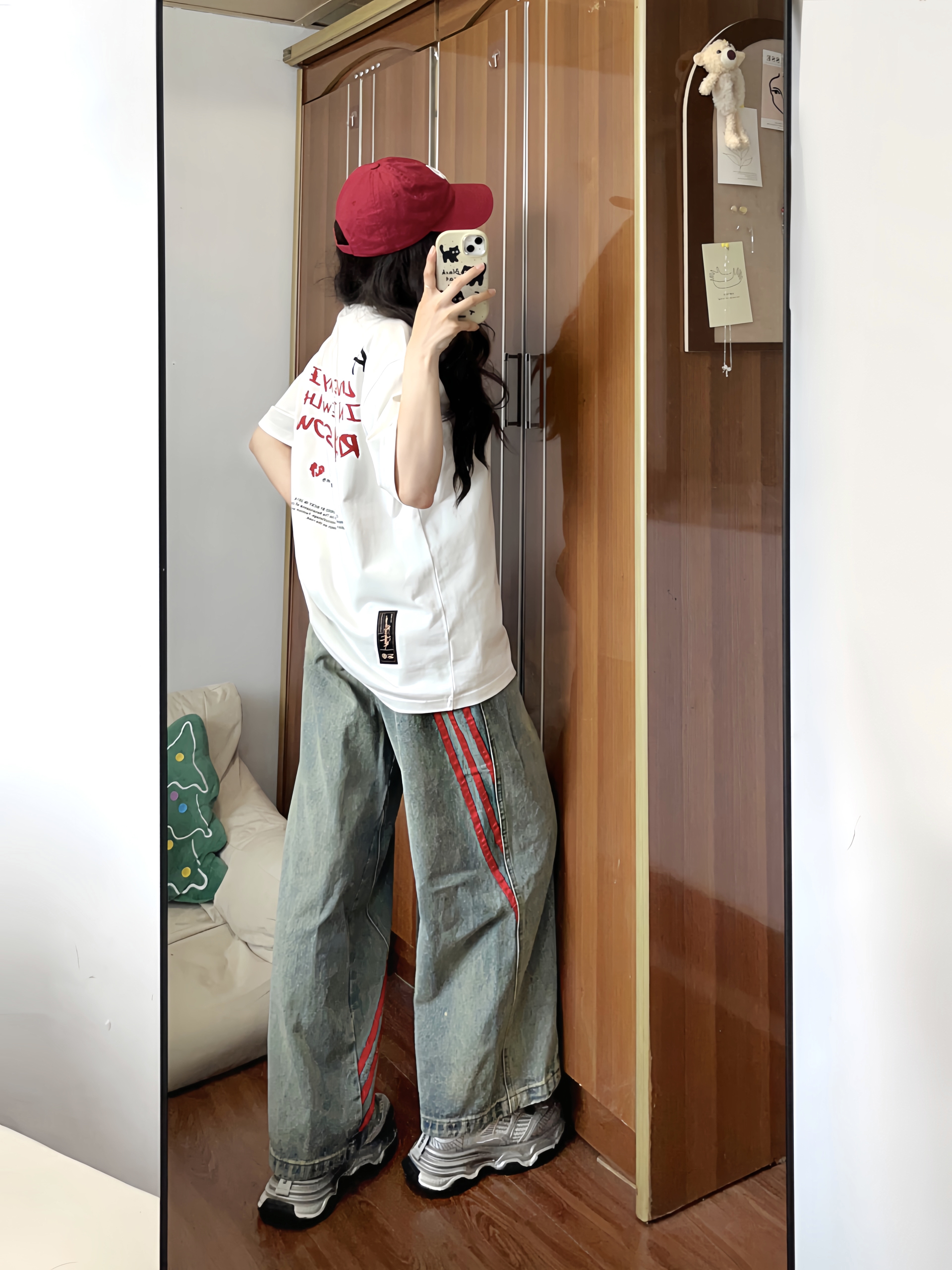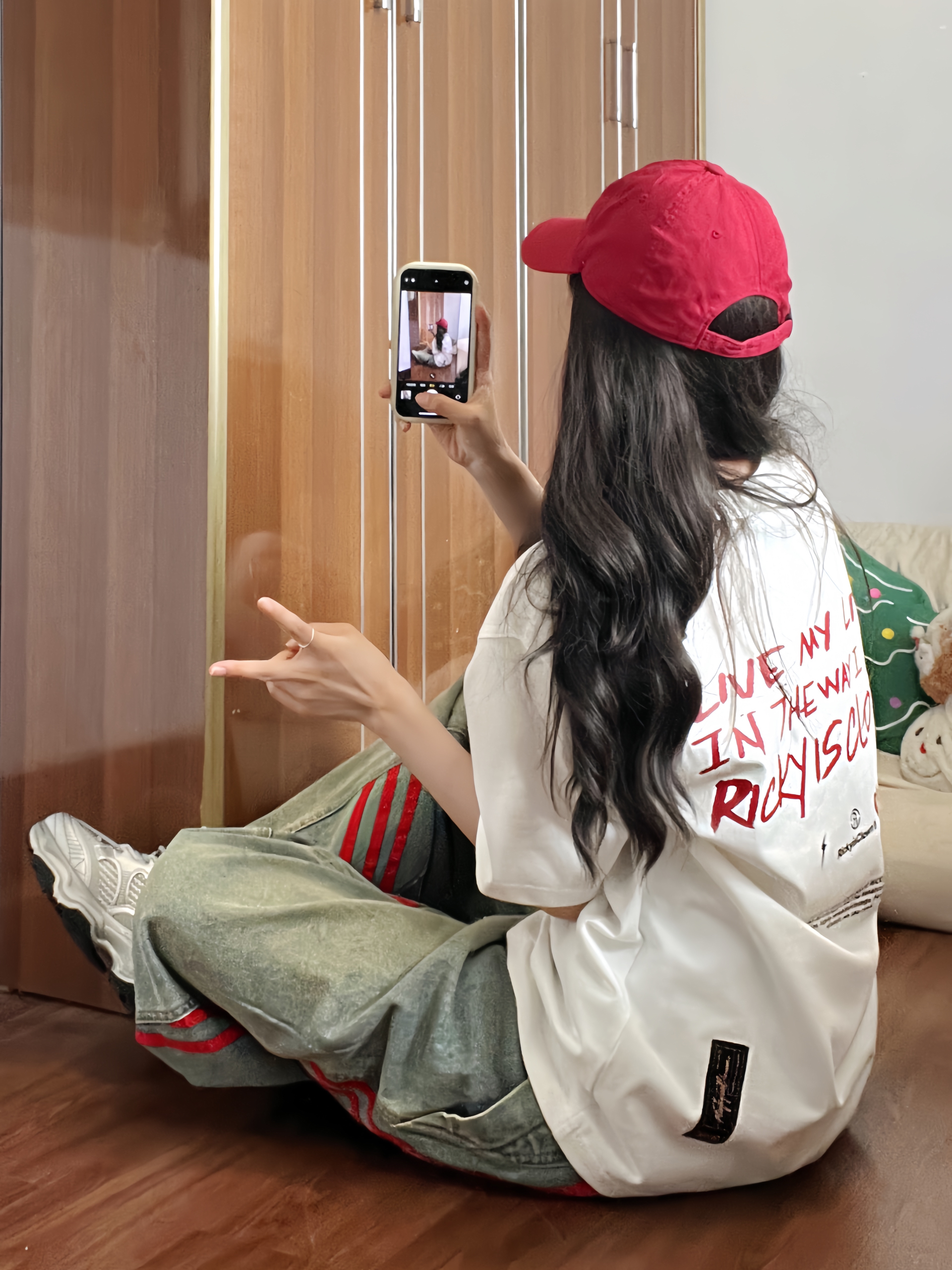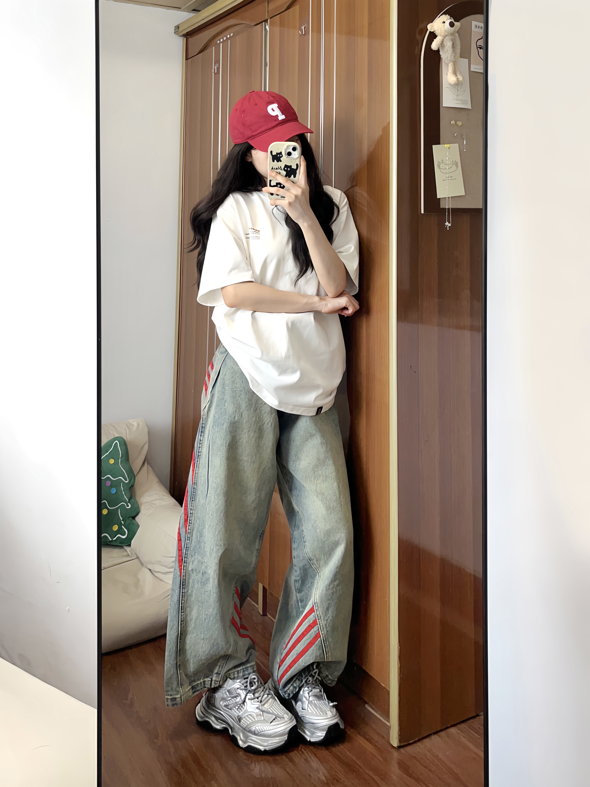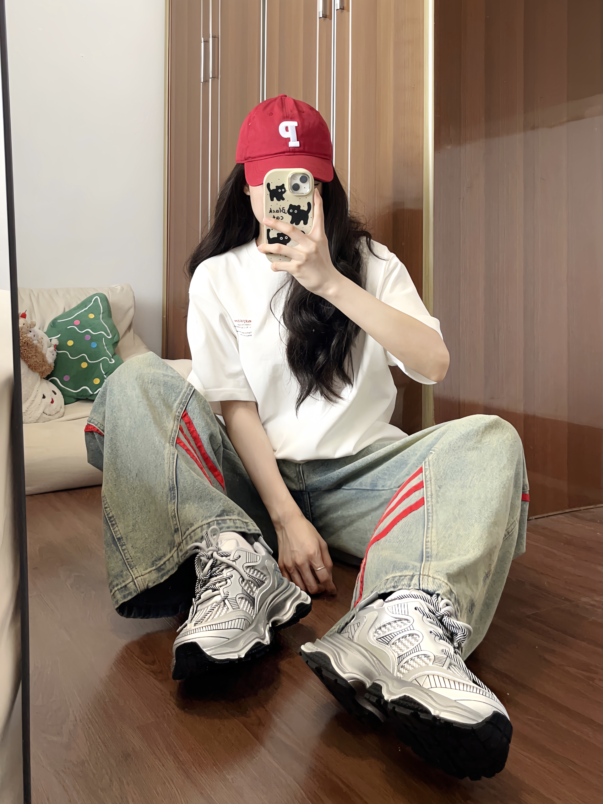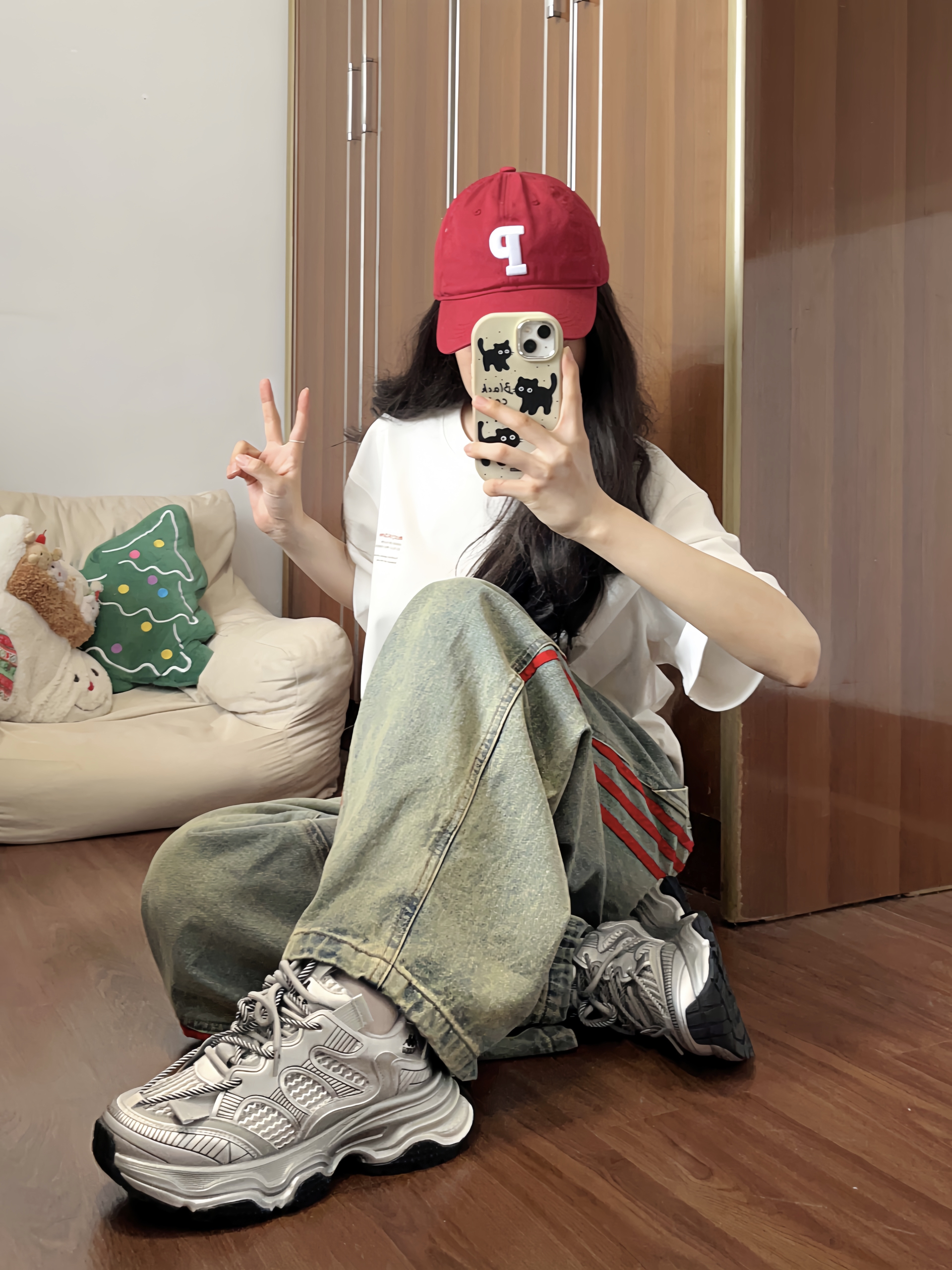 今日穿搭分享~ 夏天当然少不了百搭白了💭 今日上身这件T恤背后字母有点小设计感✨ 宽松版型纯棉面料 上身hin舒适 随意搭配一条牛仔裤都好好看🥰 再来一双百搭老爹鞋👟银灰色低调又高级 透气不闷脚 还带有增高效果 穿它搞定夏天啦!