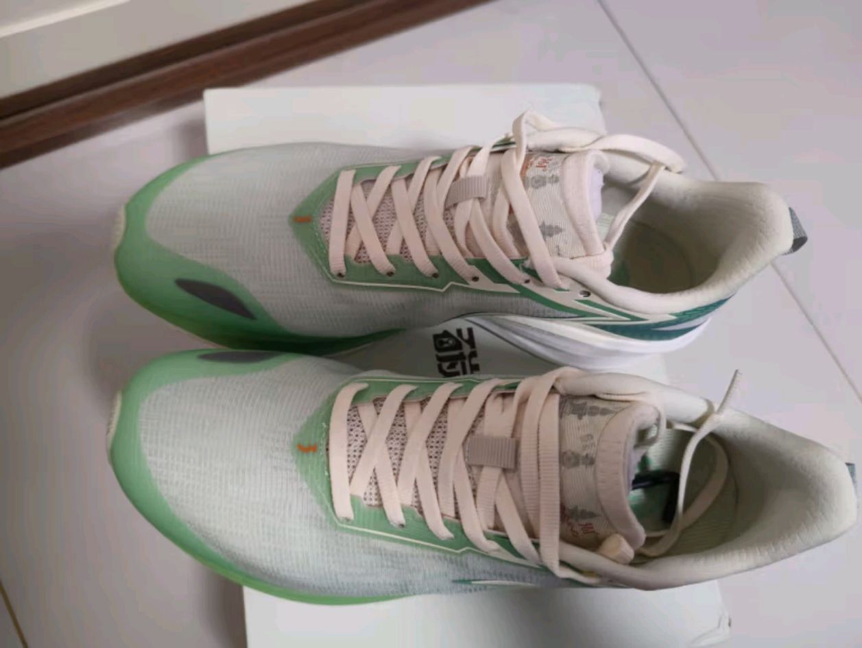 361飞燃ET1.5-- 三潭映月配色 首先,这是鞋的配色比较好看,是绿茶色。。。不对是抹茶色,属于比较清新好看的那种。 省流:是非常稳定的竞速竞训鞋子 但是有一点小缺点 就是中底稍微偏硬一点(比我穿过的全民碳板跑鞋惊碳mix脚感要硬一点)。 分析: 1,这双鞋更话合中 大体重的跑友跑塑胶跑道 竞速跑还是间歇跑都非常适合 硬弹的缓震更适合较软的场地 2.这双鞋不偏码 我通常39码数这个鞋子39码刚...