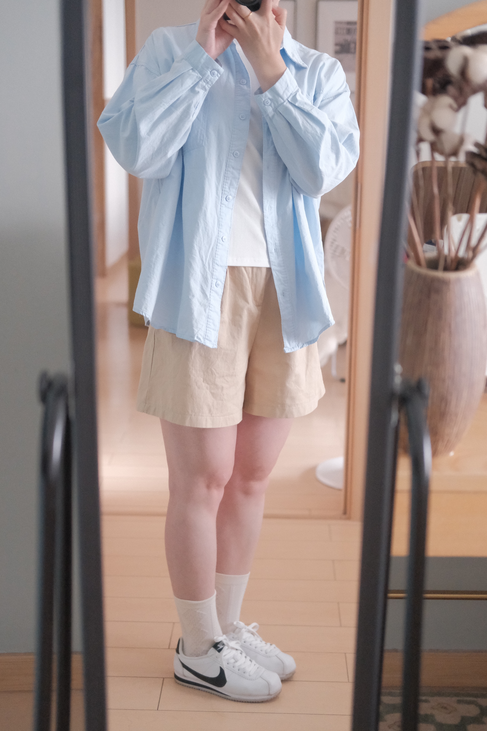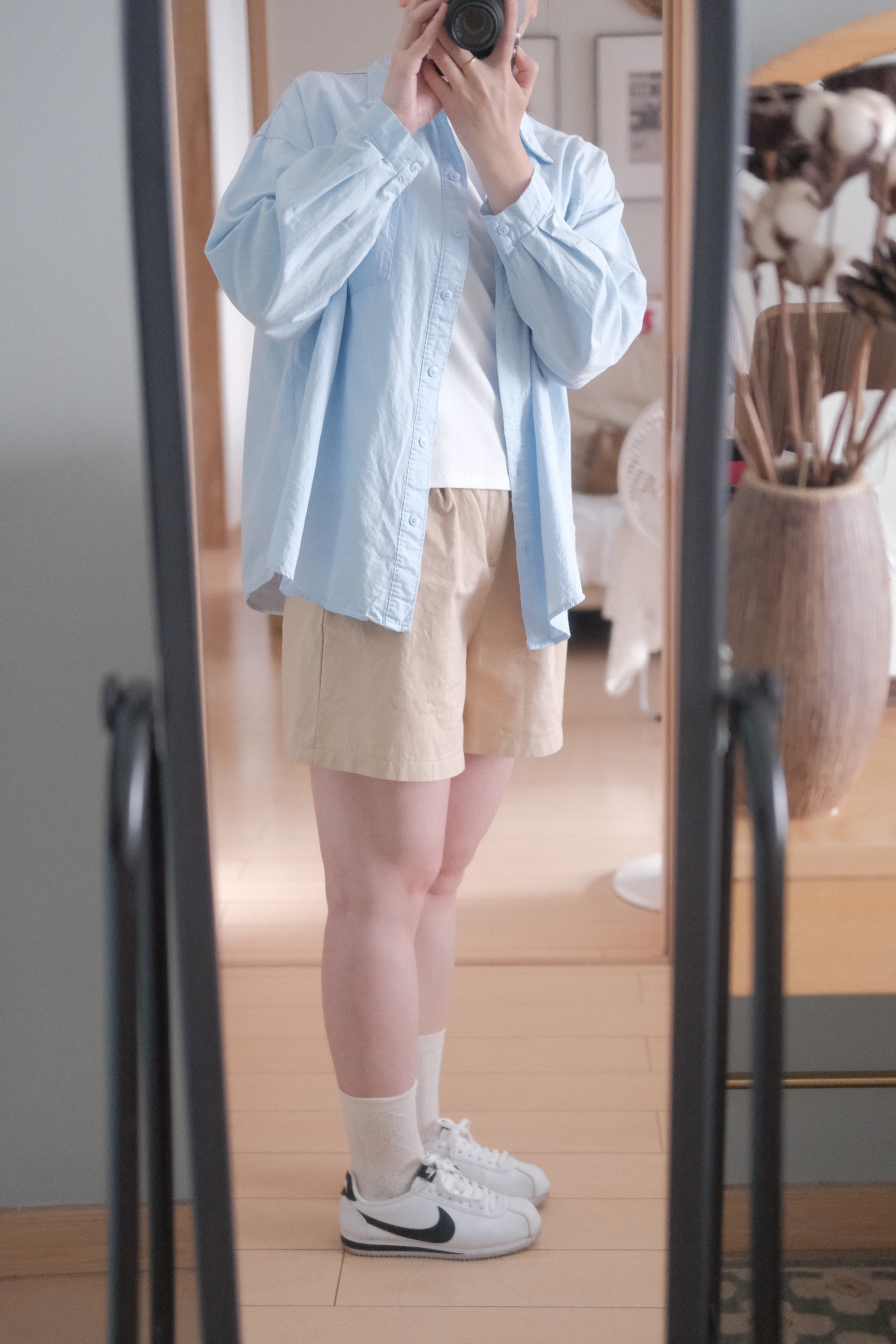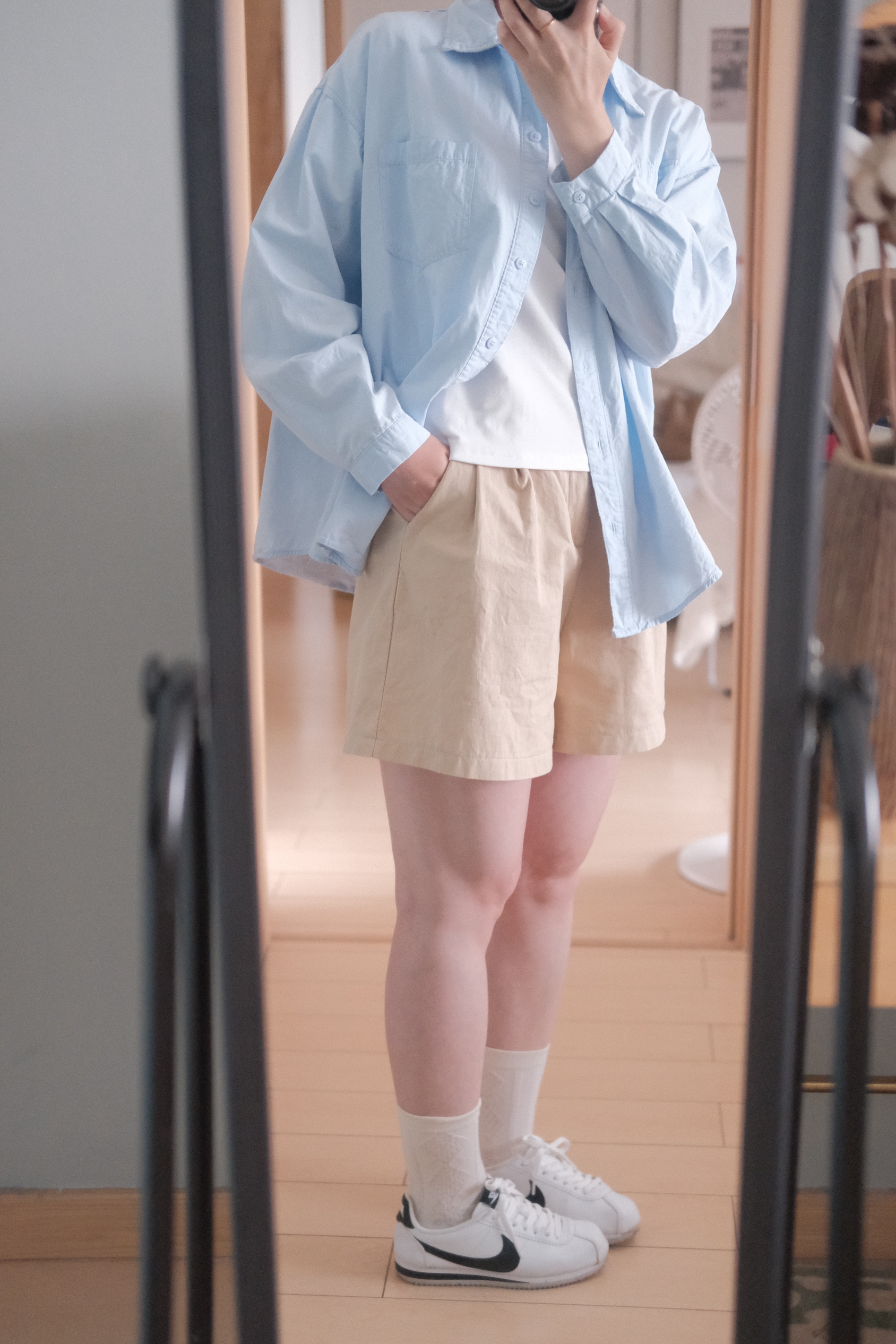 清清爽爽的蓝色衬衣,干干净净的卡其色短裤,搭配上颜值超高的耐克阿甘~ 属于普通女生的清爽型穿搭,超舒适的