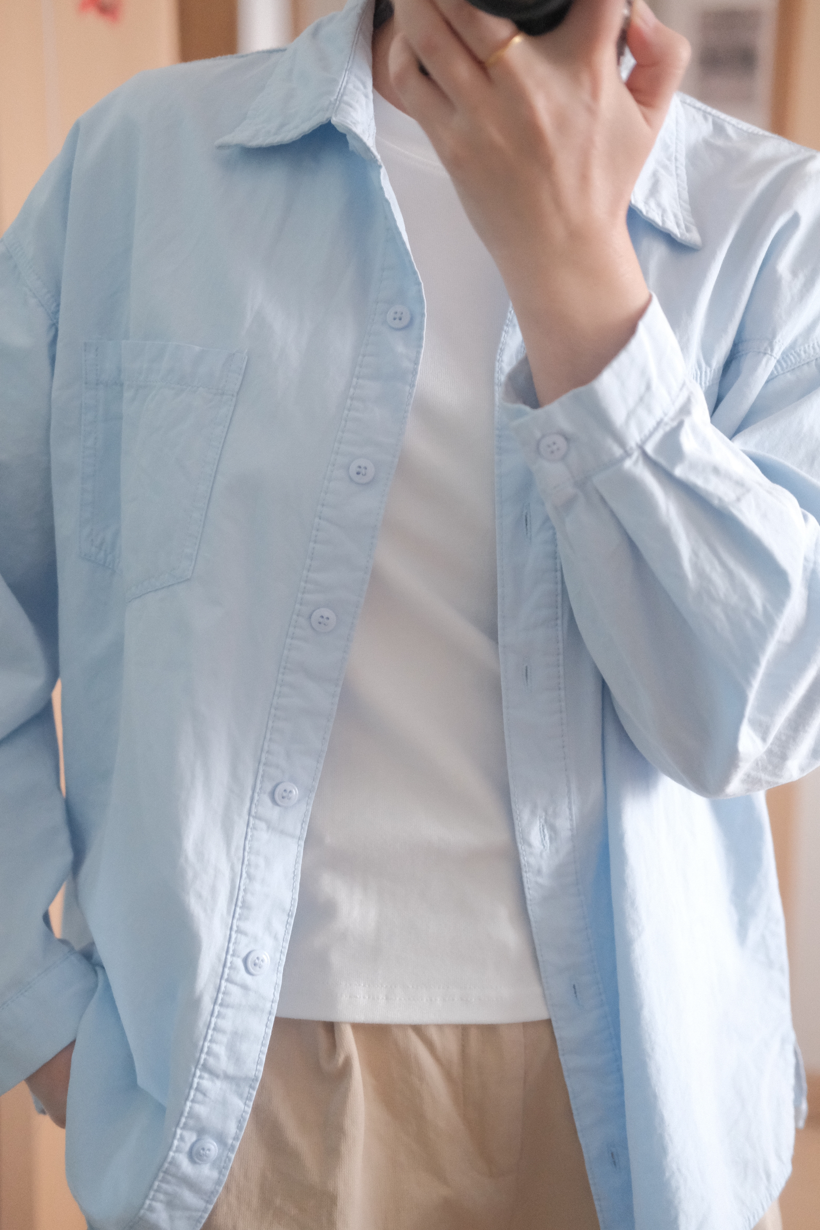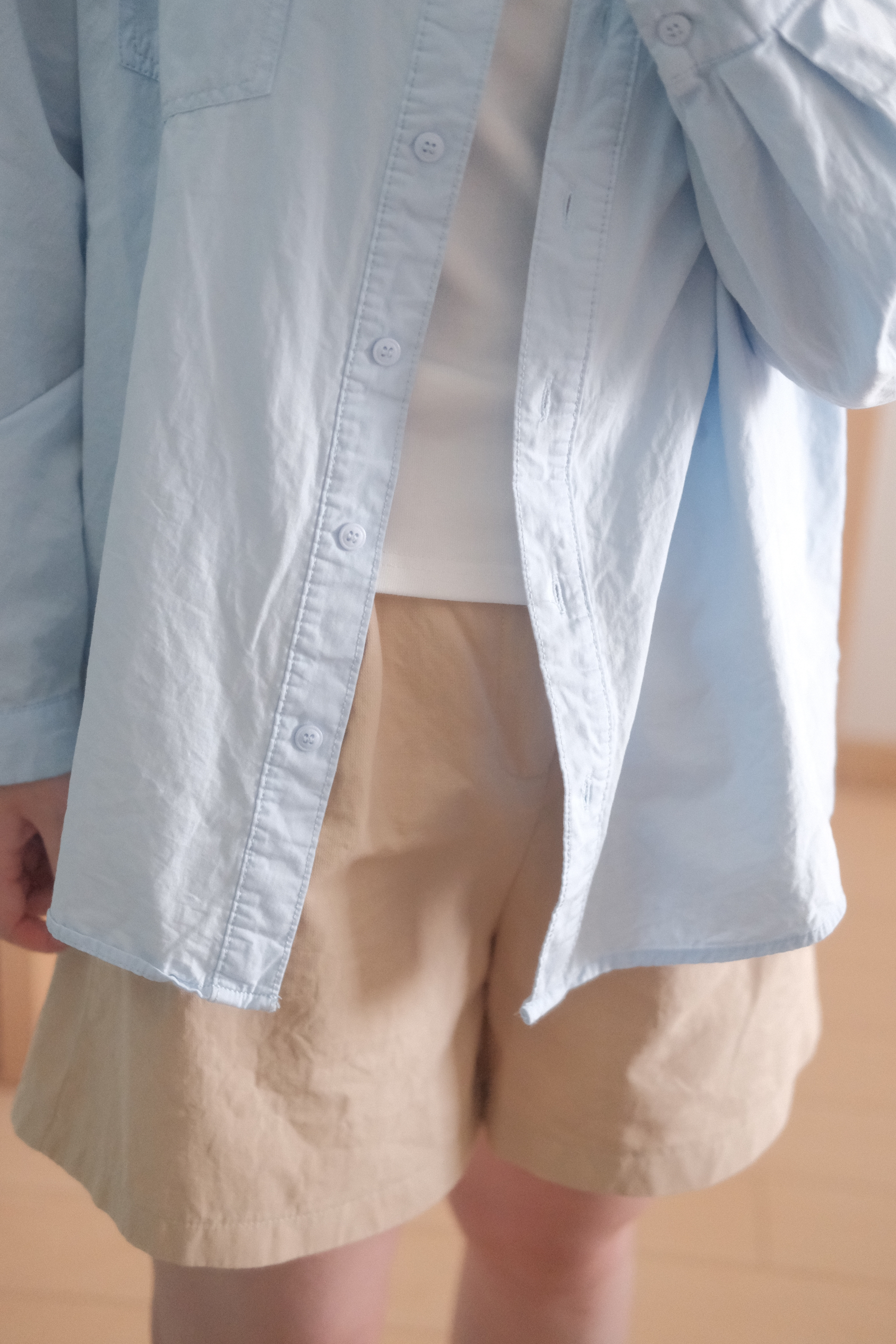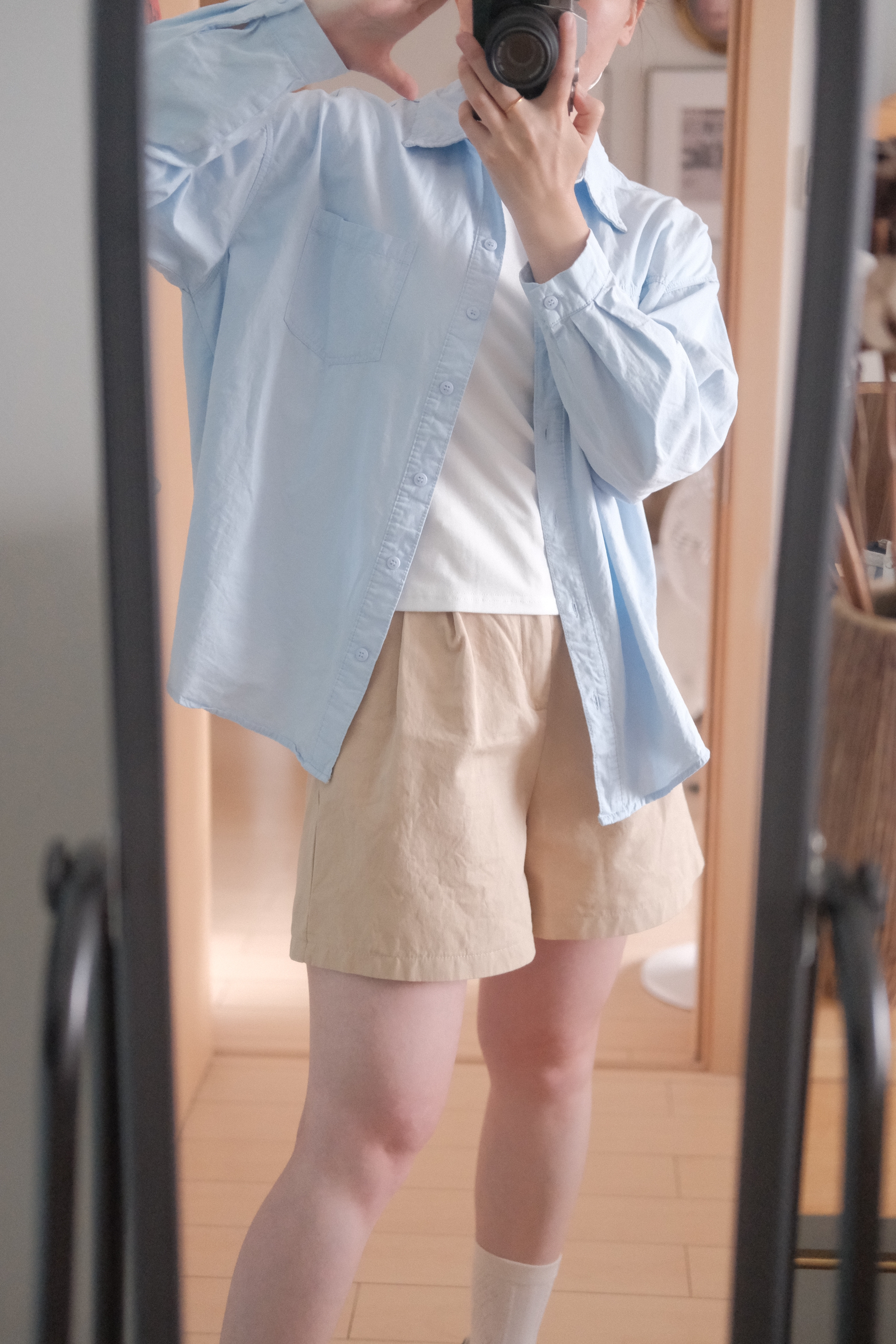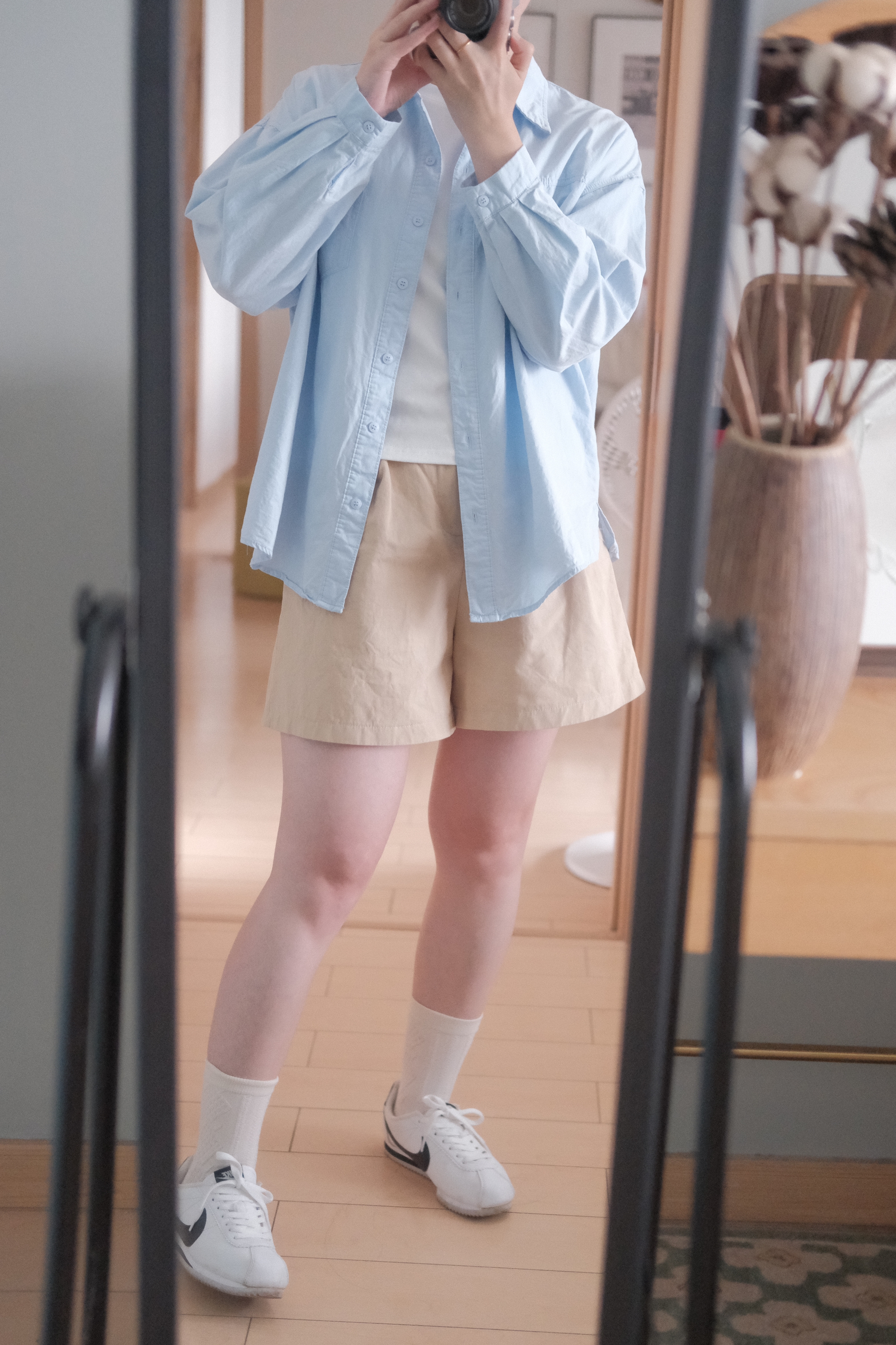 清清爽爽的蓝色衬衣,干干净净的卡其色短裤,搭配上颜值超高的耐克阿甘~ 属于普通女生的清爽型穿搭,超舒适的