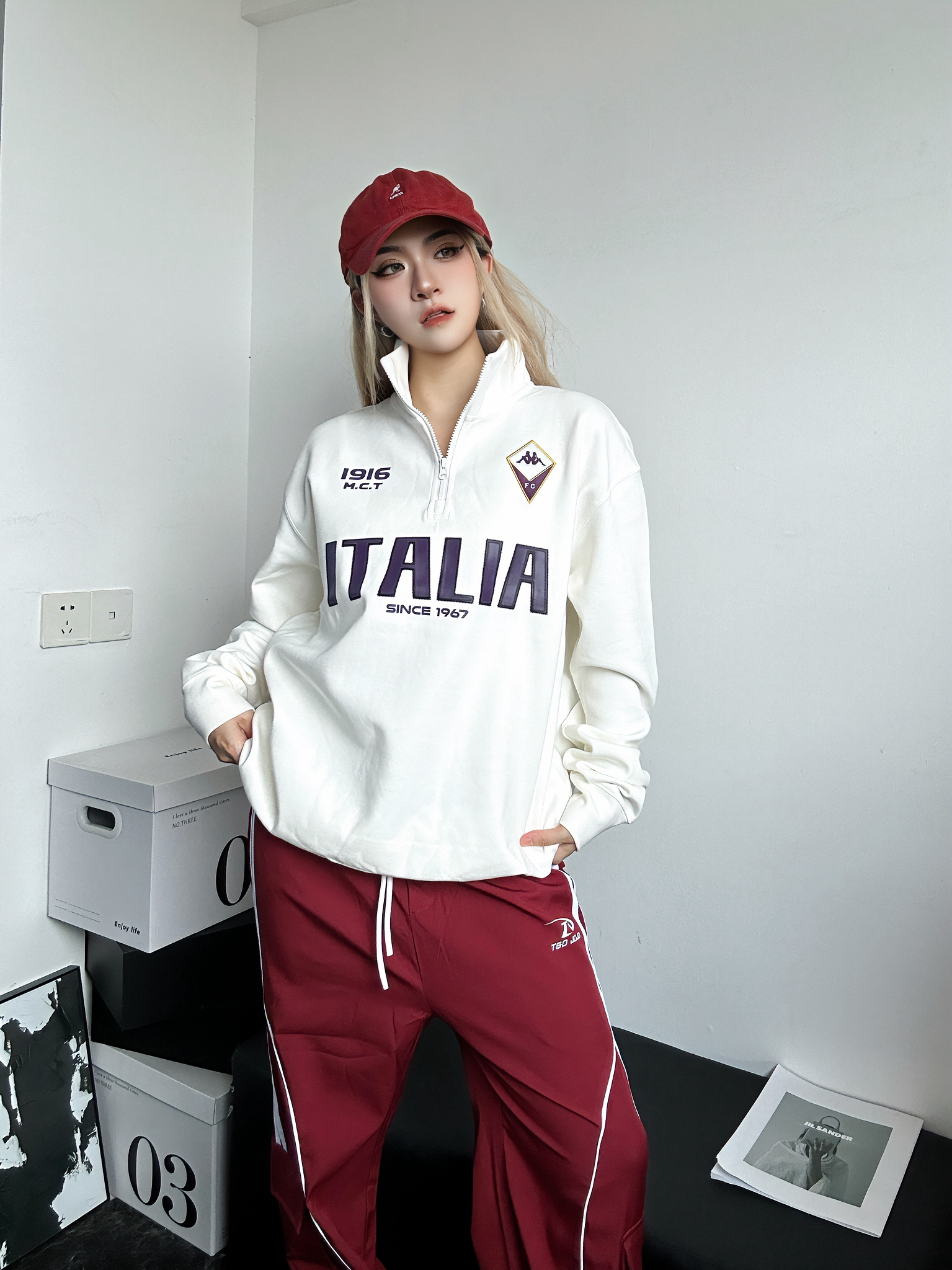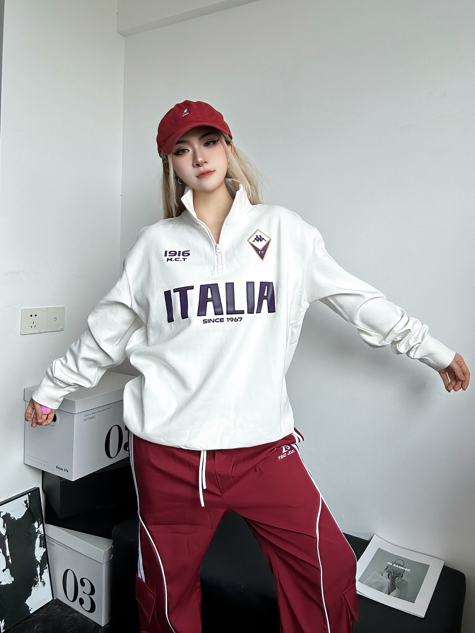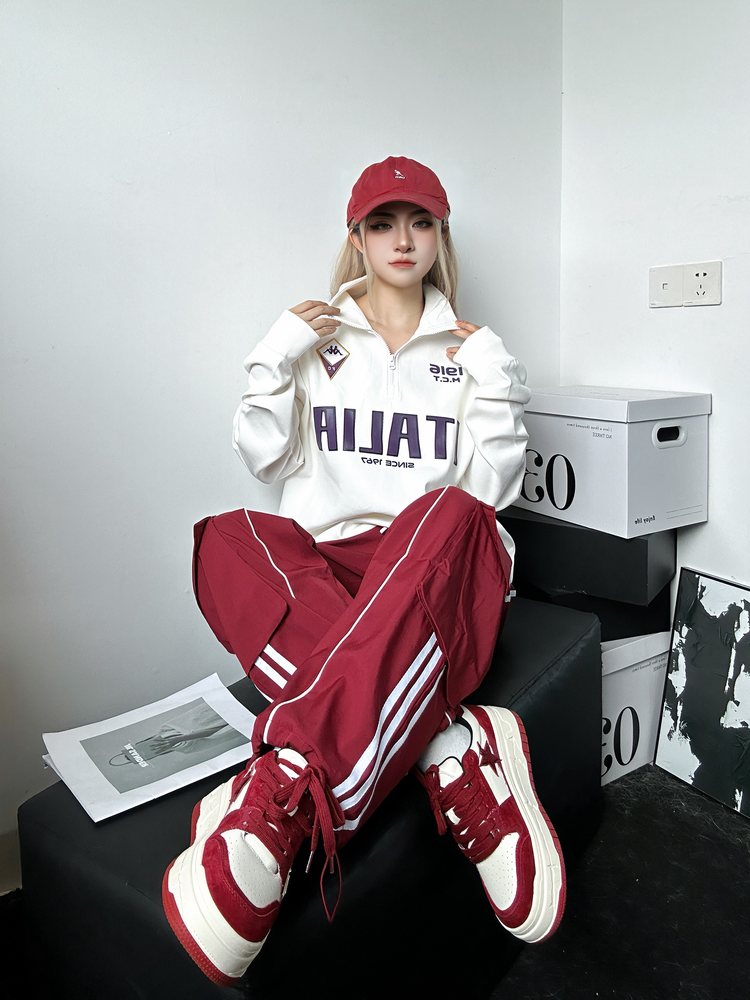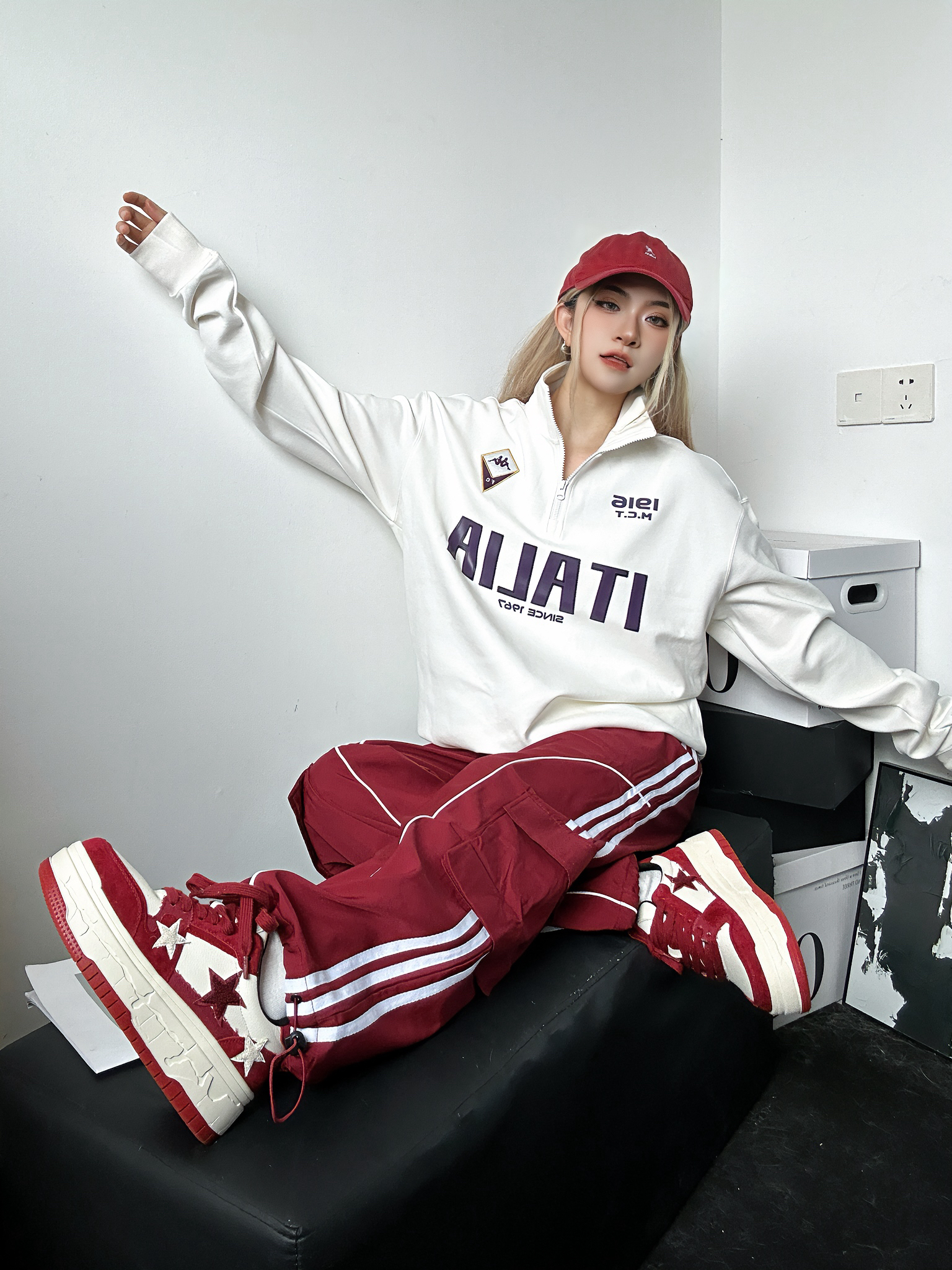 今日穿搭分享 上身kappa立领卫衣 半拉链设计 穿脱超级方便 花灰色配色带点红色很显白 搭配一条老红色工装束脚裤👖 休闲氛围感十足 鞋子是来自非谜的厚底板鞋 红白配色 厚底增高大概5厘米 好穿还特别百搭哦