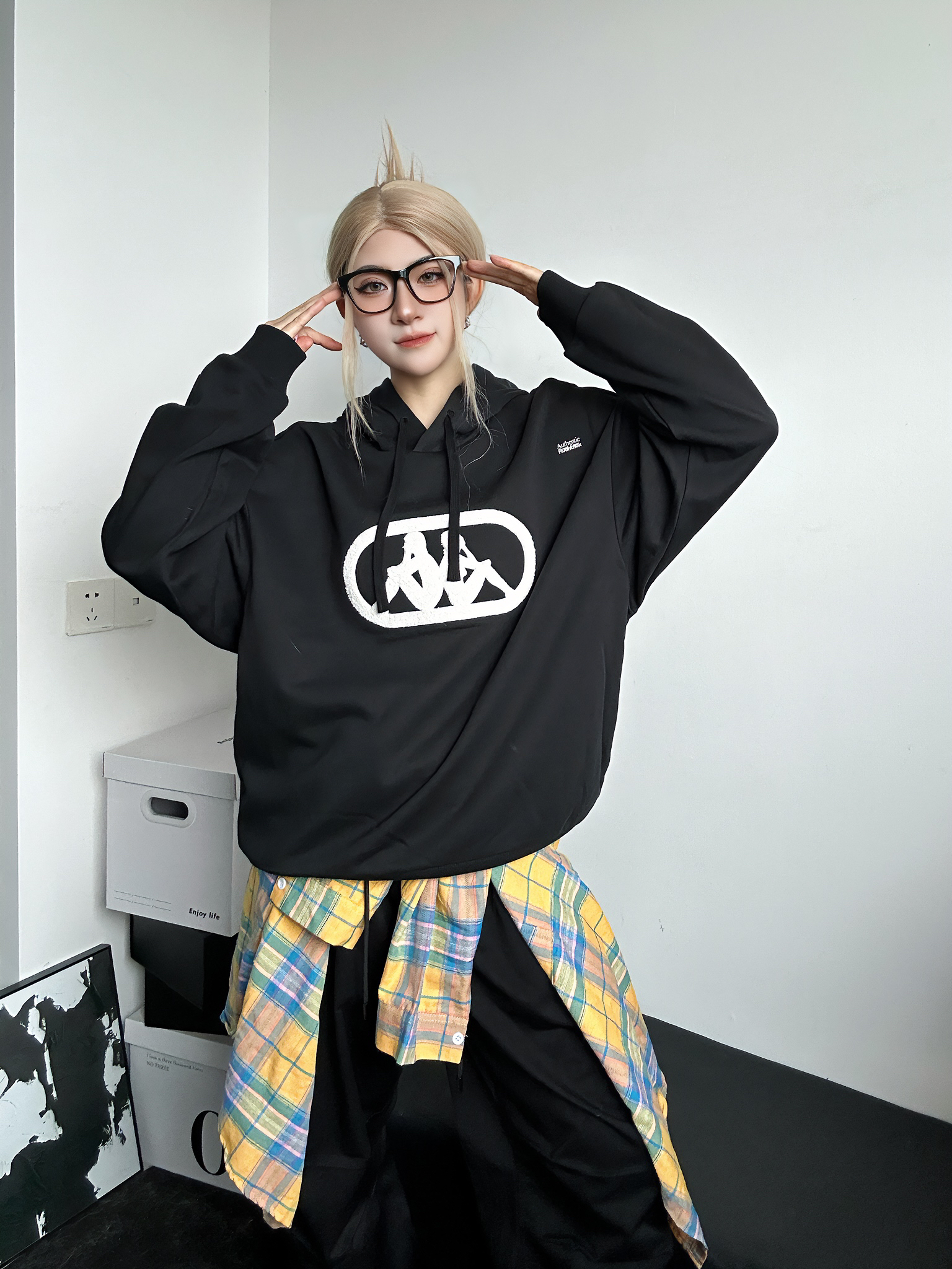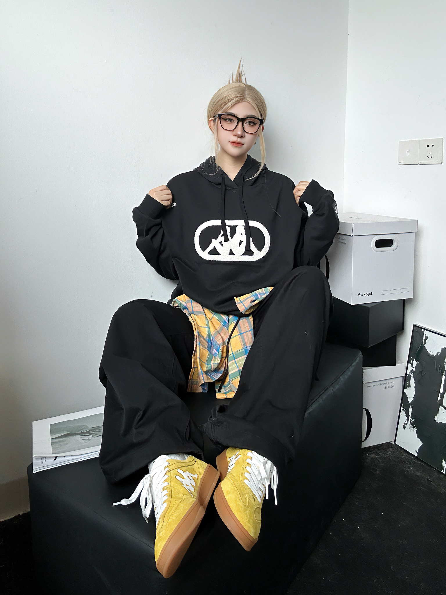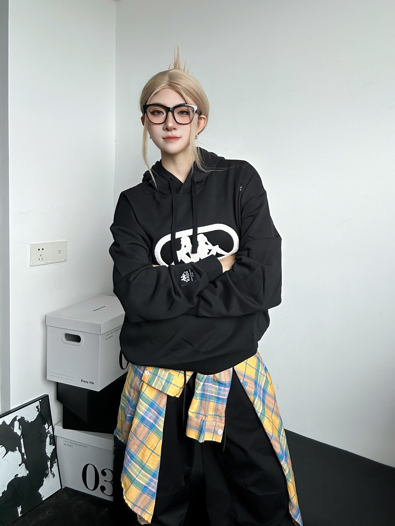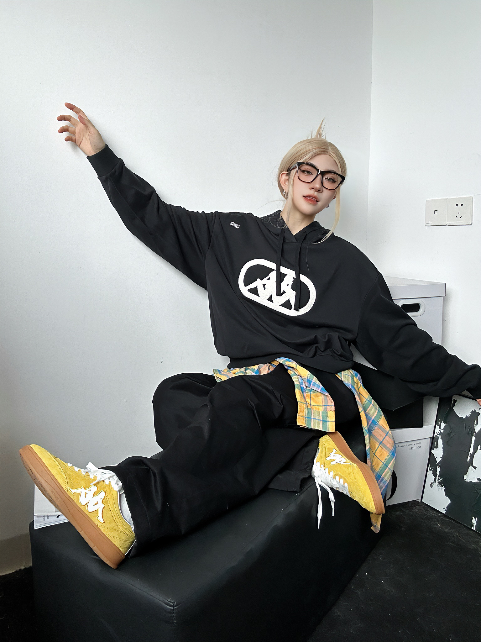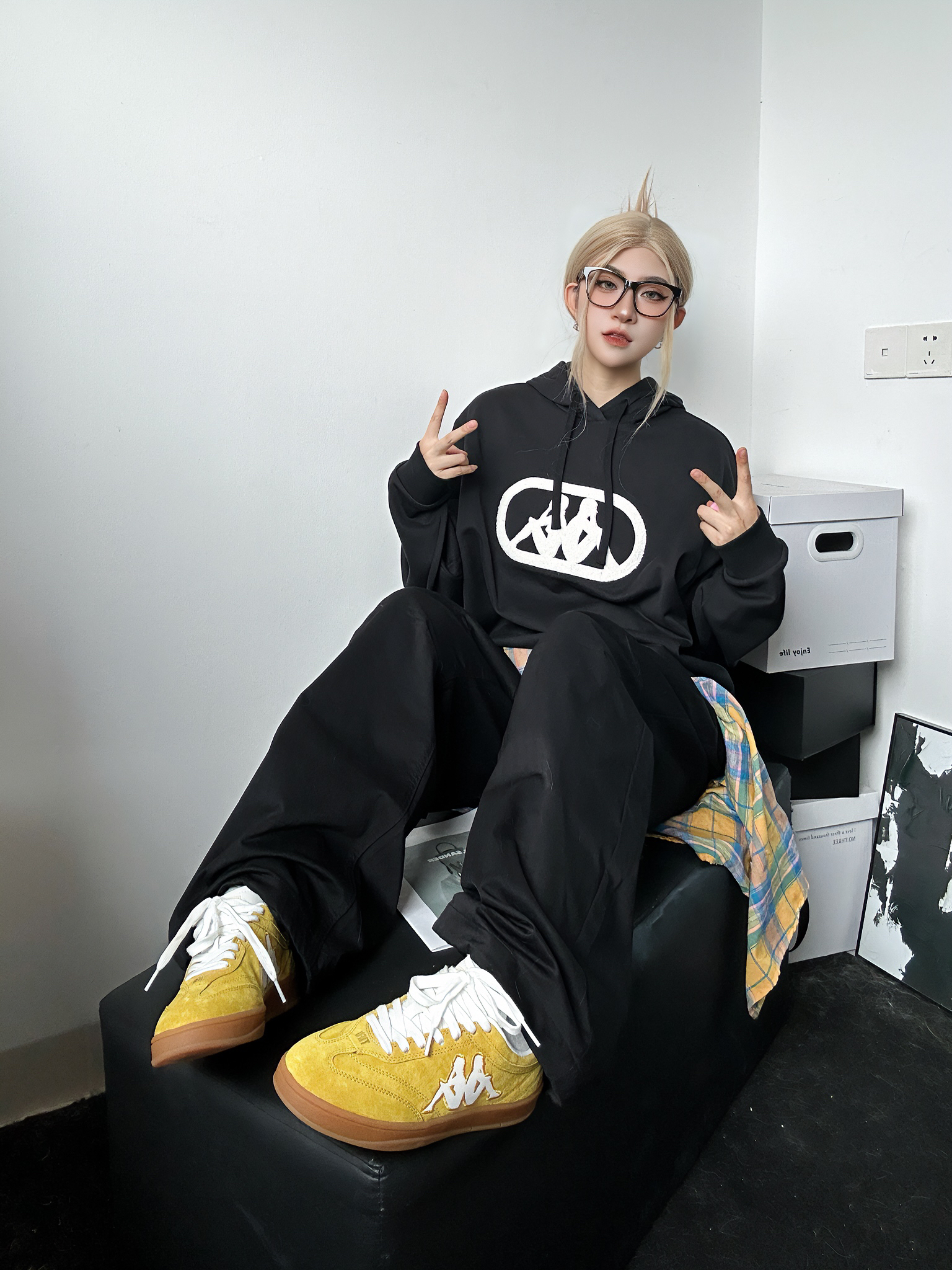 今日穿搭分享 上身黑色卫衣来自kappa 简约黑白配色百搭不挑人✅ 胸口大大的logo涂鸦吸睛亮眼 连帽设计是秋冬安全感的来源 搭配百搭黑色工装裤 鞋子同样来自kappa超火🔥的德训鞋 黄色点亮整身穿搭 轻松get