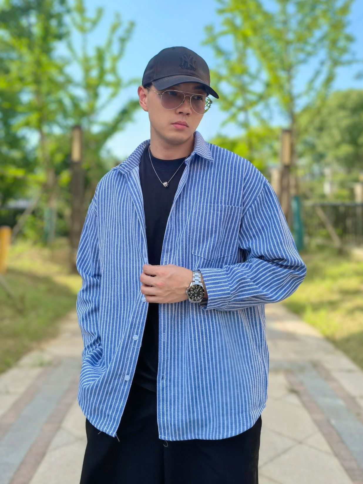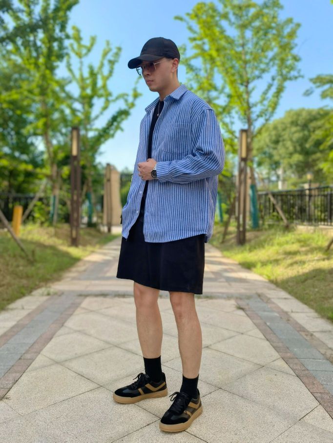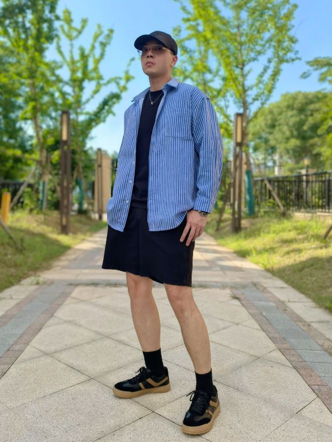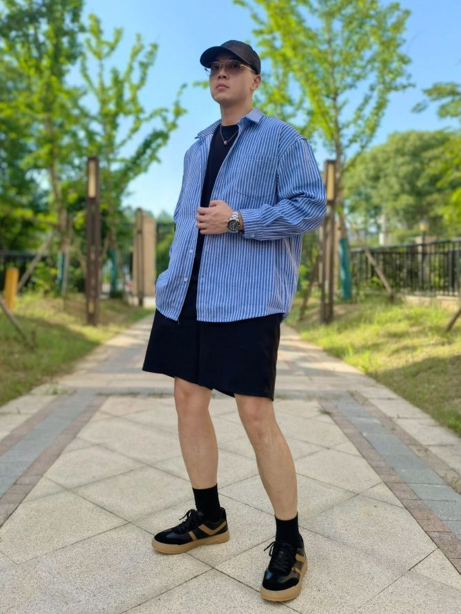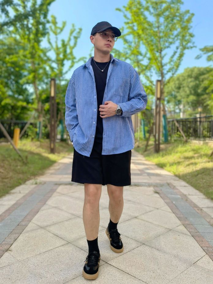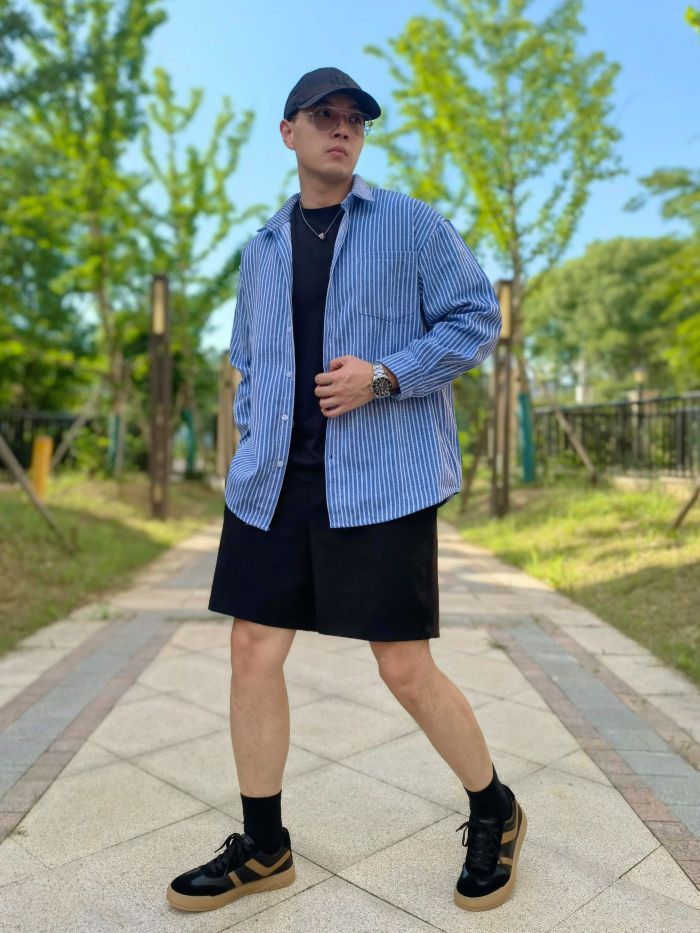hello 大家好,这里是撒旦锅锅 💜179cm/80kg 🌞今日穿搭为休闲风格 搭配类型:衬衫+休闲短裤+休闲鞋 上身搭配一条蓝白条纹牛仔衬衣,下身搭配黑色休闲短裤,最后选择一双都彭黑色休闲板鞋,很好搭配,整体穿搭阳光帅气,休闲感满满💞