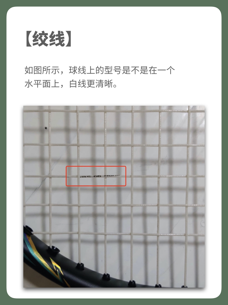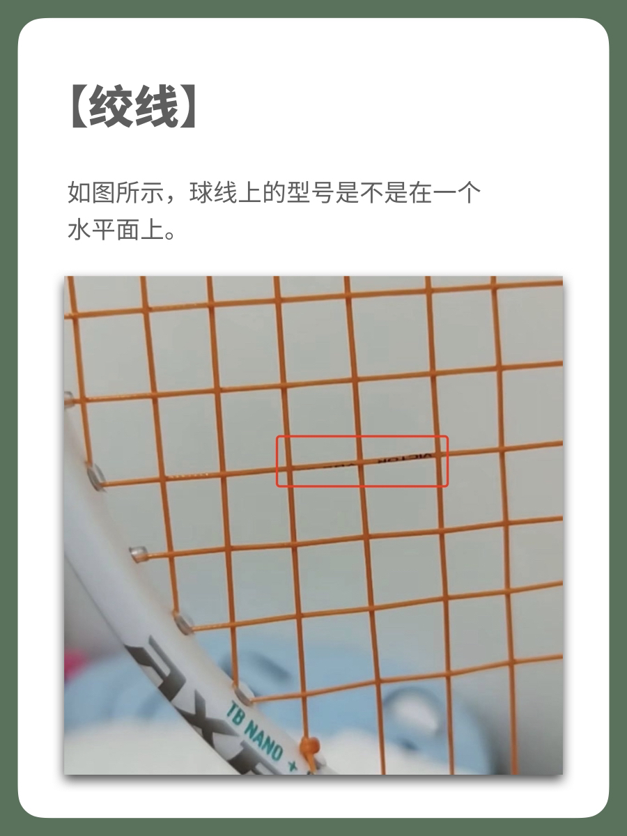 6、你拿到球拍要第一时间检查,看球拍面球线上的型号是不是在一个水平面上,不是的话,可以直接要求剪线,这是不能容忍的情况,没有下次系列。