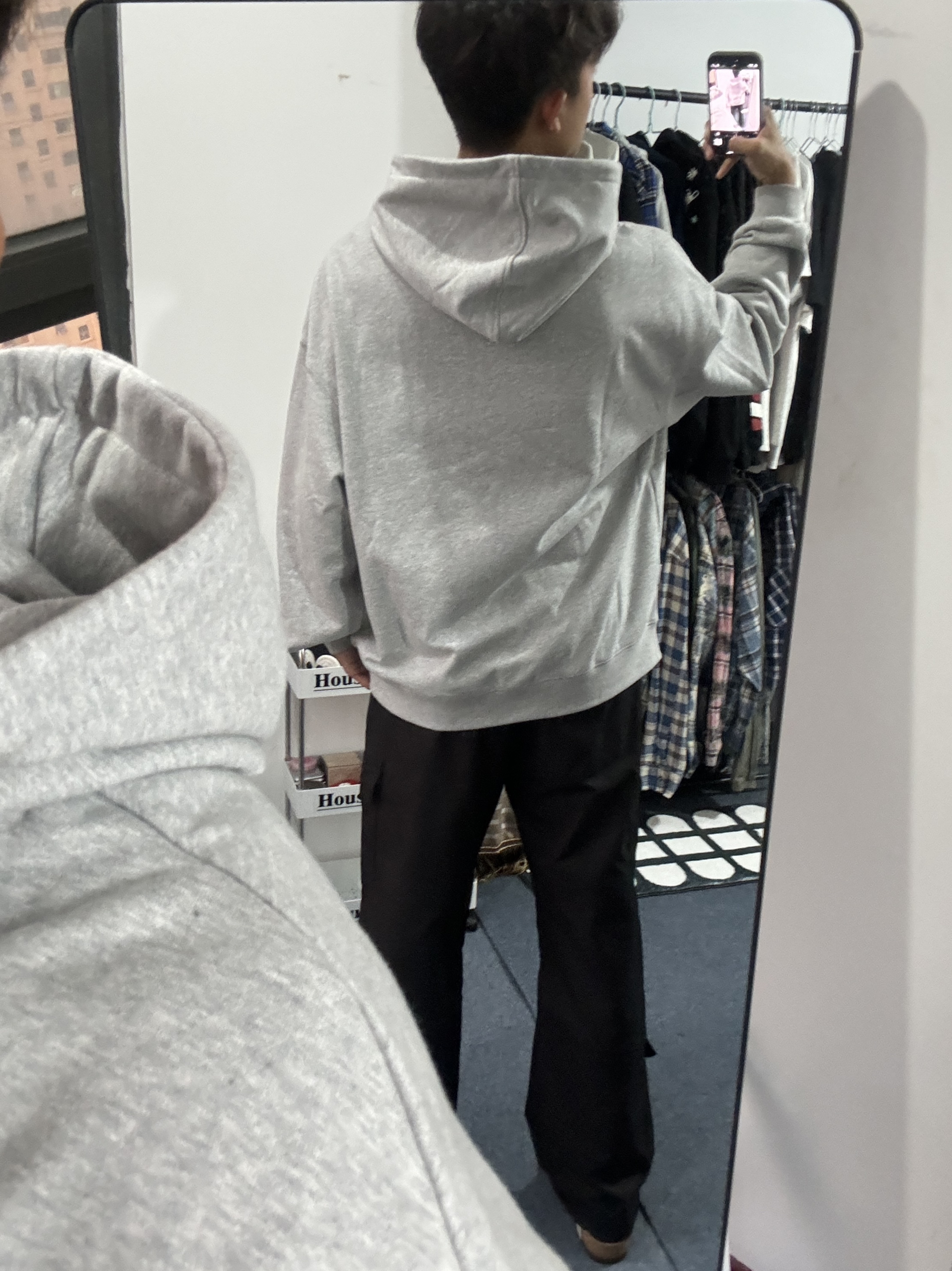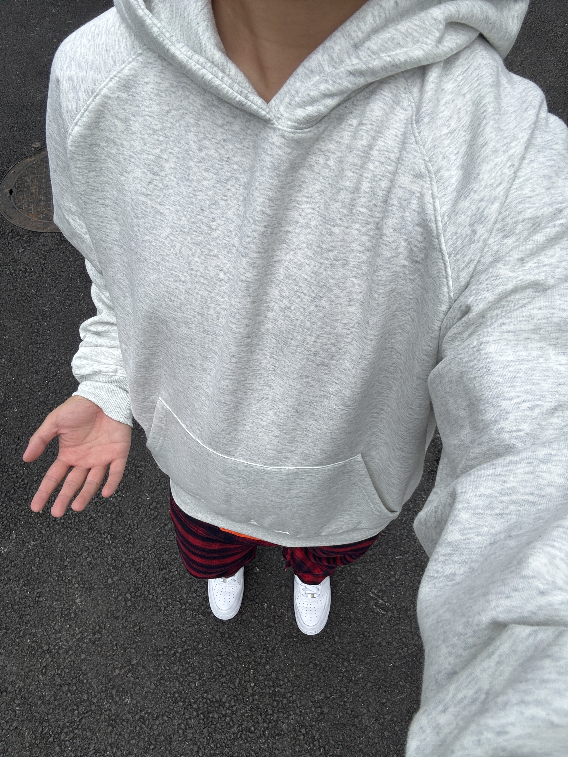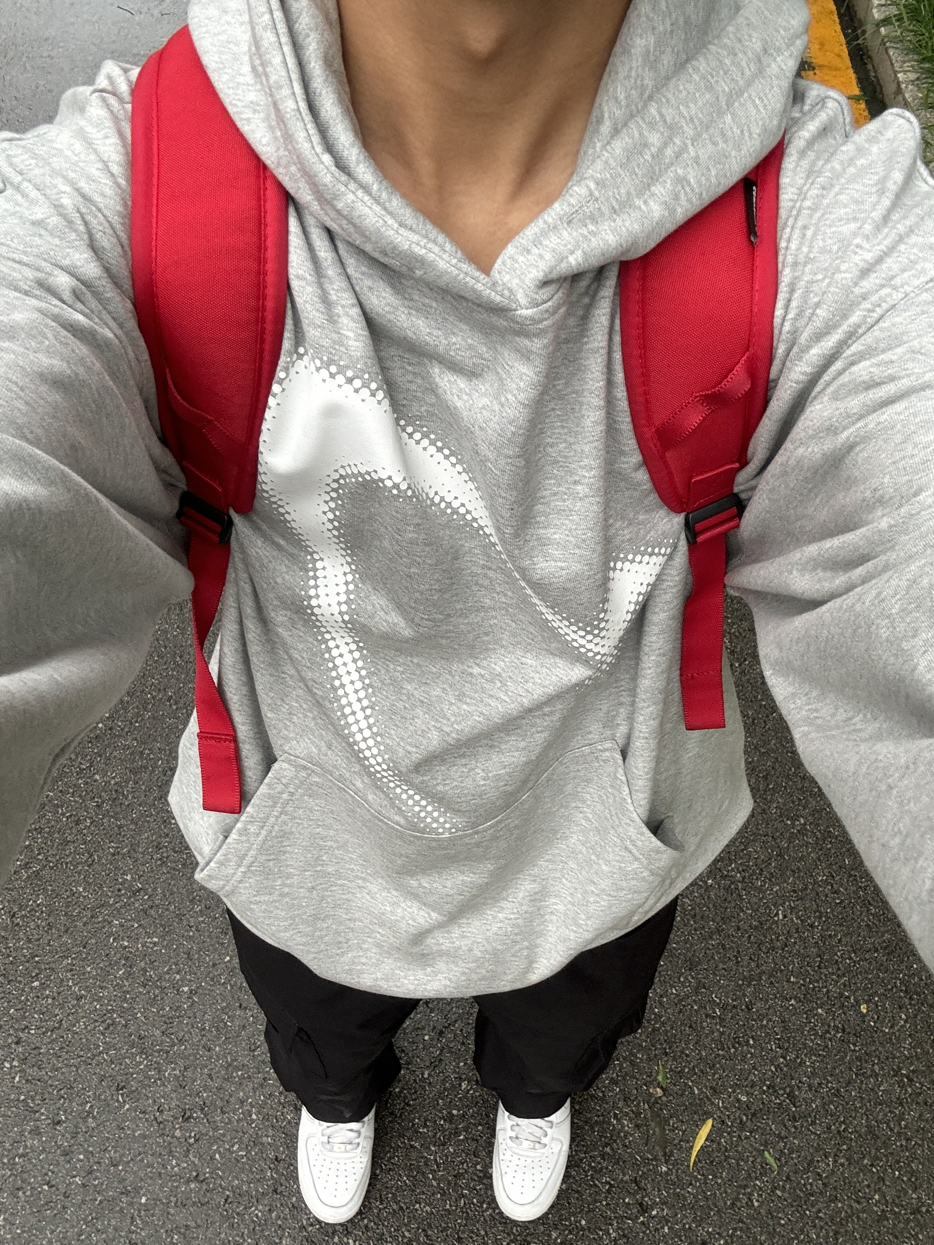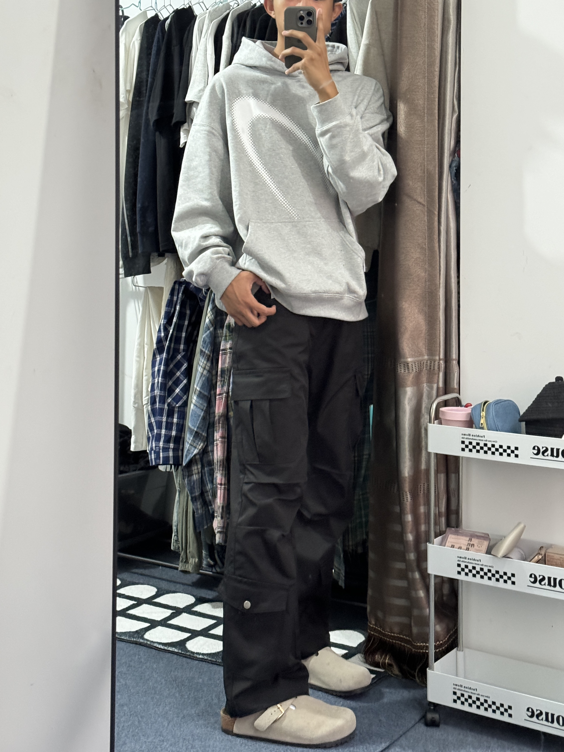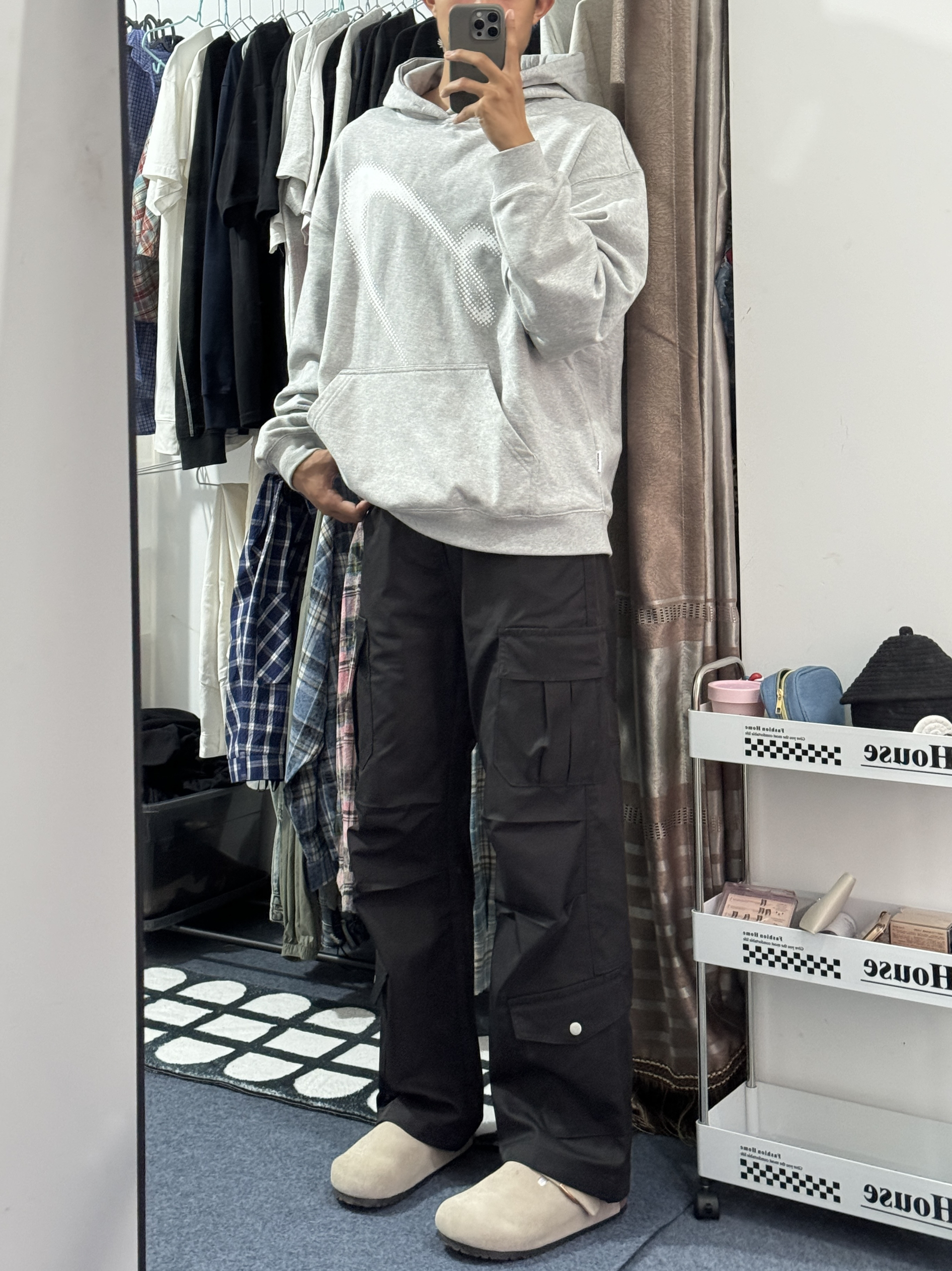 180 130|穿搭日记 👔|现在的季节下雨天和卫衣更配诶,正好保暖还防寒,厚度刚刚好,还有连帽的设计,也比较好搭配~正面一个波点logo,也比较简约啦,好喜欢这个灰色,还挺显我白~ 👖|搭配一条冲锋裤面料的工装裤,这么穿巨帅的啊,长度也是我喜欢的,巨显腿长!