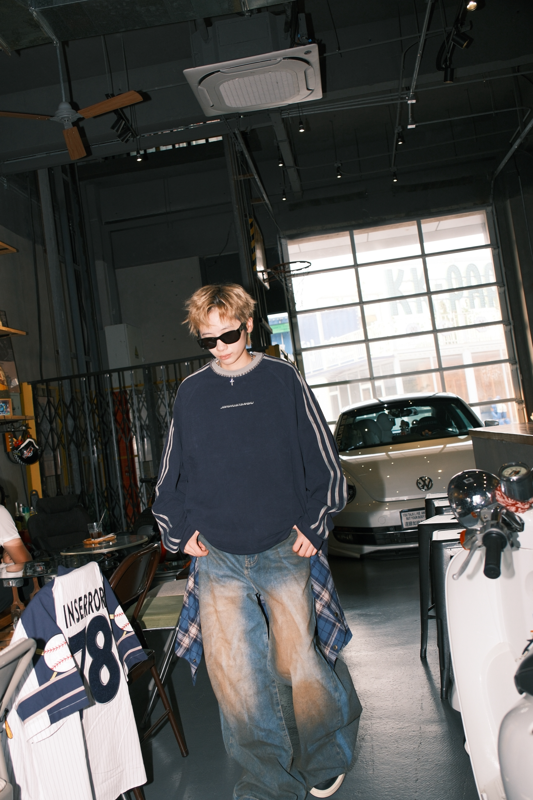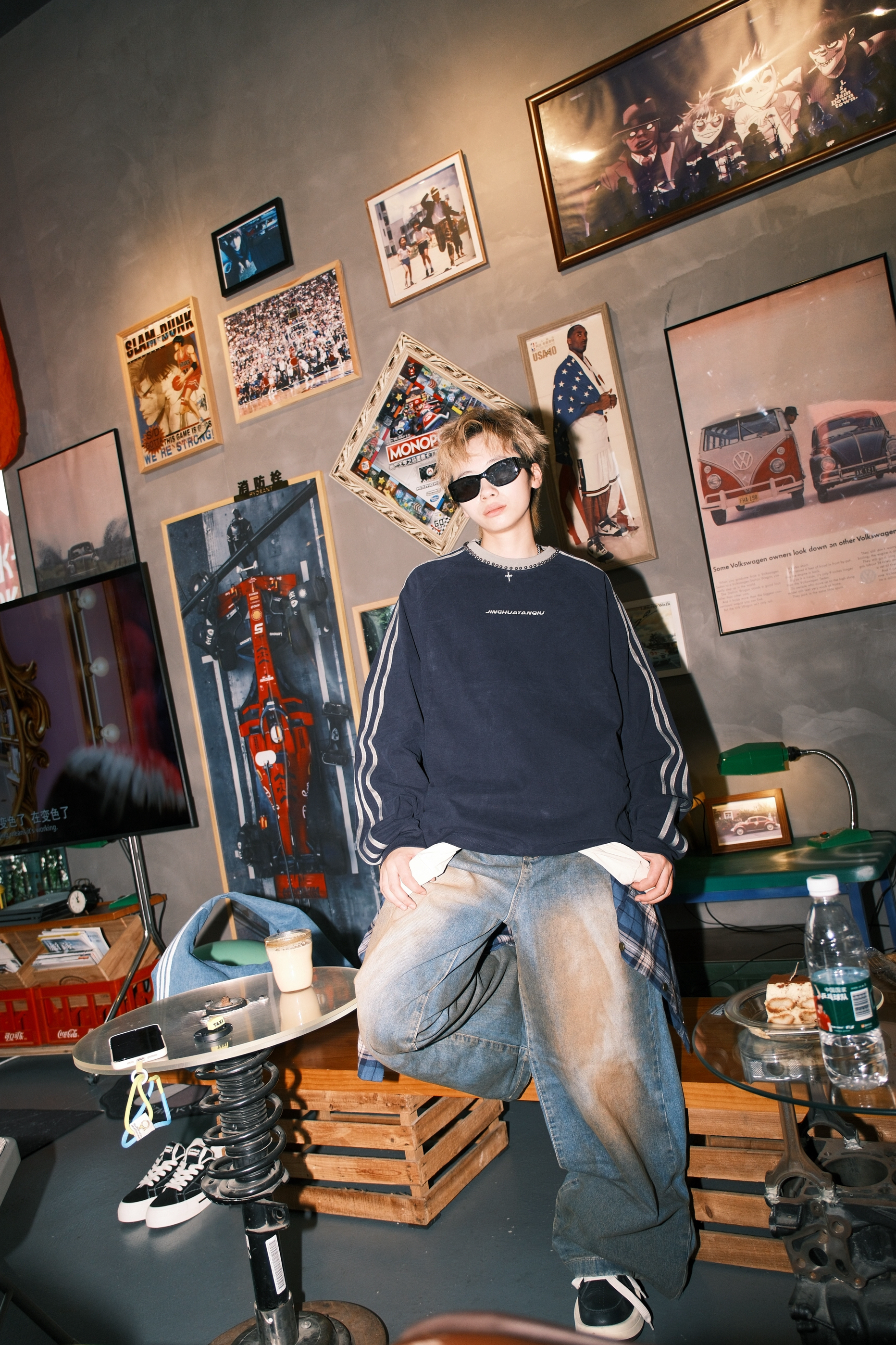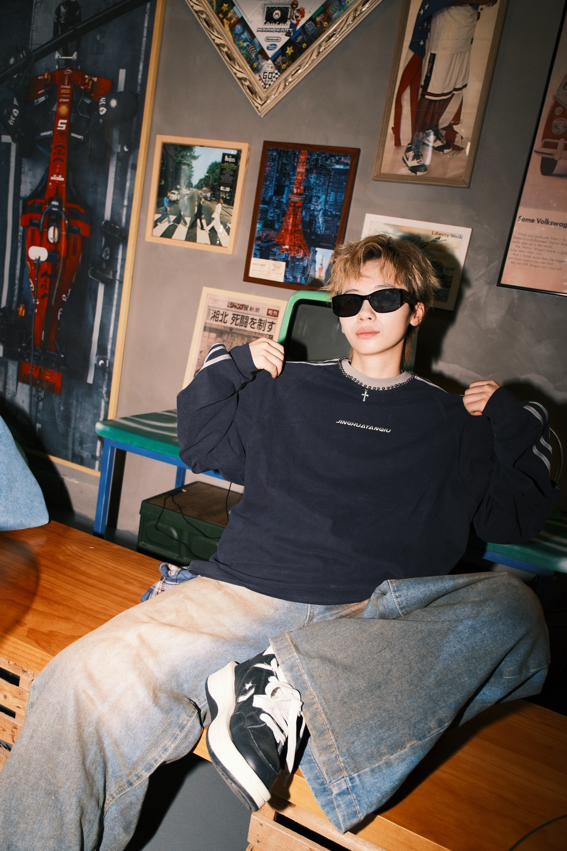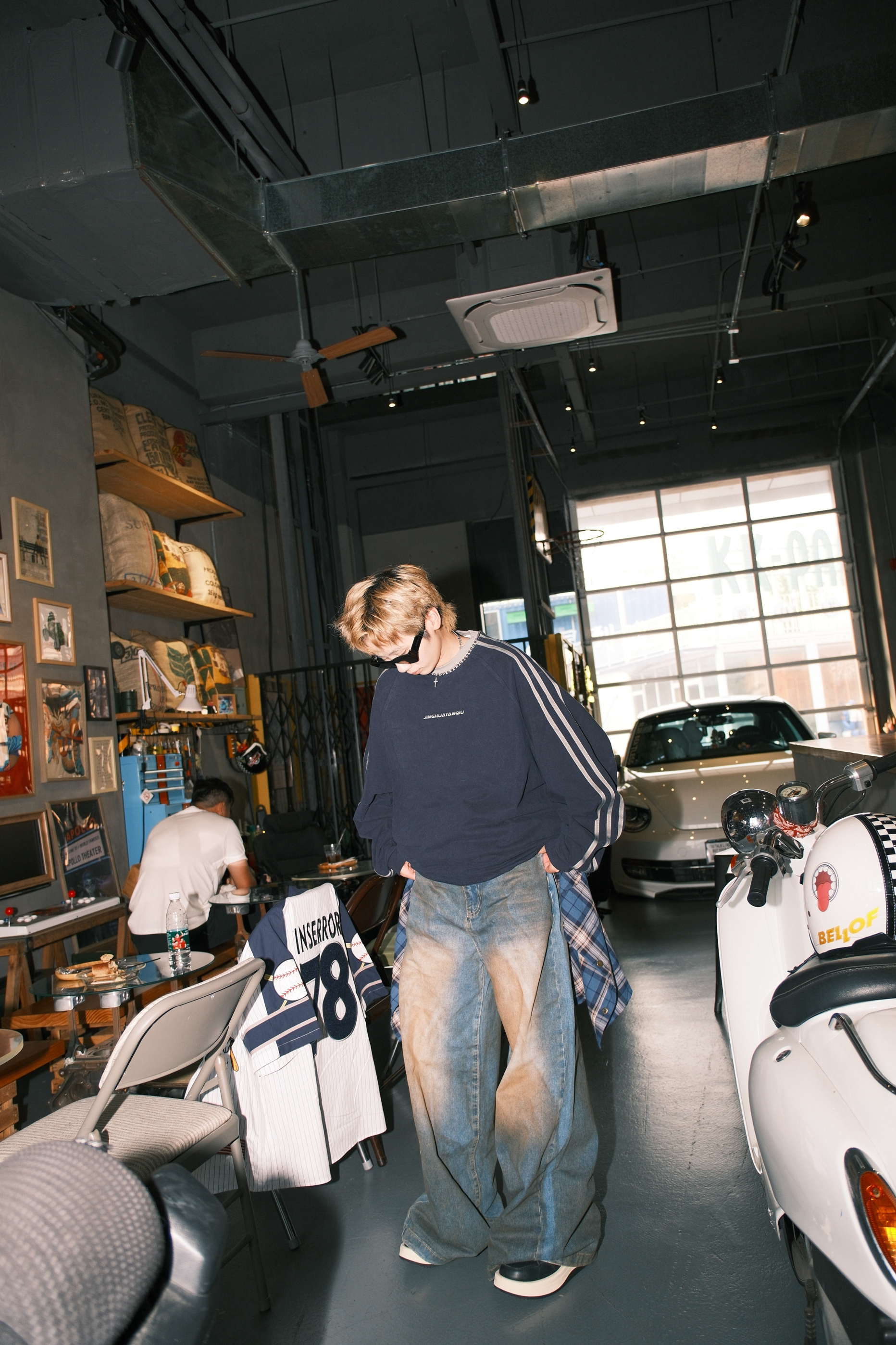平时不爱喝美式☕,穿搭必须整美式风 今天上身一件藏青色长袖T恤 袖子的三条杠设计,就有点复古运动风 领口处加了串珠项链的小细节 省去了配饰的烦恼 下身搭配一条做旧的阔腿牛仔裤 黄色的锈迹,蛮有美式街头感那个味道 最后来一双Ro匡威联名的板鞋 👕: JHYQ 尺码参考:163cm/45kg 上身S码