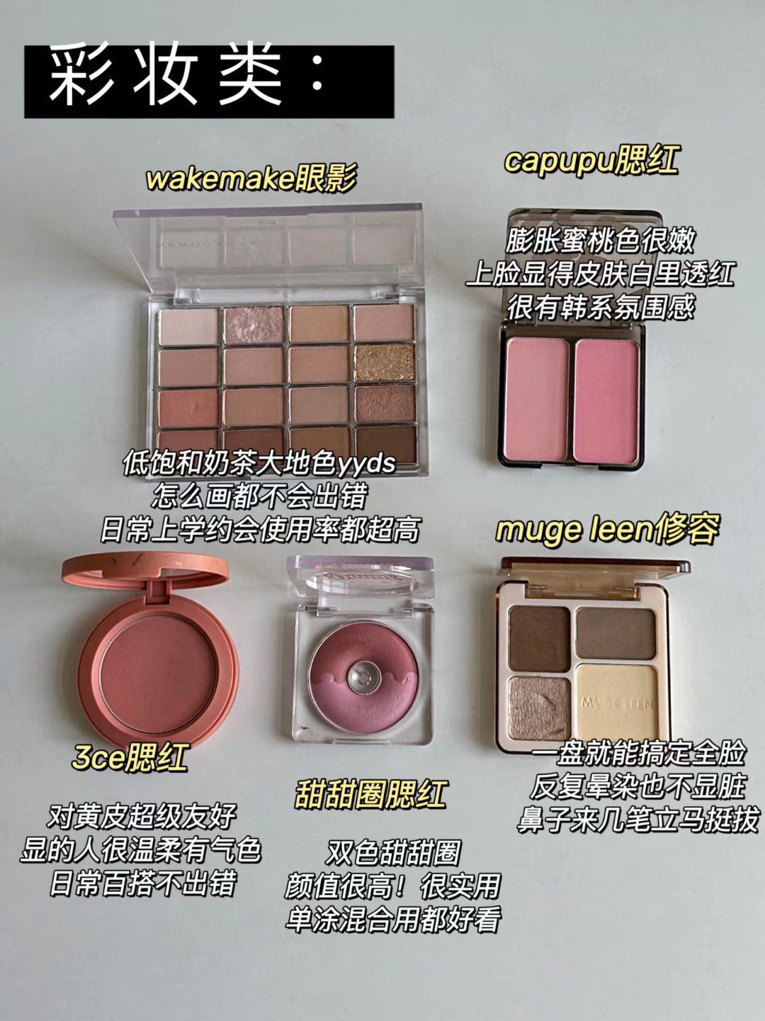 马上要开学的大一新生宝子可以码住!给大家整理了一套平价化妆品,全部都是我认认真真做功课入的,价格便宜但妆效啥的一点不差,没有一个踩雷的,新手想入一套练手或生活费不多想化妆的,可以参考一下~ 🌷Mugeleen修容:一盘直接搞定全脸修容,颜色很自然,多晕染几次都不显脏,特别是右上角那块,我的塌鼻梁随便扫几下直接平地起高楼,在颧骨下颚扫一扫,脸也精致好多~ 🌷Wakemake眼影:整盘是低饱和大地...