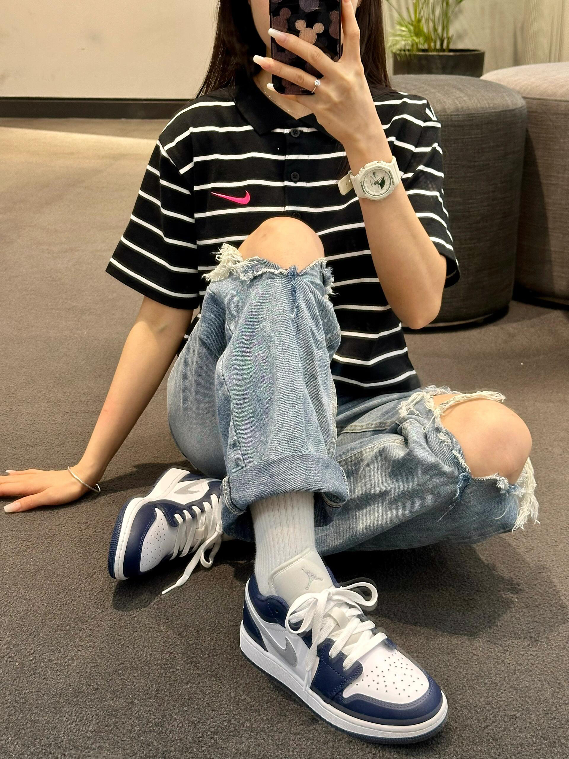 很惊艳 AJ1 海军蓝果然名不虛传 复古蓝色很高级耐看 高级感十足鞋面是由白色和海水蓝色 组合打造,鞋舌处设计了经典的飞人标志这款 鞋可以轻松的驾驭任何风格的造型,十分百搭喔