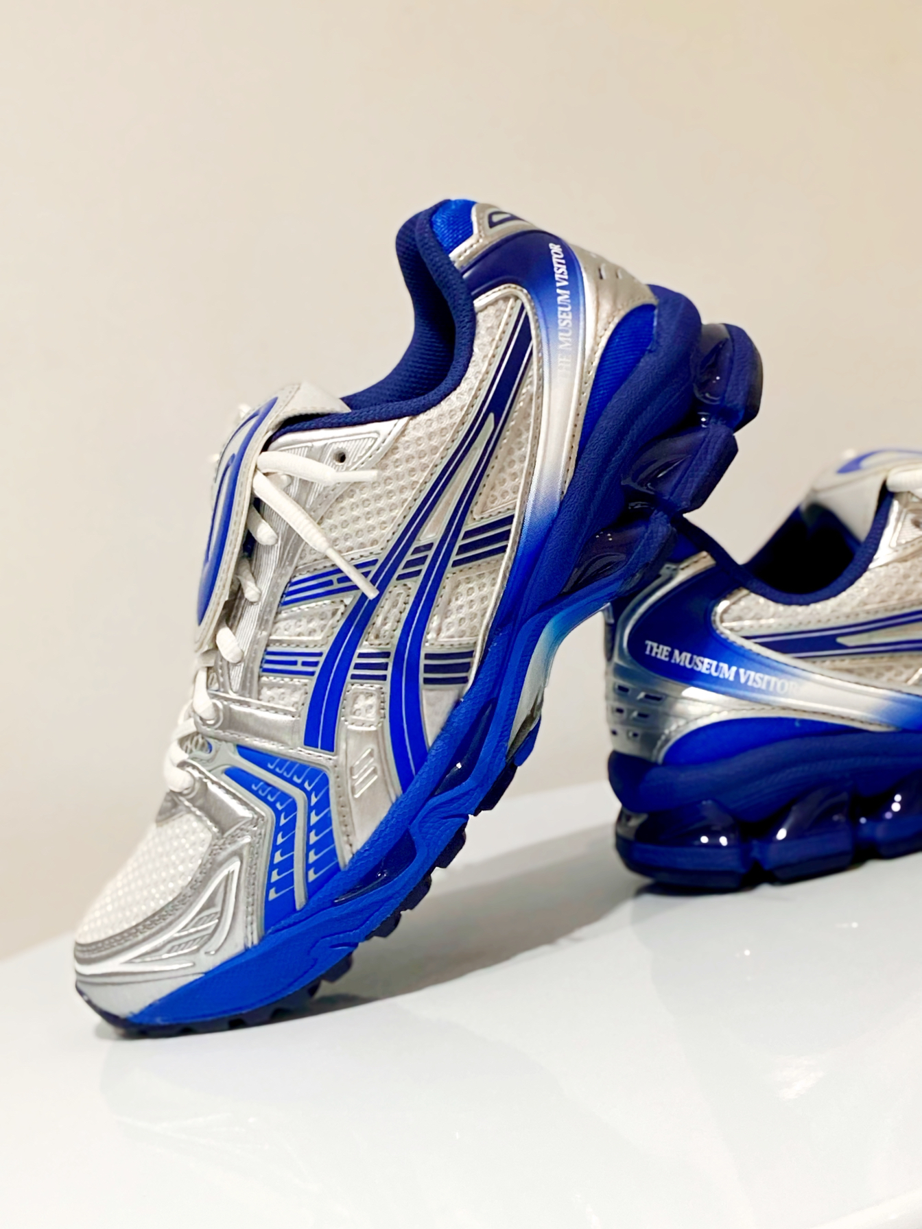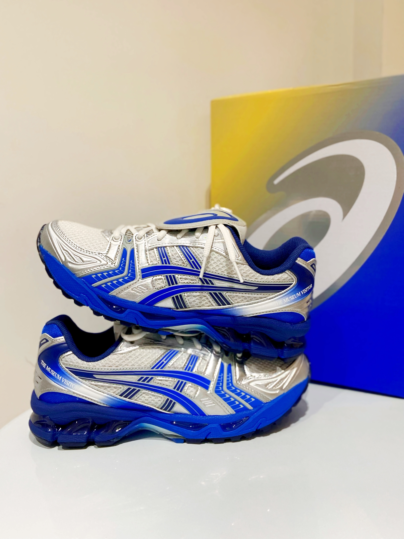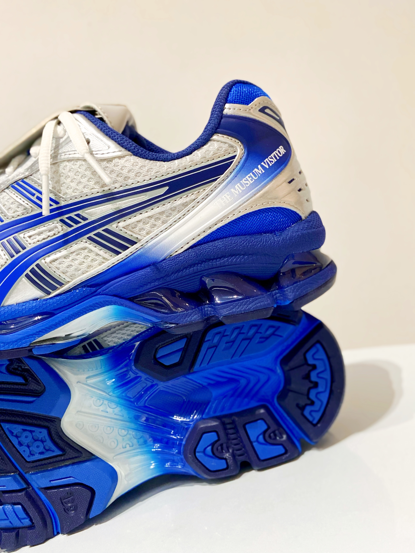 这是 ASICS 和 THE MUSEUM VISITOR 的首个联名 总共有三个配色,我入手的这款是白蓝 鞋面白色为主,搭配银色和蓝色细节 侧面和鞋底的渐变处理 让整双鞋足够惊艳 ! 鞋盒也是渐变设计 还带了一个鞋盖,正面大大的 a 字 LOGO 不过不能拆掉 Kayano 14 的脚感自然不用多说啦 !