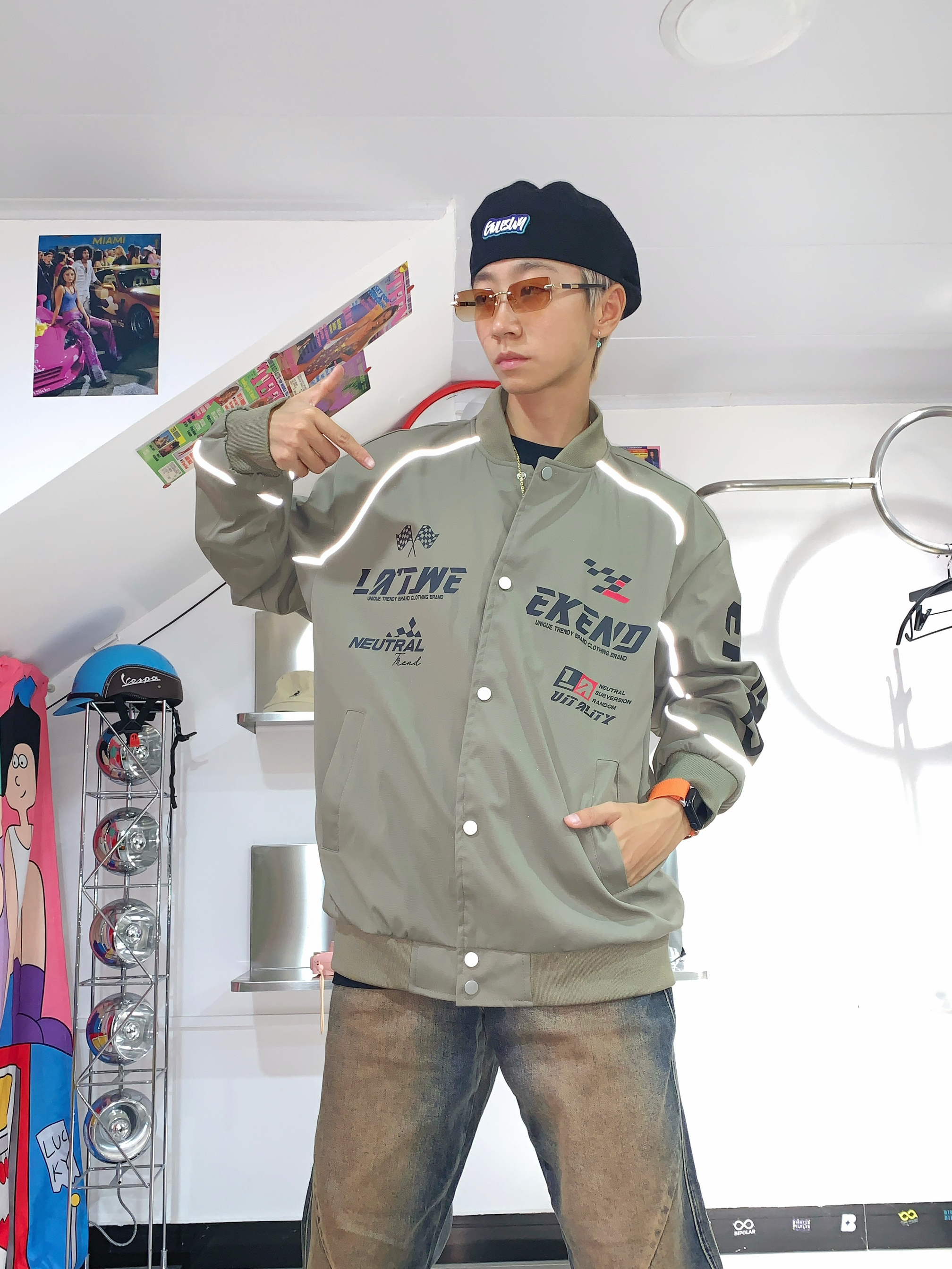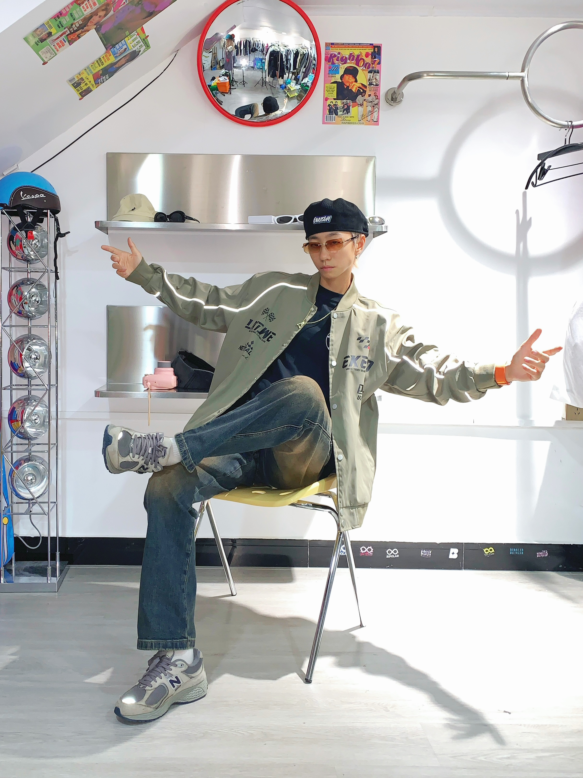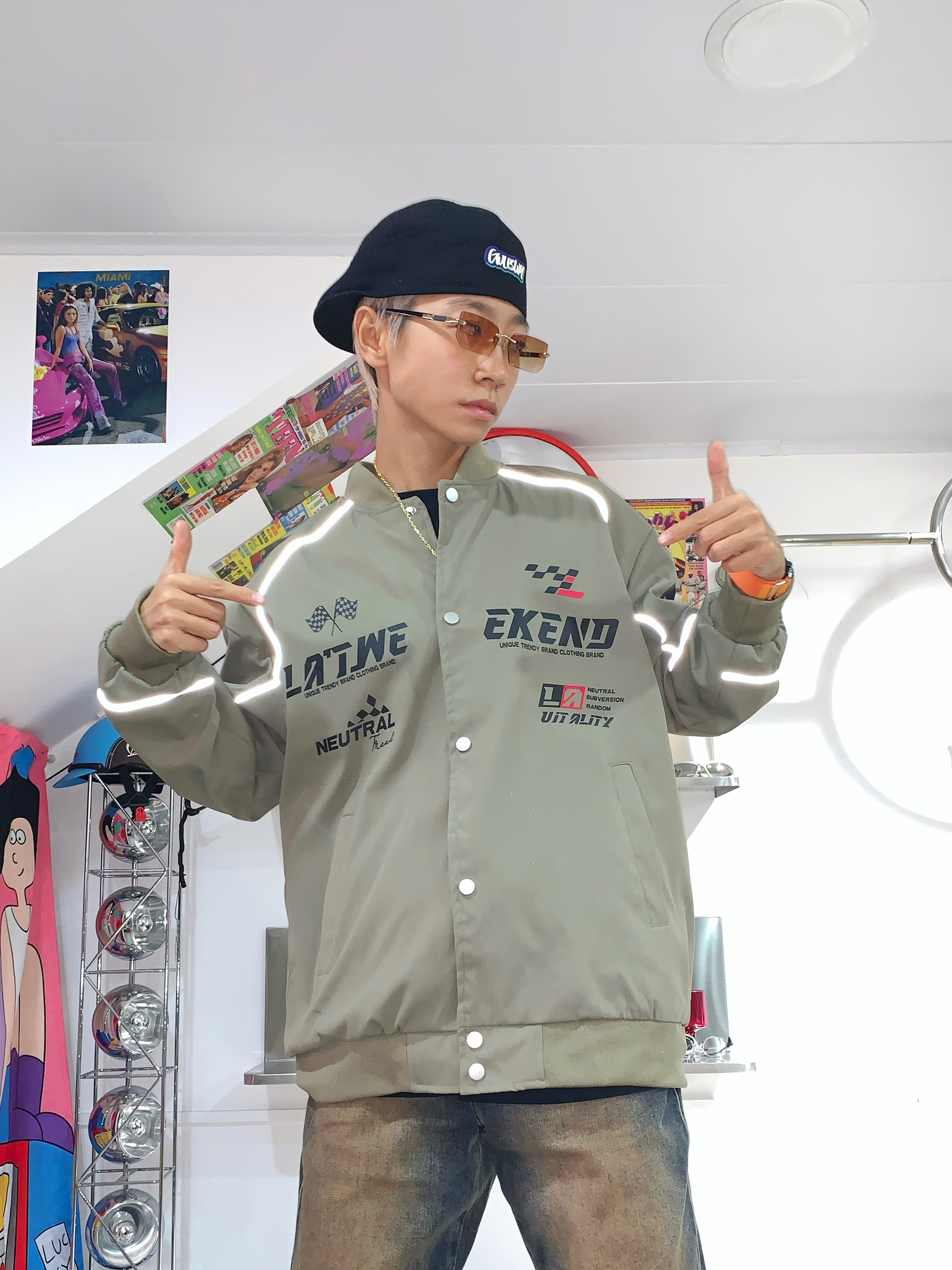 哈喽,欢迎来到哇哇哇穿搭分享频道!168CM|45KG|👔:M 👖:m|👟:39码 耶耶耶 摩托佬穿搭来咯! 军绿色赛车🏁美式复古夹克外套我先穿上咯 内搭黑色短袖 项链戴上 层次感就出来啦 下半身搭配复古牛仔🤠裤 鞋子当然首选复古NB 帽子我看得戴个贝雷帽 墨镜不能少 开学穿这一身 有被帅到啦
