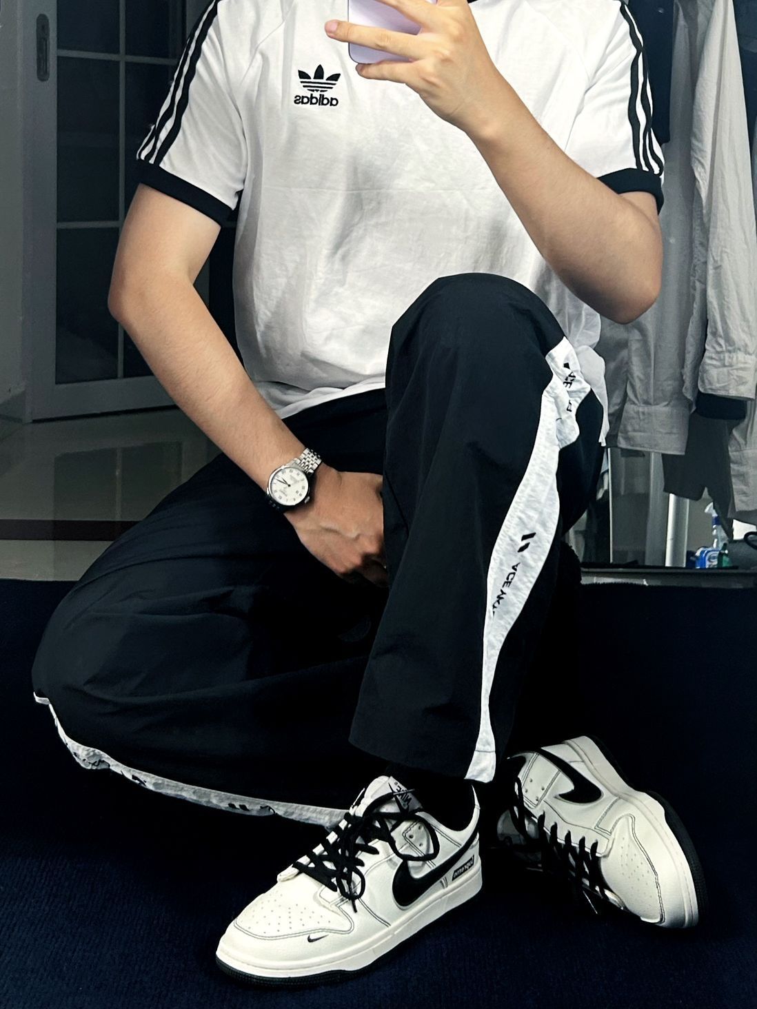 今日份的ootd是熊猫休闲系🍷 黑白真的是百搭天使色,清爽不俗气🍶 🌿衣服: 三叶草小白短 🍀裤子: YK&YB 🌱手表: 天梭力洛克 🌴鞋: Nike Dunk low PANDA