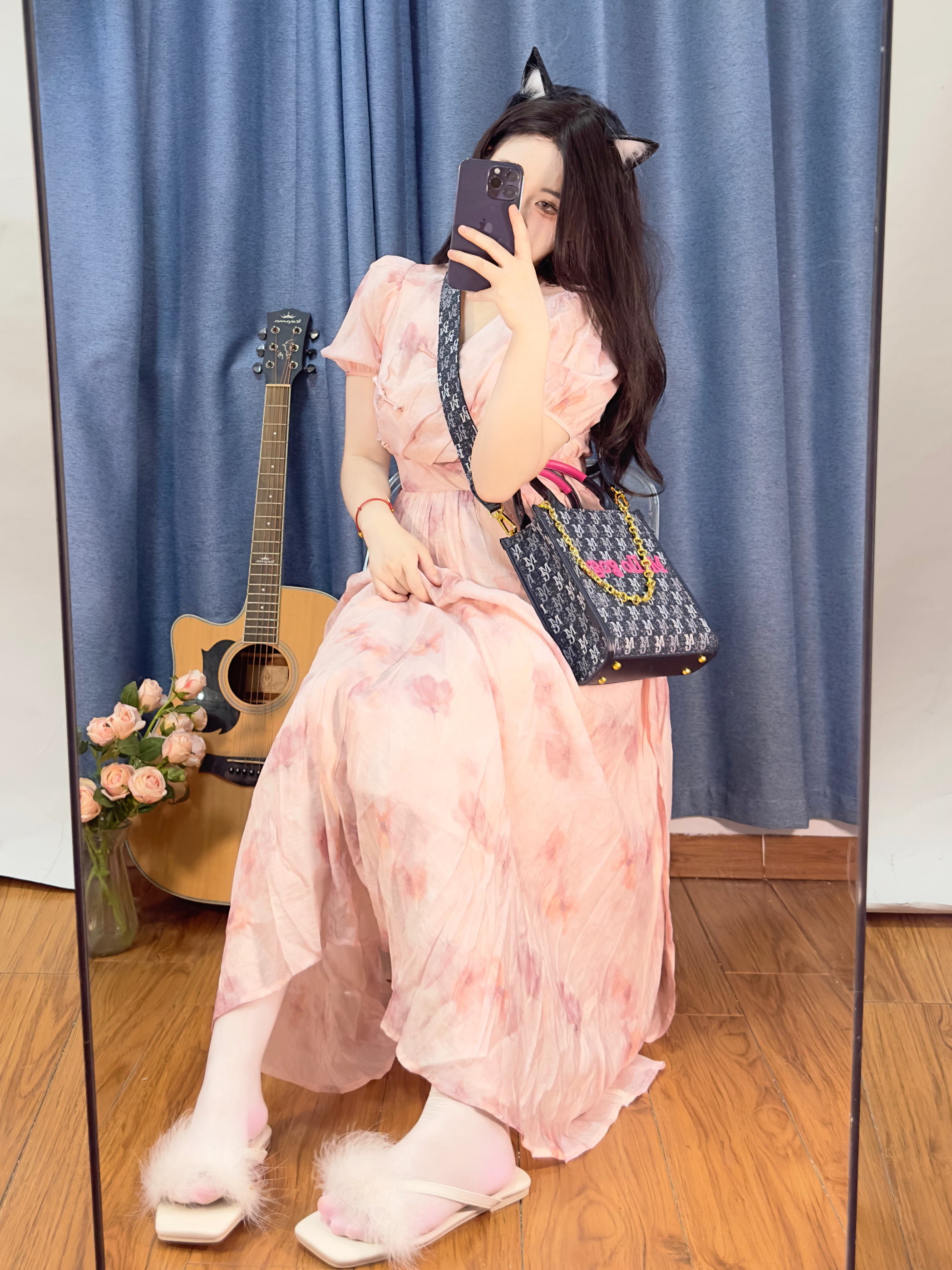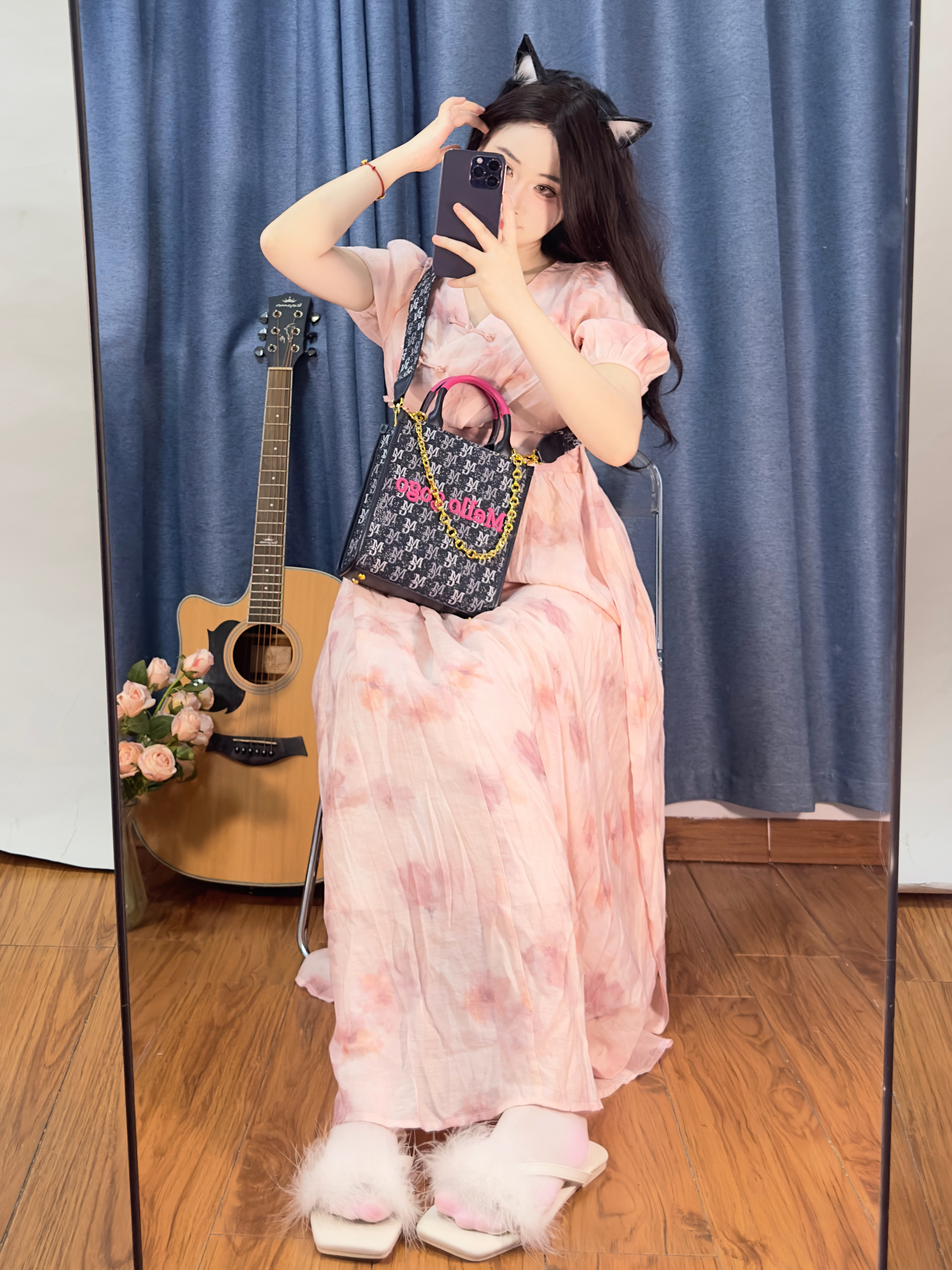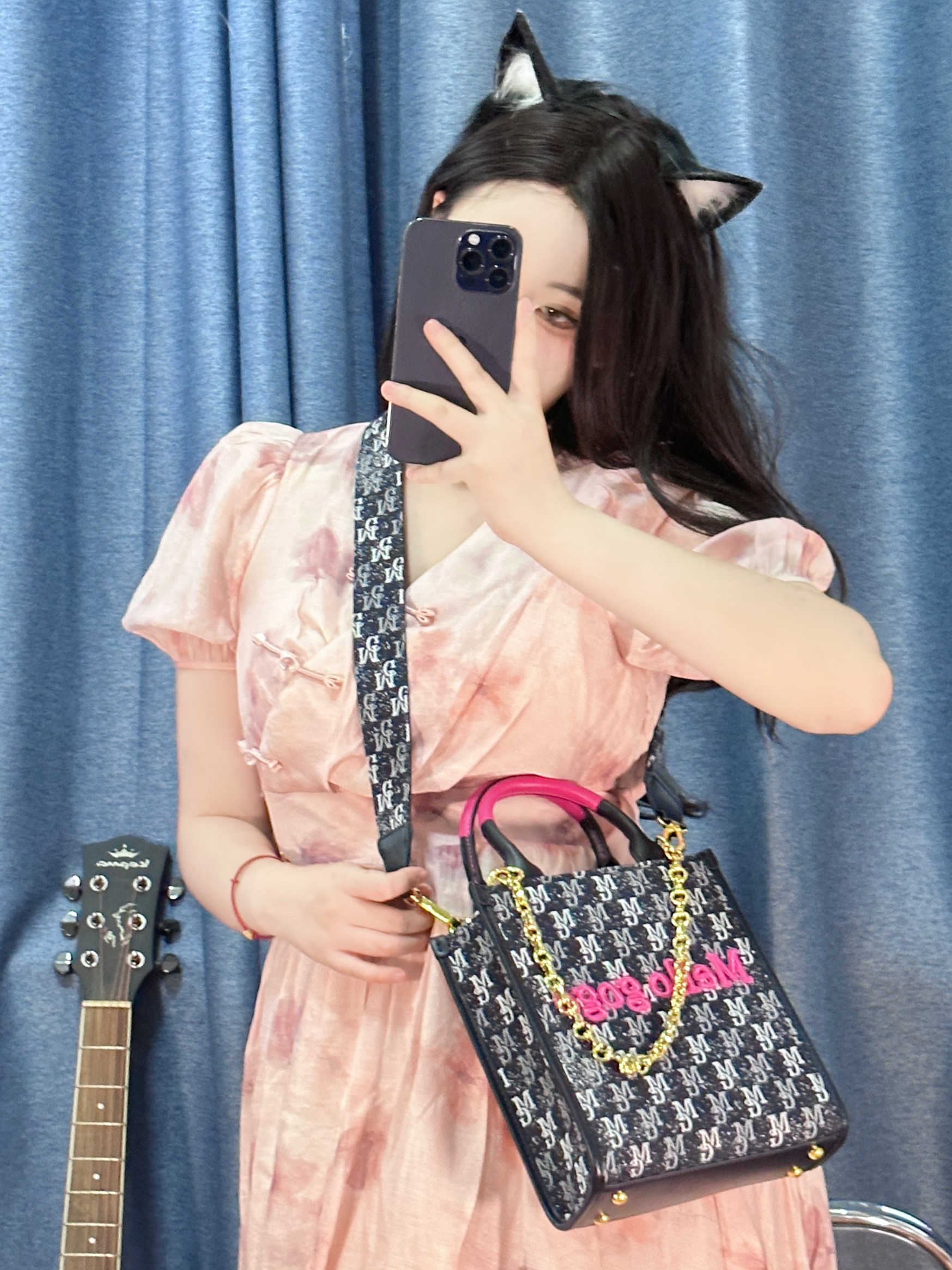 今天Kiki穿这条粉色的连衣裙👗 下面搭配一个羽毛人字拖鞋 ,开学这样穿温柔又大气,感觉再搭配上这个的黑玫配色包包hin不错哦 平时搭配这个大小的包包,小巧又便捷 容量也是够的 而且可以斜挎单肩和手提 平时斜挎着背hin舒服方便呦。 复古感的老花满印图案加上这个经典的玫红色的logo,又酷又甜的感觉😝