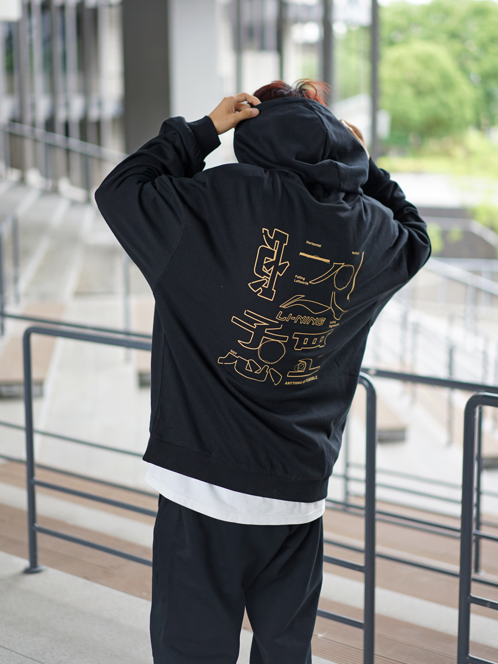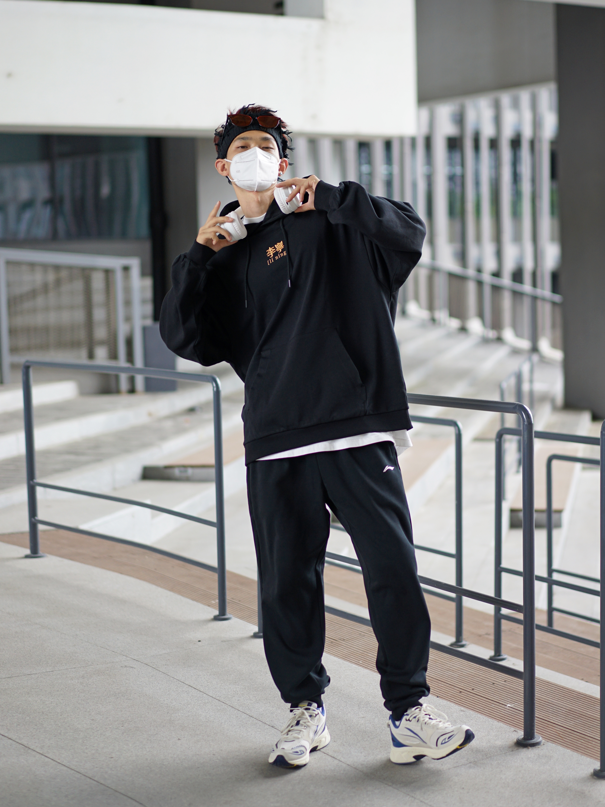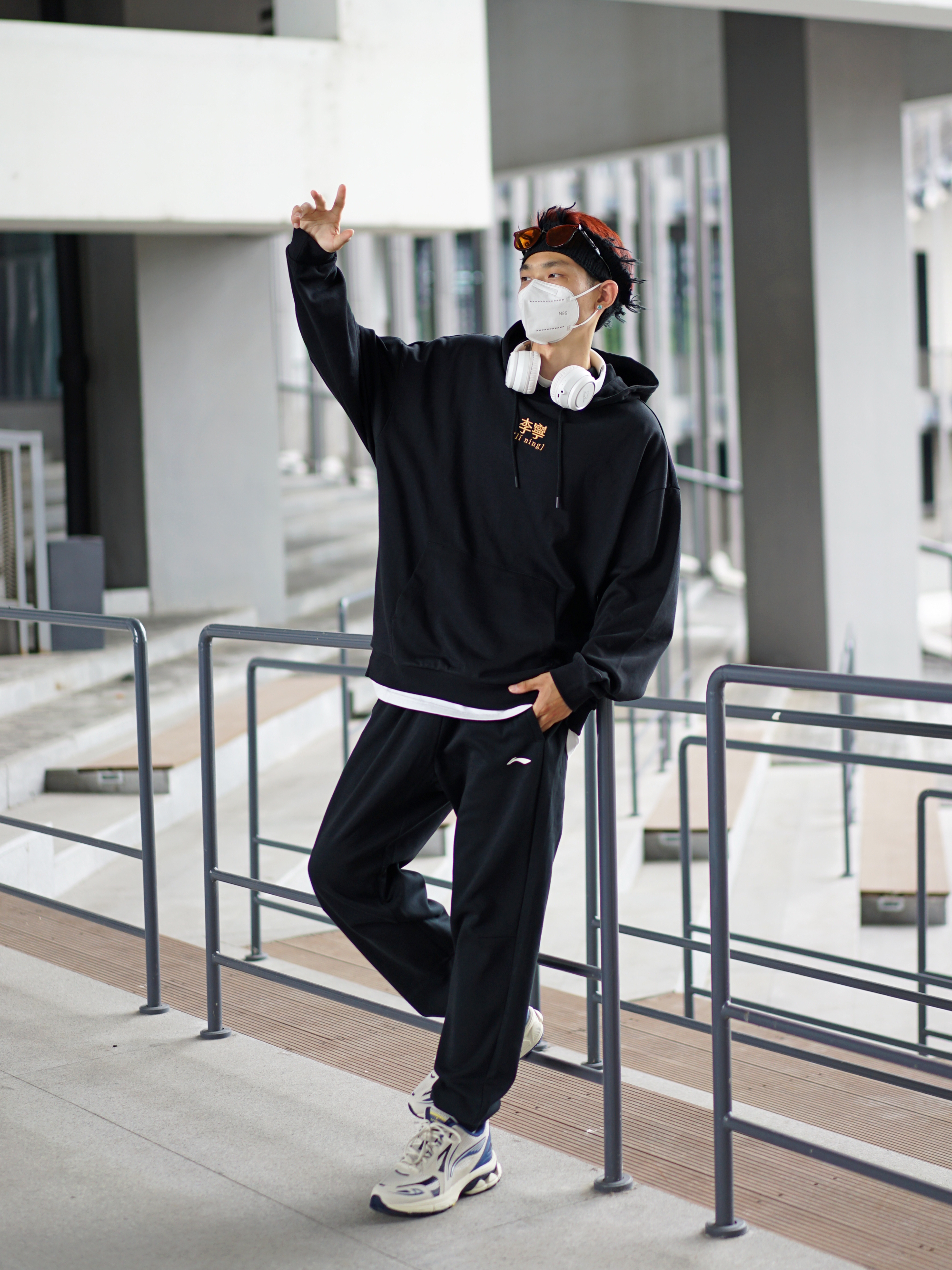 行走于城市街头 ⚫️All black是我的态度 春秋季都挺适合🏃运动的 上身一件李宁的连帽卫衣 胸前的刺绣🪡和背后国风的图案 还是挺有设计感的 搭配一条李宁修身版型的卫裤 简单又随意✨ 再来一双复古的运动鞋 🌈不费力get街头运动风