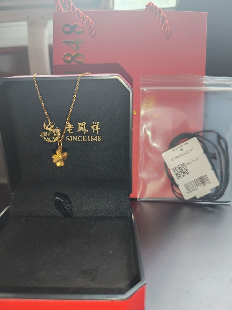 这一款999足金项链是老凤祥的四叶草品牌。老凤祥一直都是让人放心的一个品牌。 这款项链上身效果很不错,大小有一个指甲盖差不多大。 磨砂手感的品质,颜色也是闪亮闪亮的,在阳光下会闪,很漂亮。 价格来说也不是很贵,正常的金价,因为克数不大,所以会便宜一点,送亲人,送好朋友都可以选择这一款。 你可以搭配不同的链子,等这款戴腻了,买其他黄金时,可以用来克减,还是很经济的。