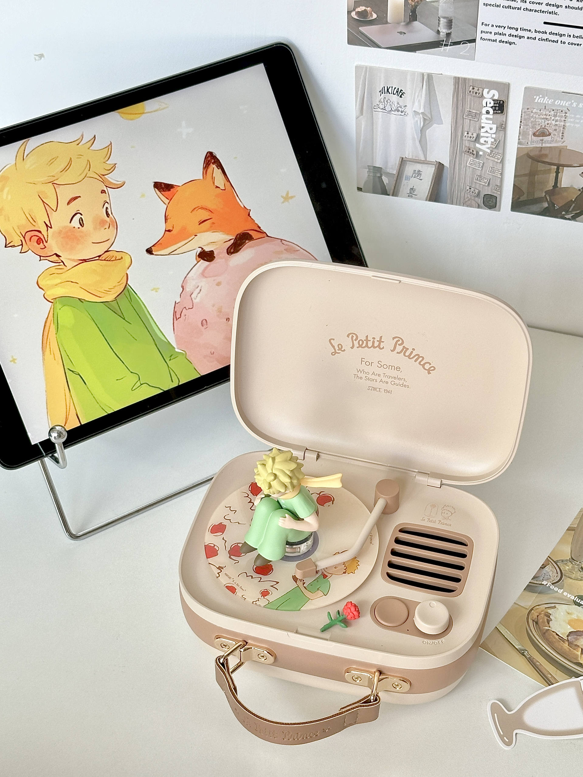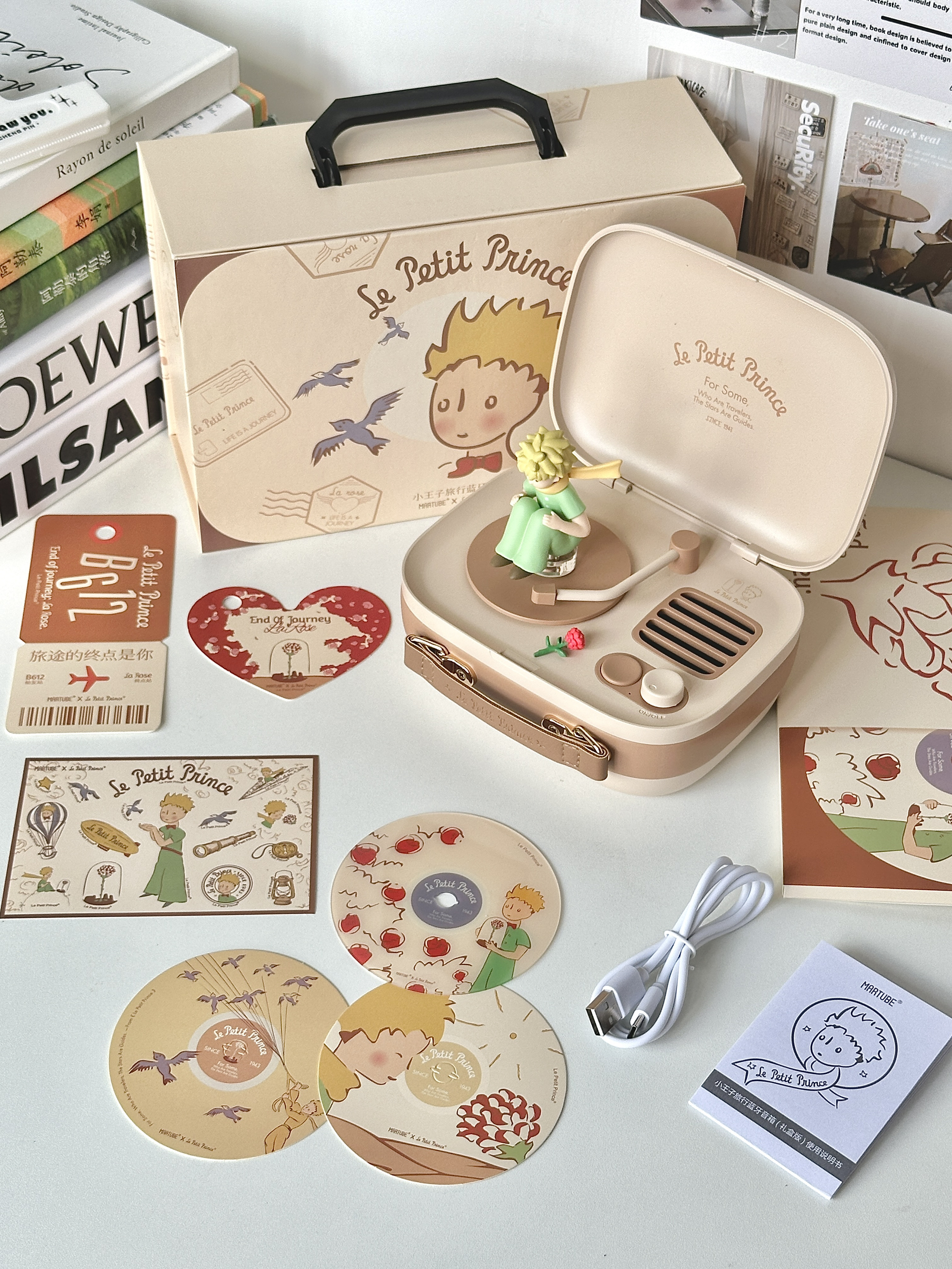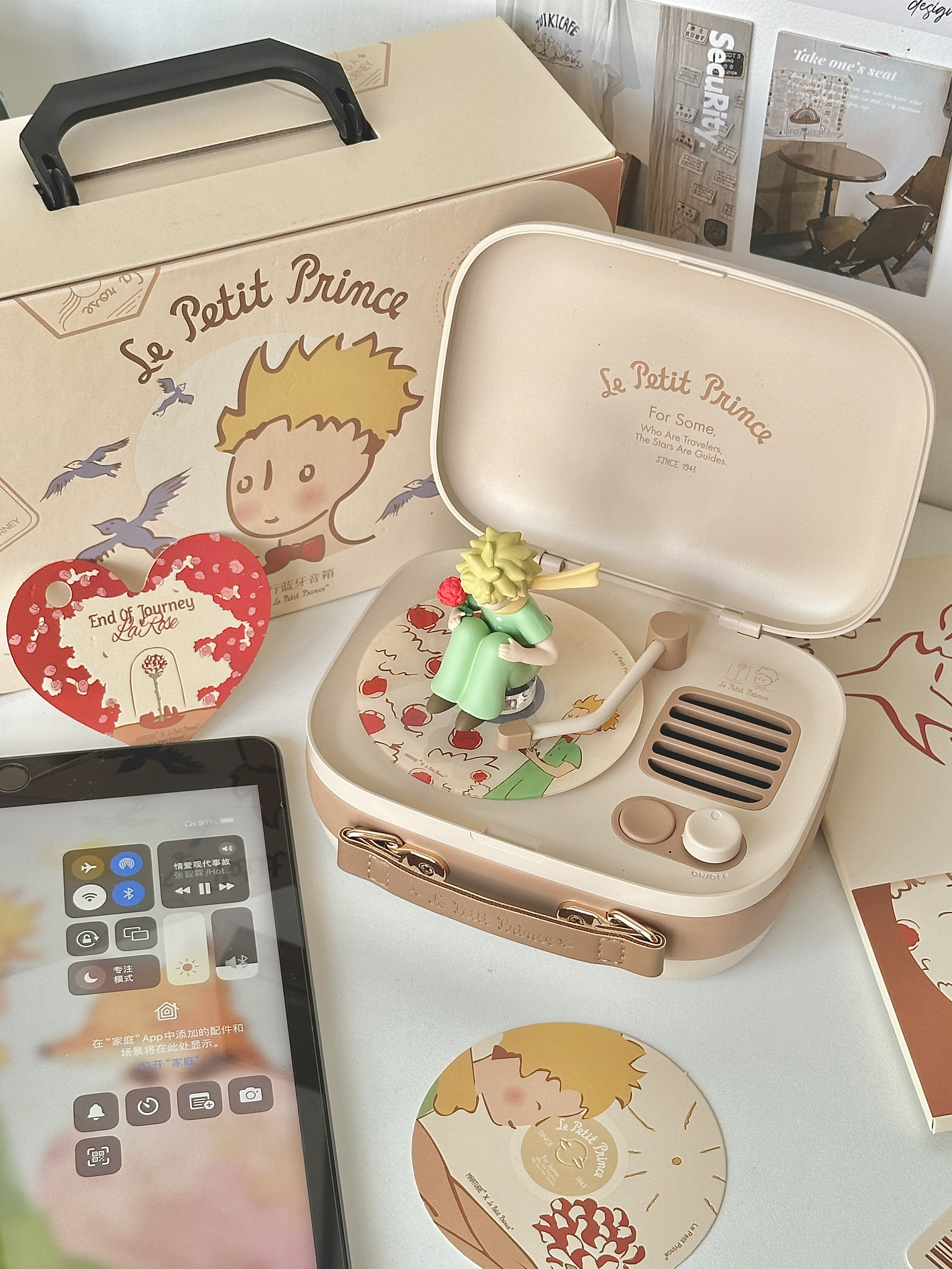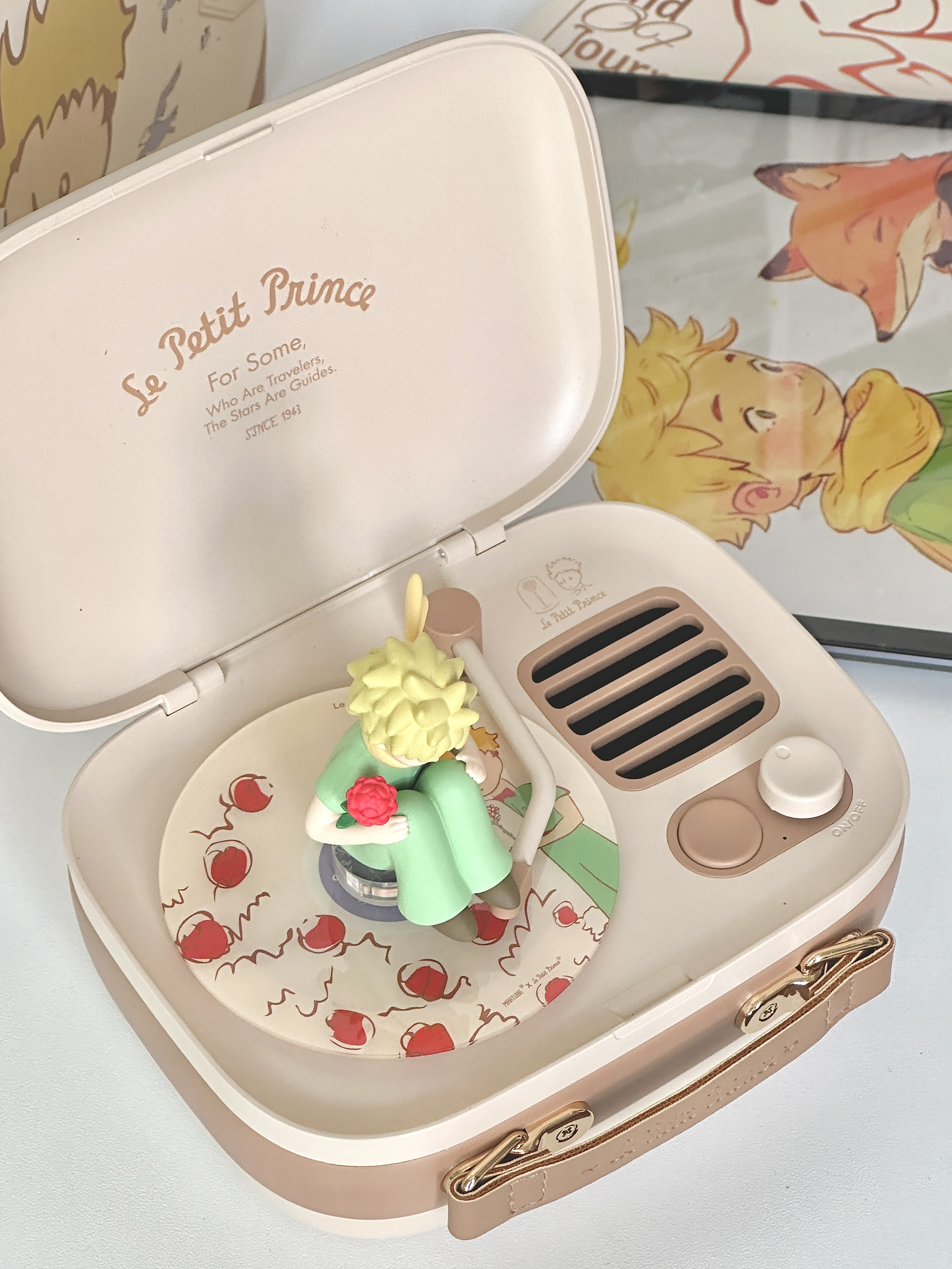 是马克图布✖️小王子滴联名噢 打开就是个行李箱造型的音响~~ 有三个可替换的cd片 播放音乐的时候还会转动 呜呜😢真的很不错 还有氛围灯 试了一下音质也不输千元产品 礼盒还是能手提的那种 拎出去送人简直不要太好看了!!!