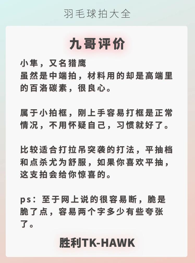 小隼,又名猎鹰,型号是TK-HAWK 属于中端进攻拍 推荐星数 详细解析看图3、4 包含打感和配什么线比较好 你有更喜欢的线也可以写下