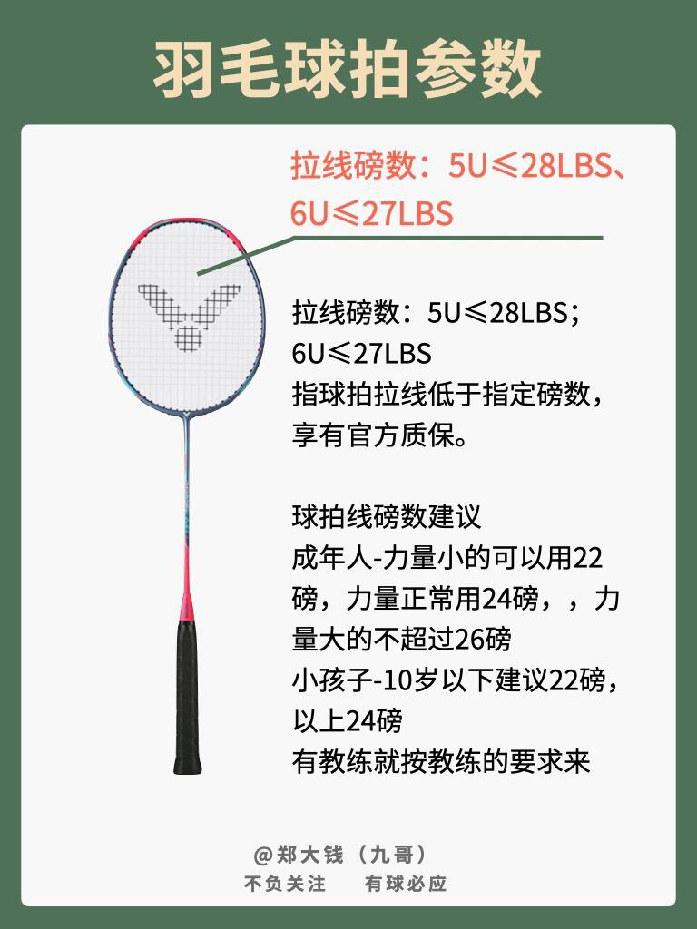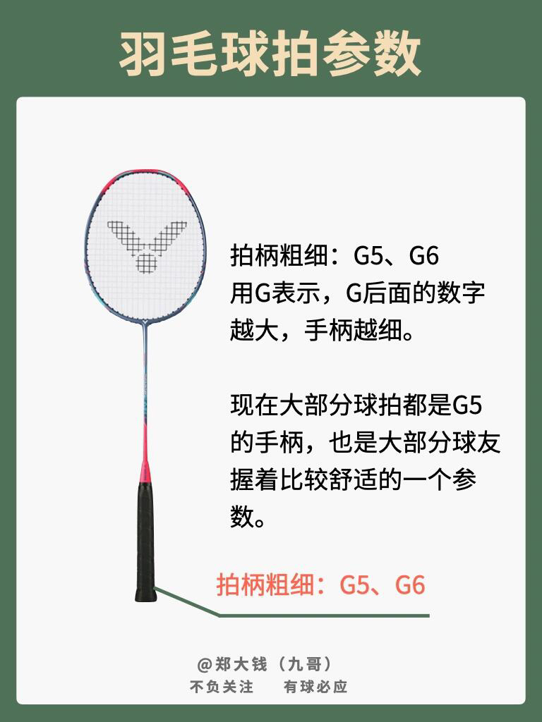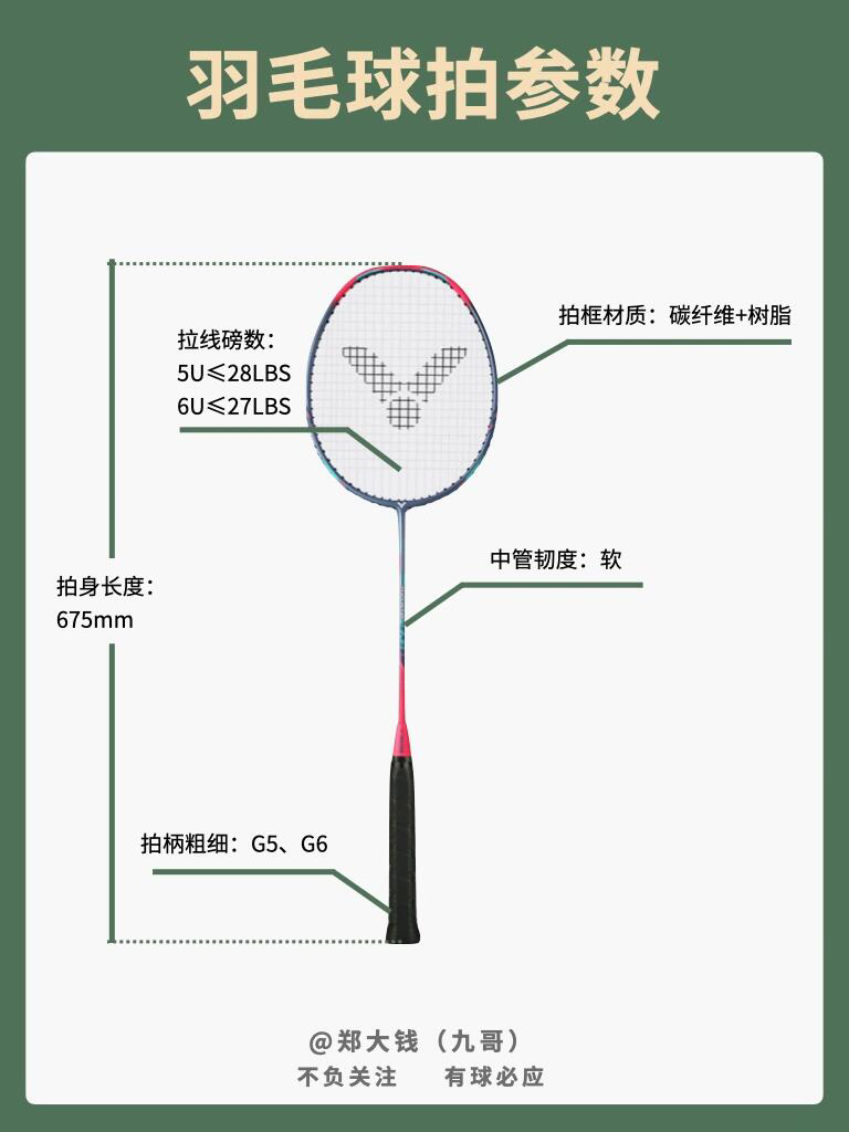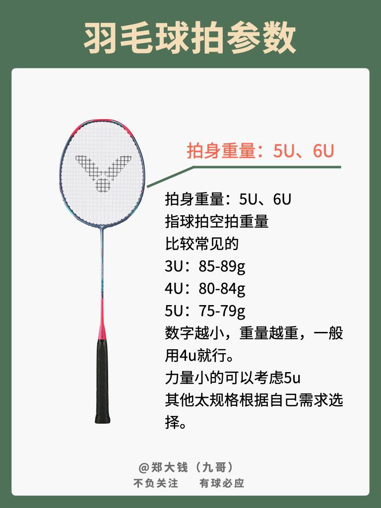 今天来复习一下羽毛球拍的各项参数 以小铁锤的参数来举例子 拍框材质:碳纤维+树脂 拍杆材质:碳纤维+树脂+7.0 SHAFT 拍身重量:5U、6U 拍身长度:675mm 拍柄粗细:G5、G6 中管韧度:软 拉线磅数:5U≤28LBS、6U≤27LBS 平 衡 点:- 首先球拍材质方面,全碳素球拍是基本 拍身重量:5U、6U 指球拍空拍重量,比较常见的 3U:85-89g、4U:80-84g、5...
