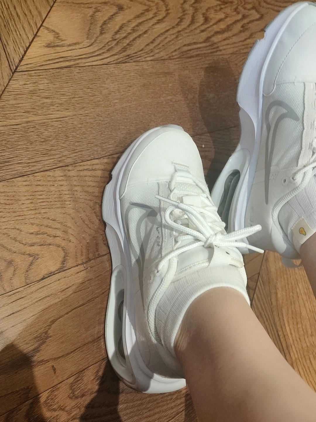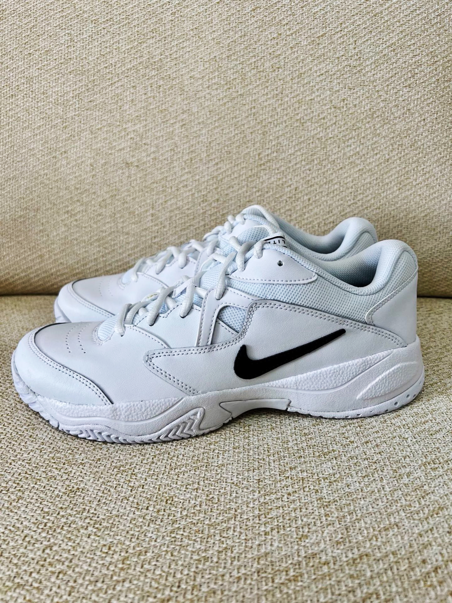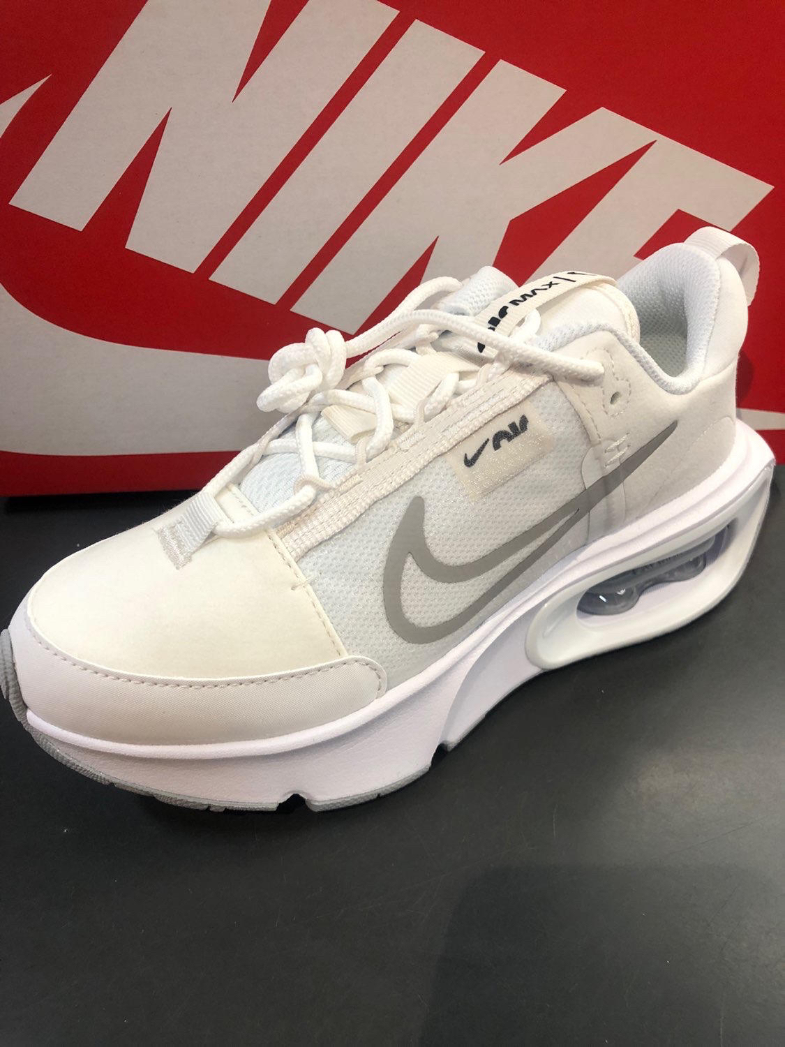 鞋子整体外观干净的白色搭配增高鞋底,真的难以拒绝。 鞋子用了织物和合成革材质,整体舒适透气,鞋身侧灰色swoosh增加了鞋子层次感,而且很高级。后跟鞋底添加了上下叠加气垫,让脚感更舒适。