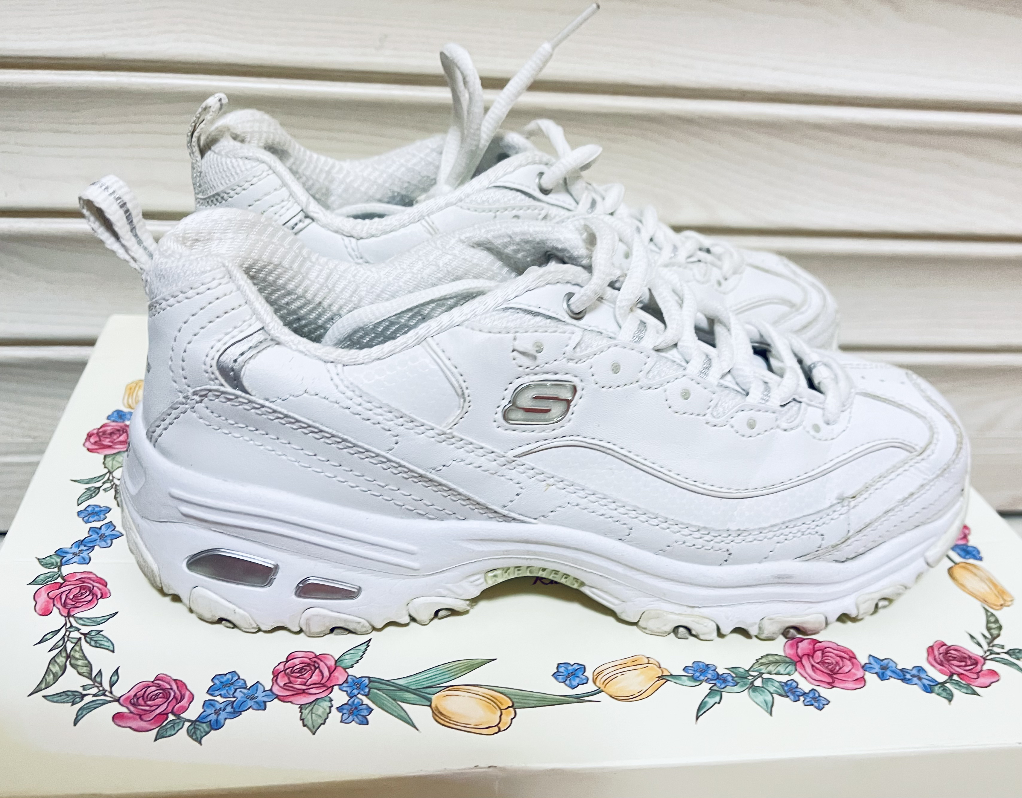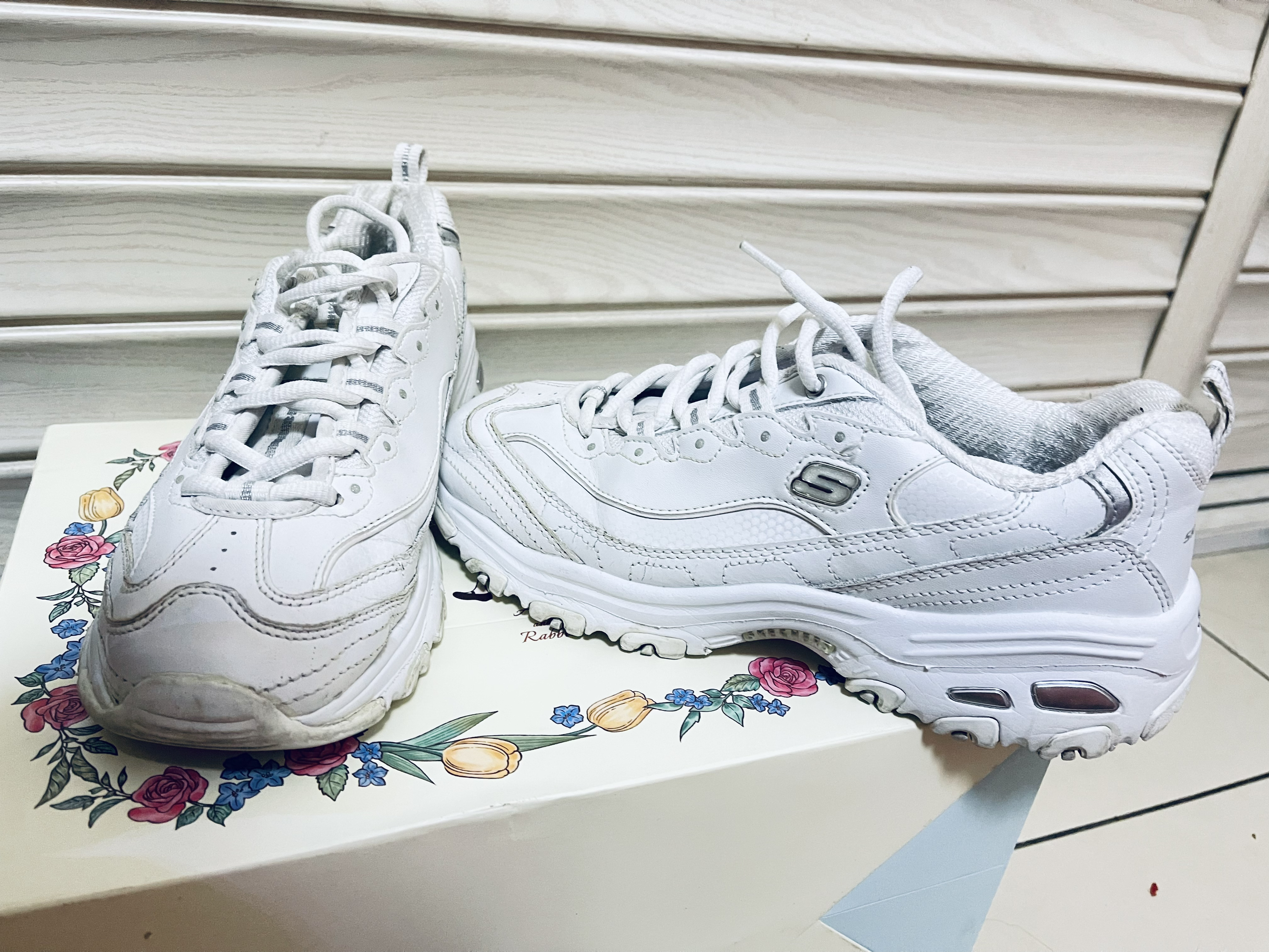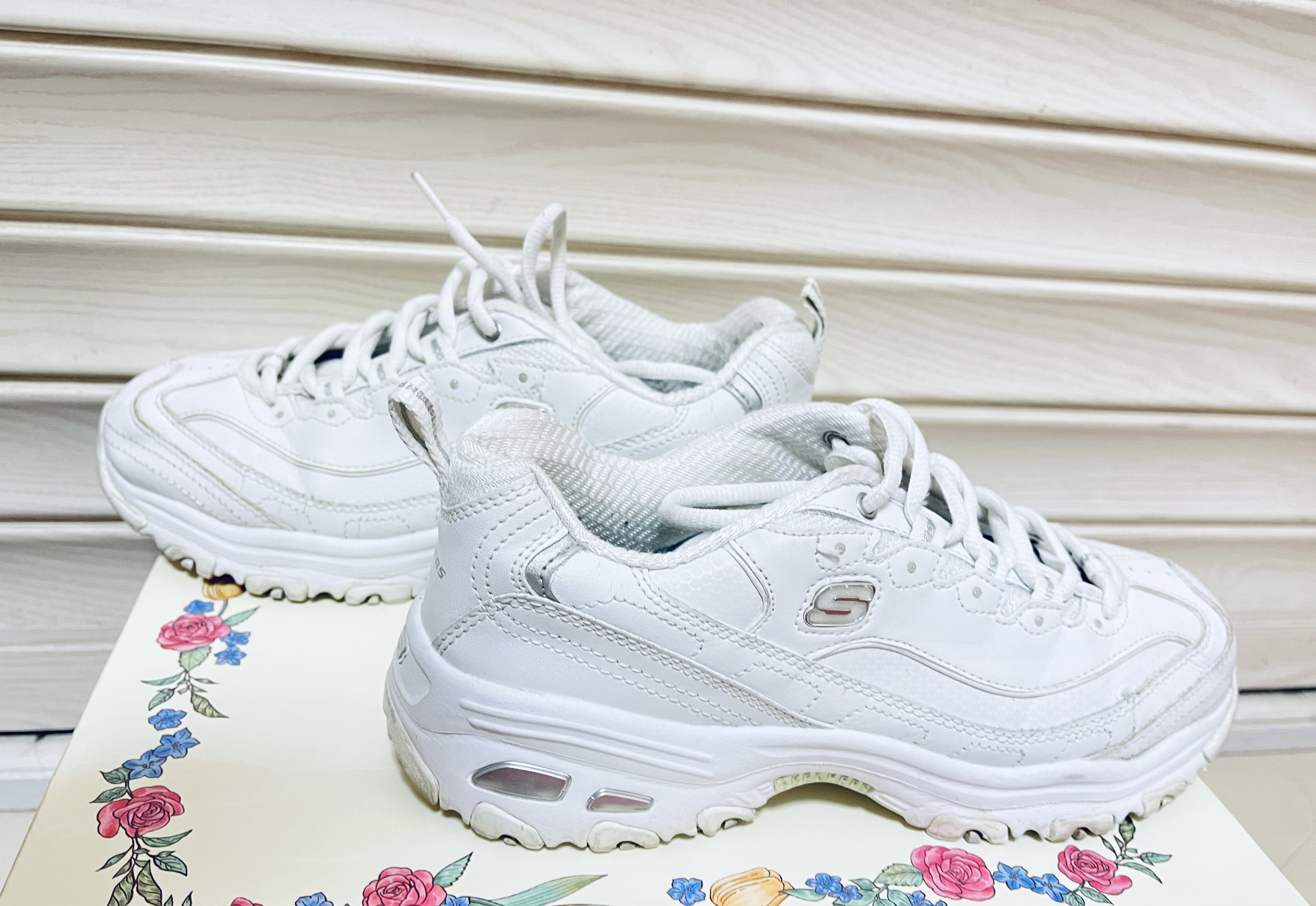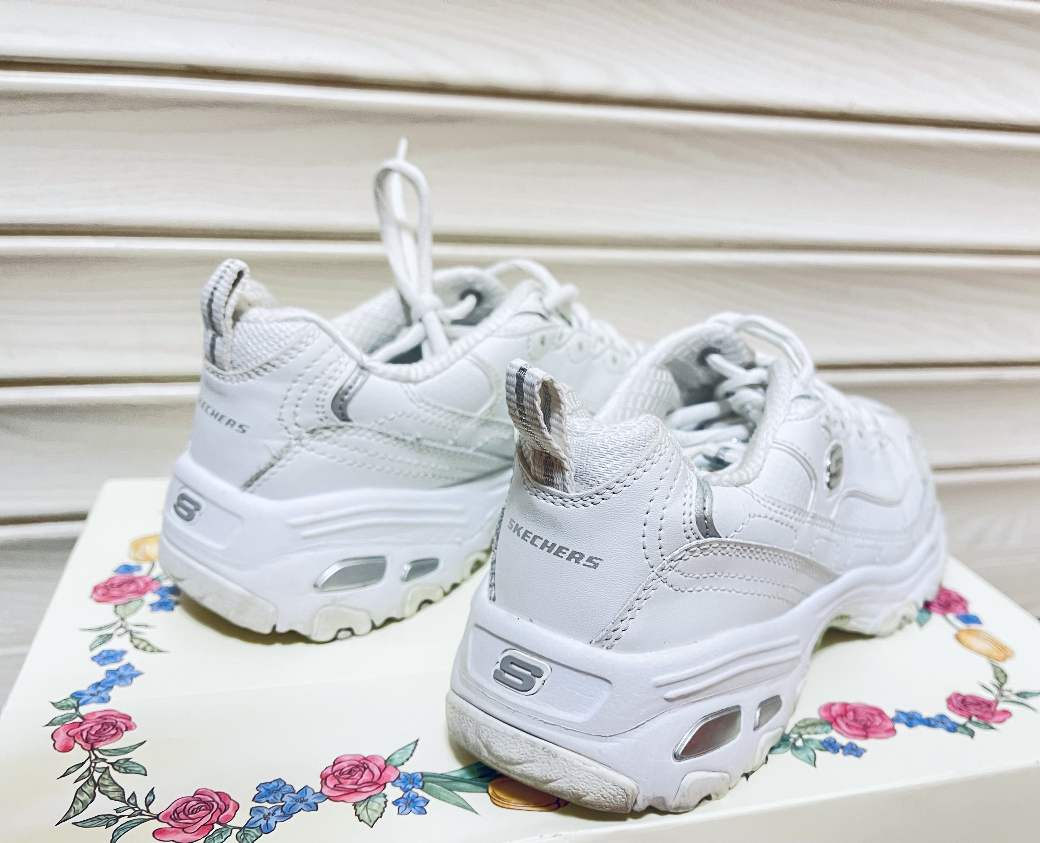 😎Skechers/斯凯奇 D'Lites 1.0 老爹鞋简直美炸啦👟! ✨女款的 White/Silver 配色,纯白的设计超级清新😜。 🎈厚底增高的款式,瞬间拉长腿部线条,显高又显瘦。 👏复古的风格,怎么搭都好看,时尚感爆棚。轻松打造出各种不同风格的穿搭。 💥穿上它,走在街上你就是最靓的崽。 🥳送女朋友的、爱美的姐妹们赶紧冲呀😎!