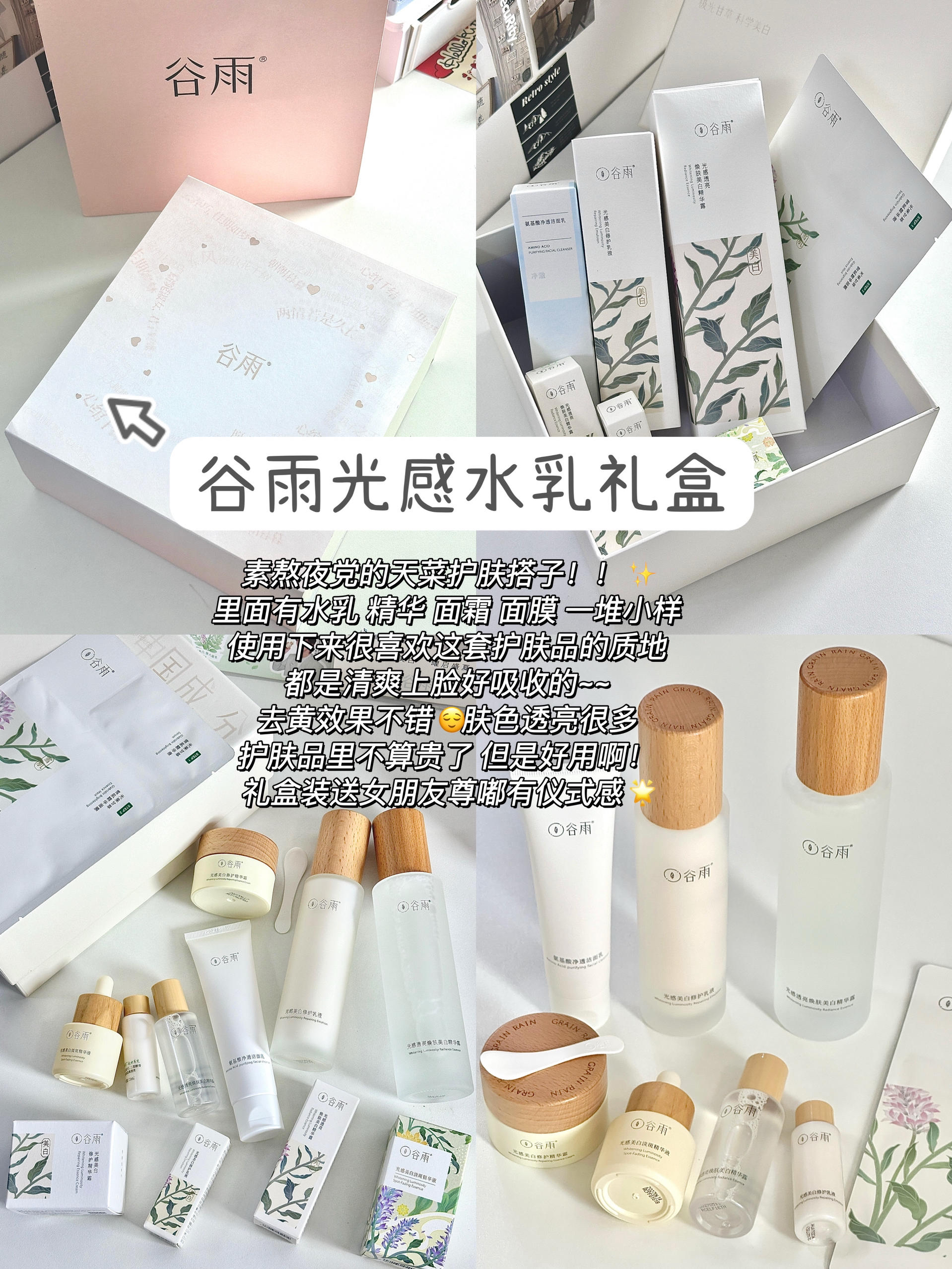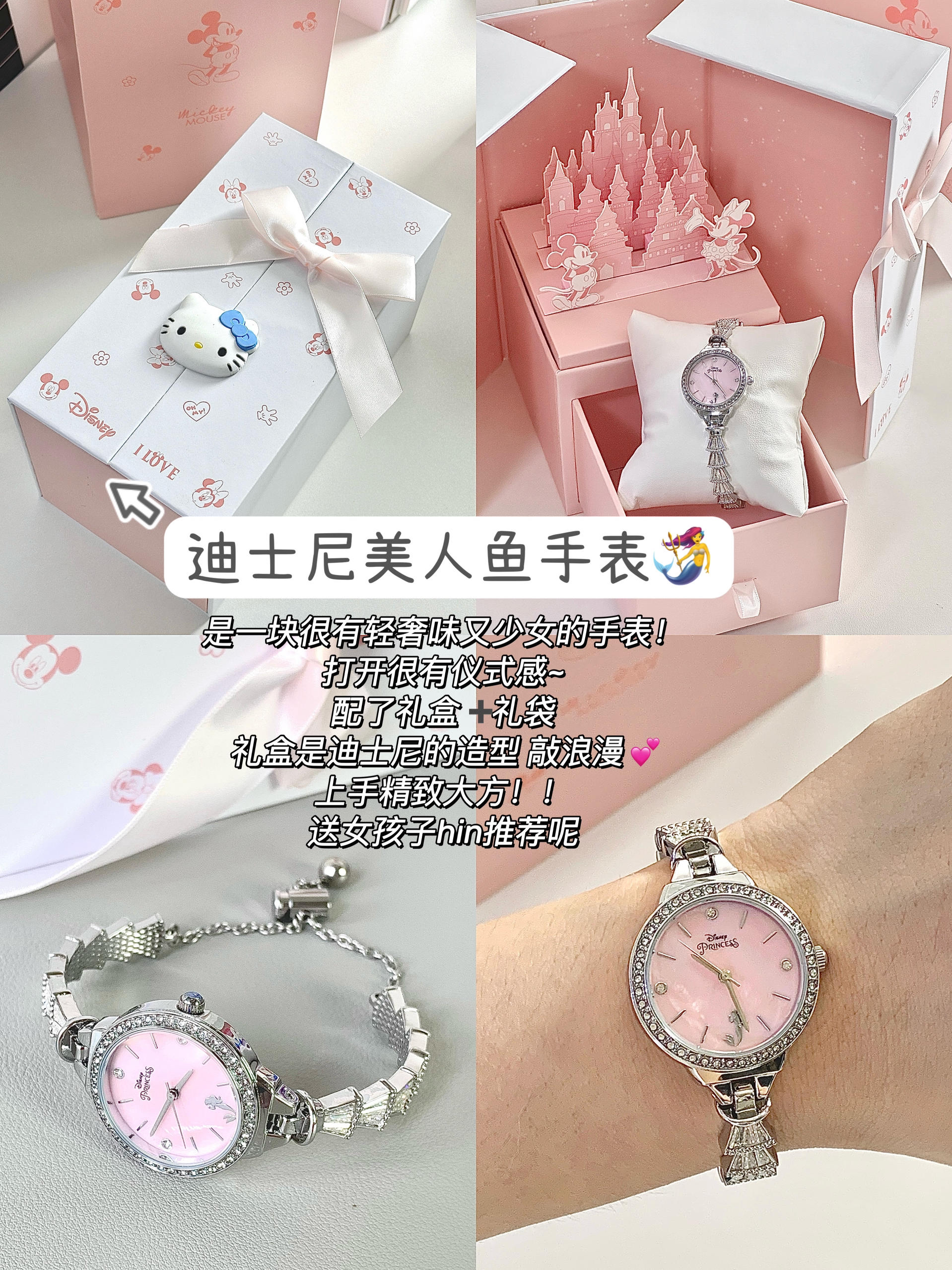 临近开学啦~ 给大家分享几个适合送女孩子的礼物! 谷雨光感水乳礼盒🎁 这个礼盒礼袋包装就很喜欢 少女心满满 里面有水乳 面霜 面膜 精华 一堆小样 本人混油皮 用这一套很清爽舒适 平常爱喝奶茶🥤爱熬夜…皮肤比较偏黄 一套用下来一段时间 有好转 🤩护肤品里不算贵 但好用! 拿下礼盒装送女友很实用贴心~~ 迪士尼美人鱼手表🧜♀️ 礼盒礼袋都有 打开是城堡🏰的立体造型 表盘是渐变粉色的~ 是很浪漫...
