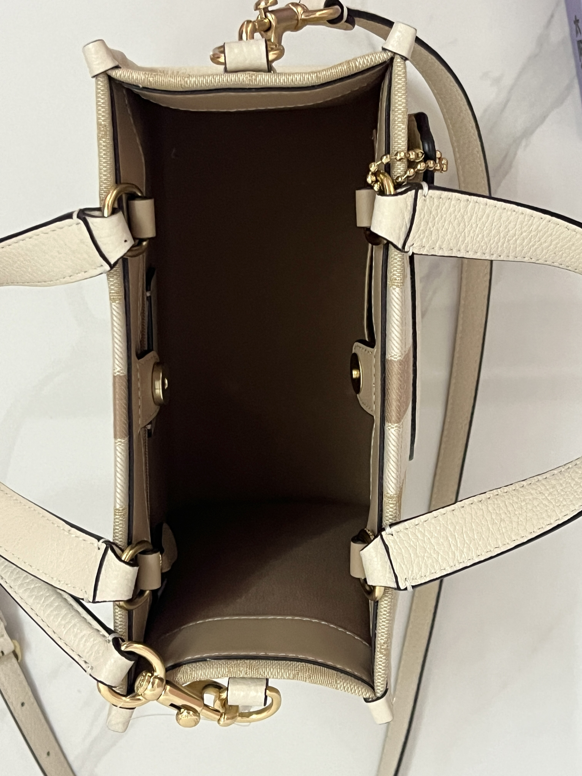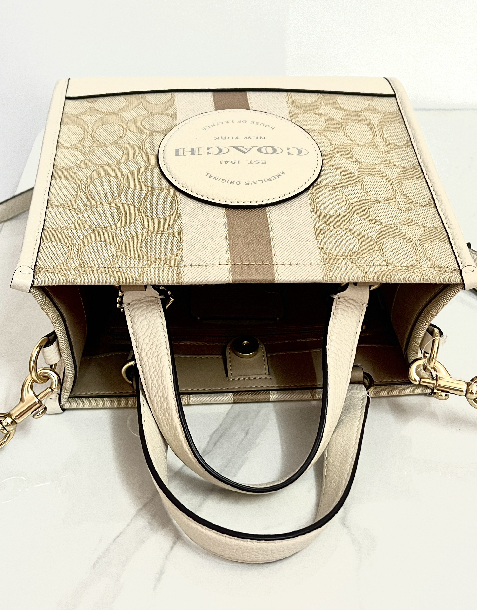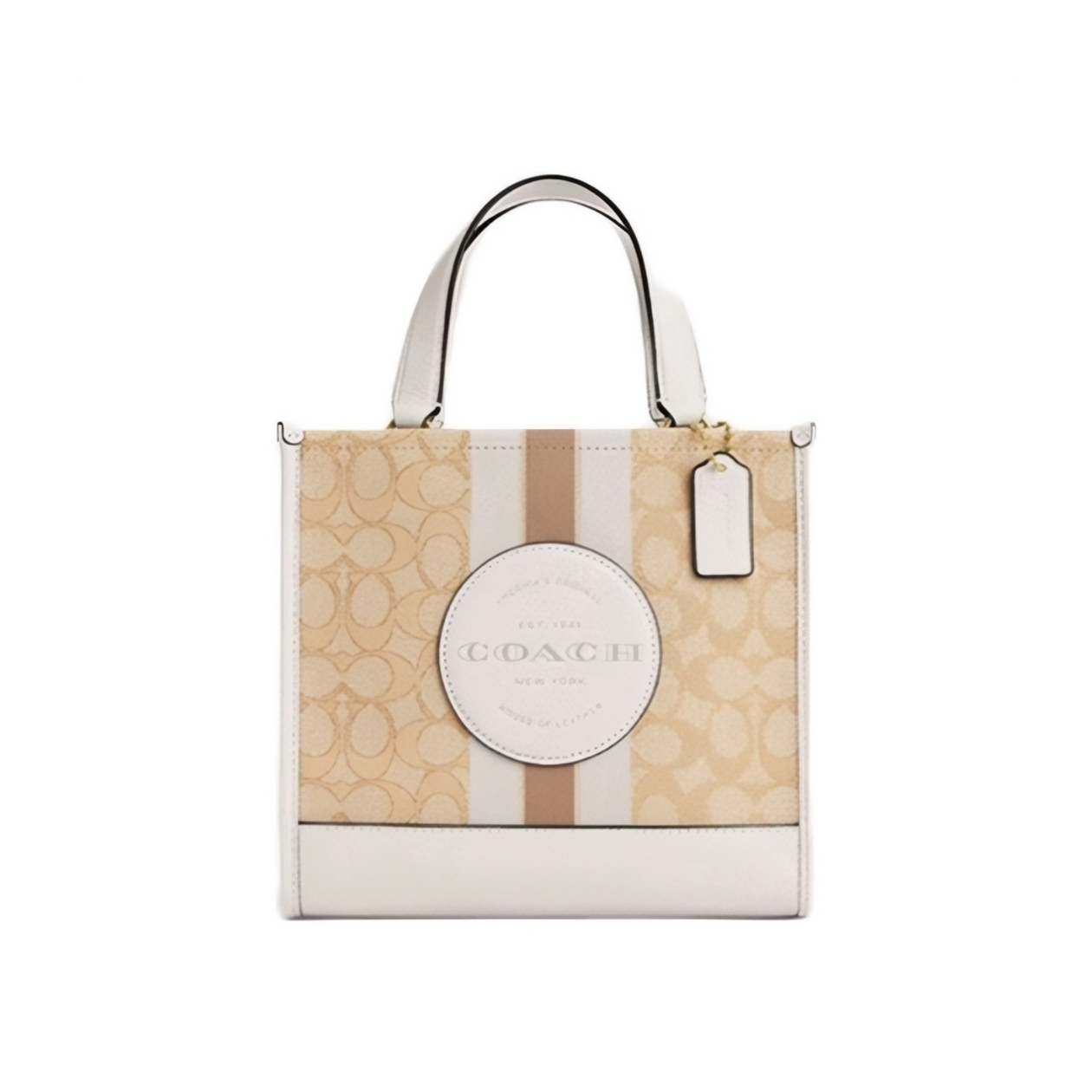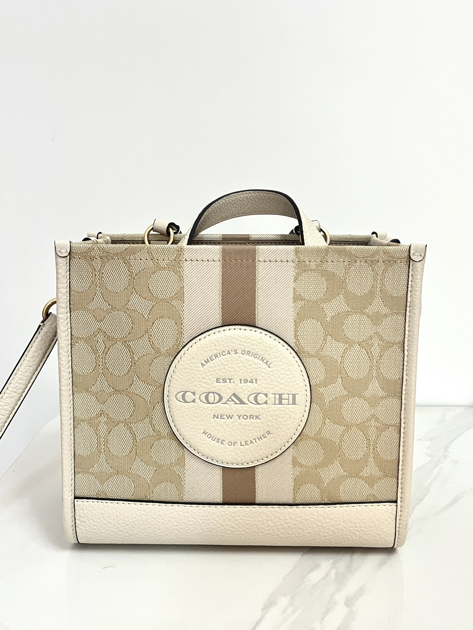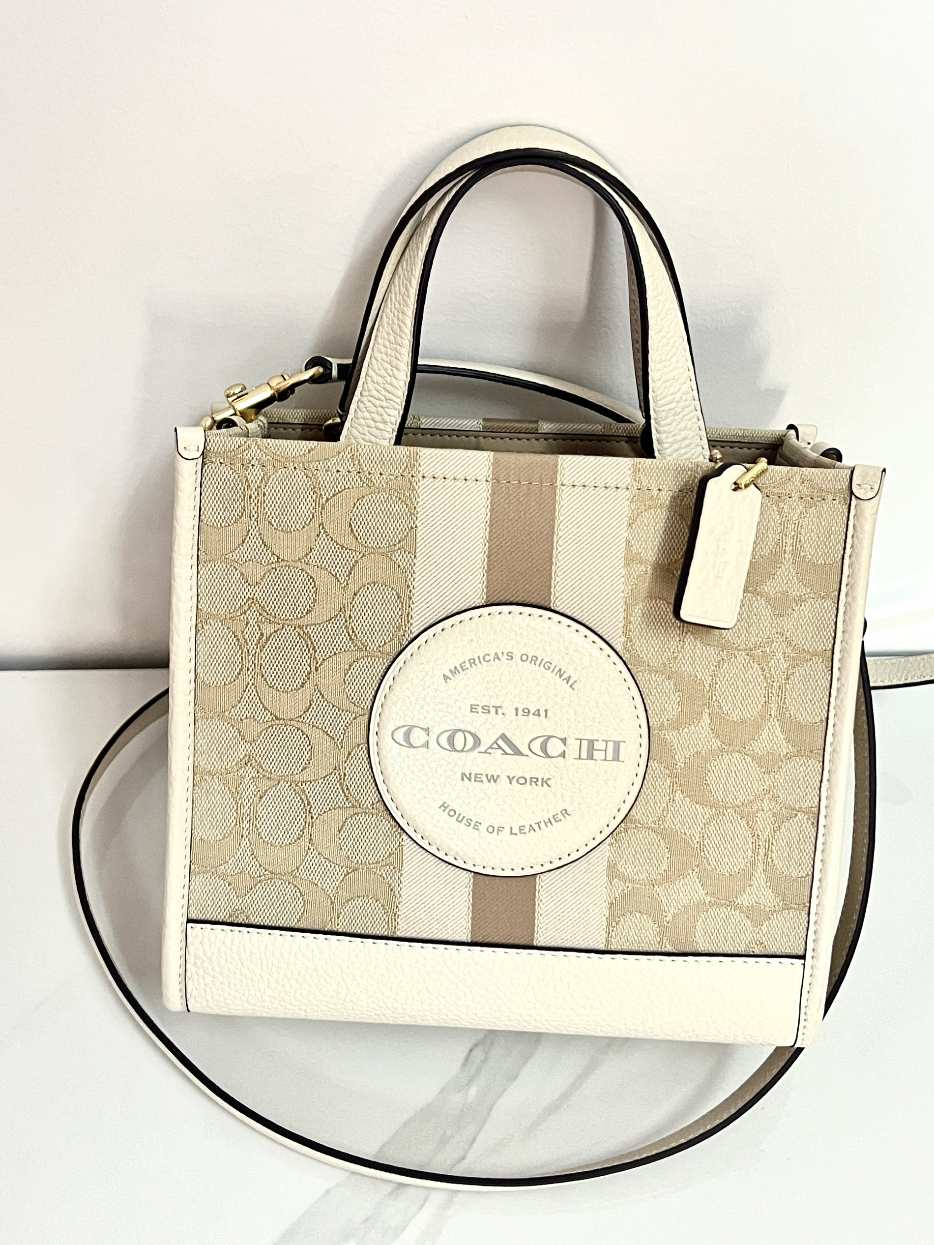 本篇笔记关联了Coach/蔻驰 Dempsey 22 小号 老花条纹Logo贴饰 织物配牛皮革托特包购物袋单肩斜挎手提包 浅卡其配白色等商品,为用户提供真实的使用体验和购买参考。