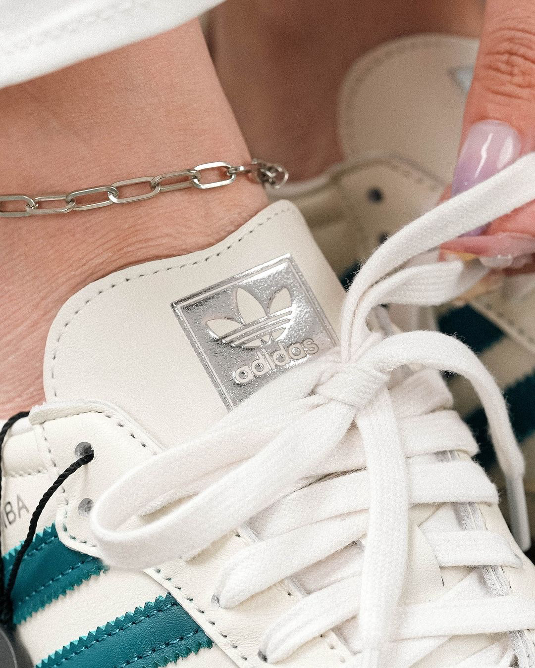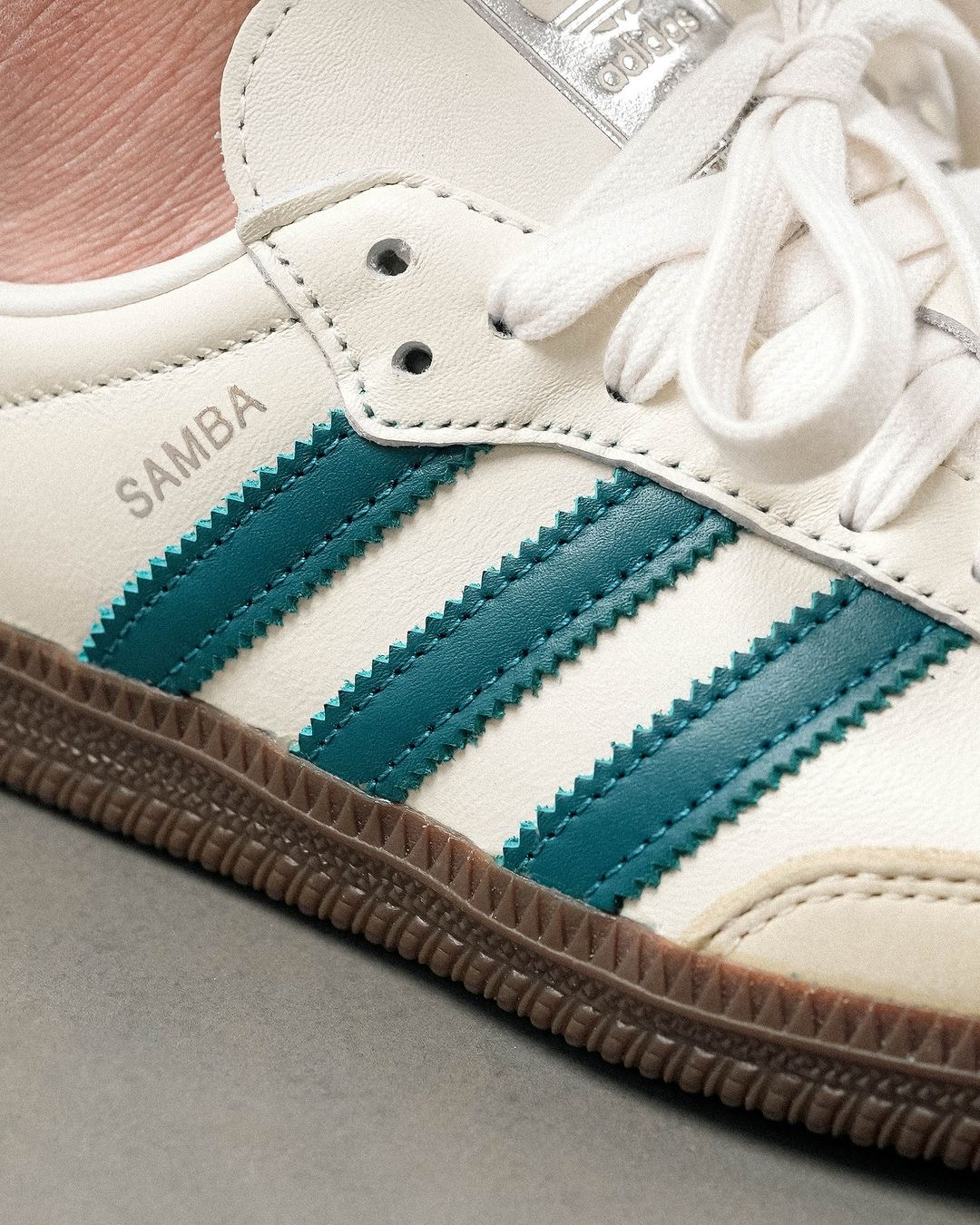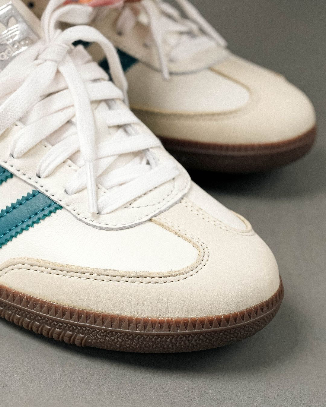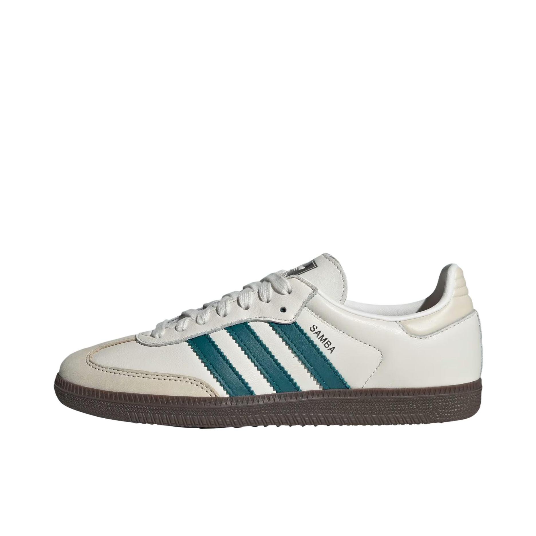 Adidas Samba OG White Legacy Teal 优雅的奶油皮革上引人注目的青绿色口音给人一种别致的运动效果。这种清新的颜色组合将为你的三条纹系列做一个声明