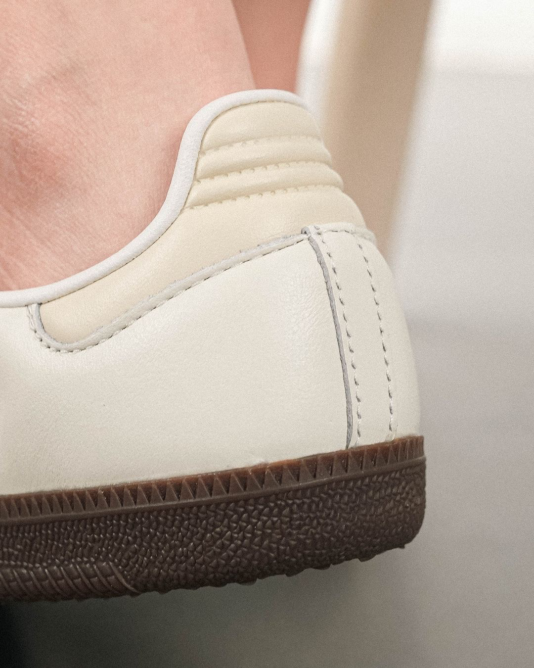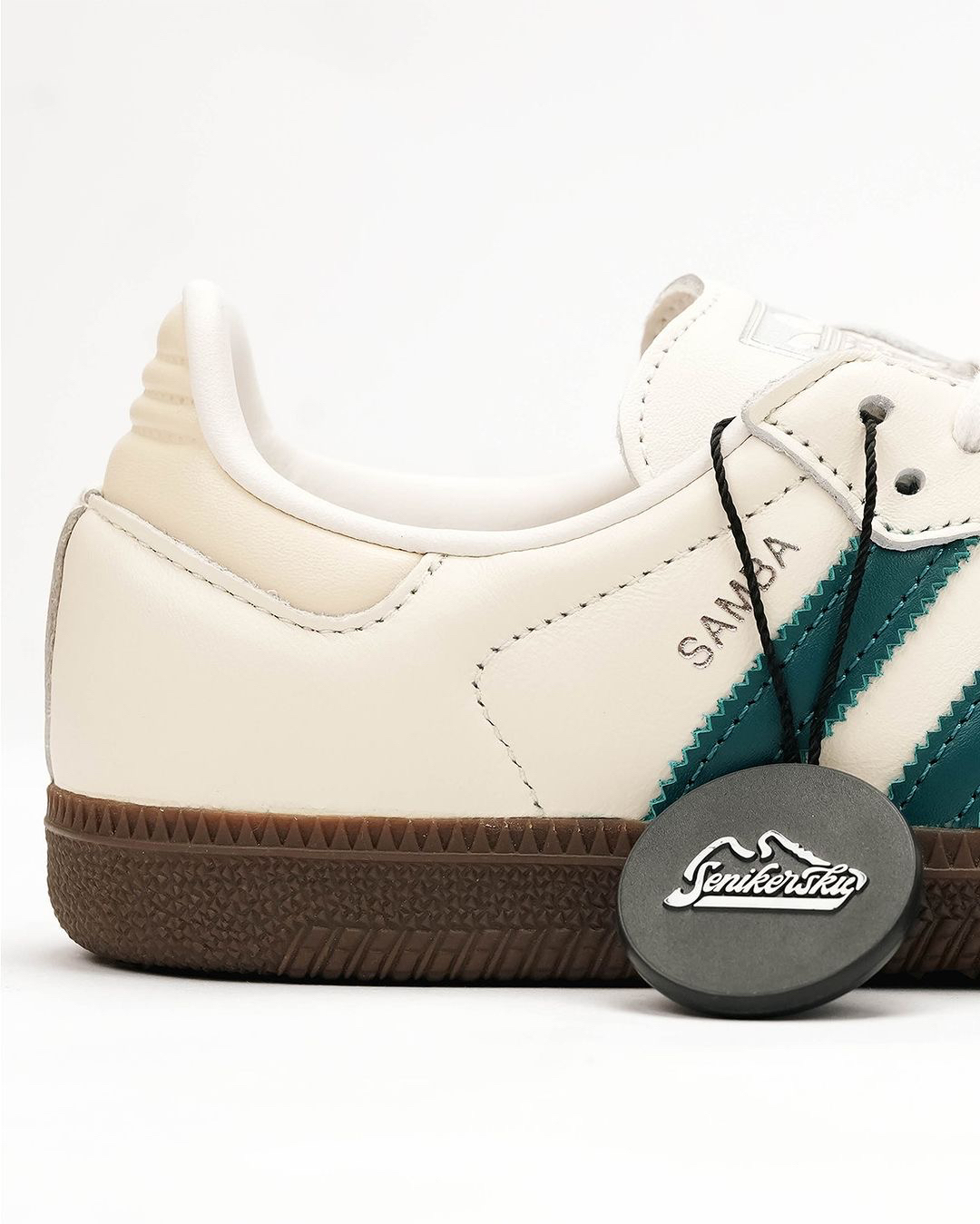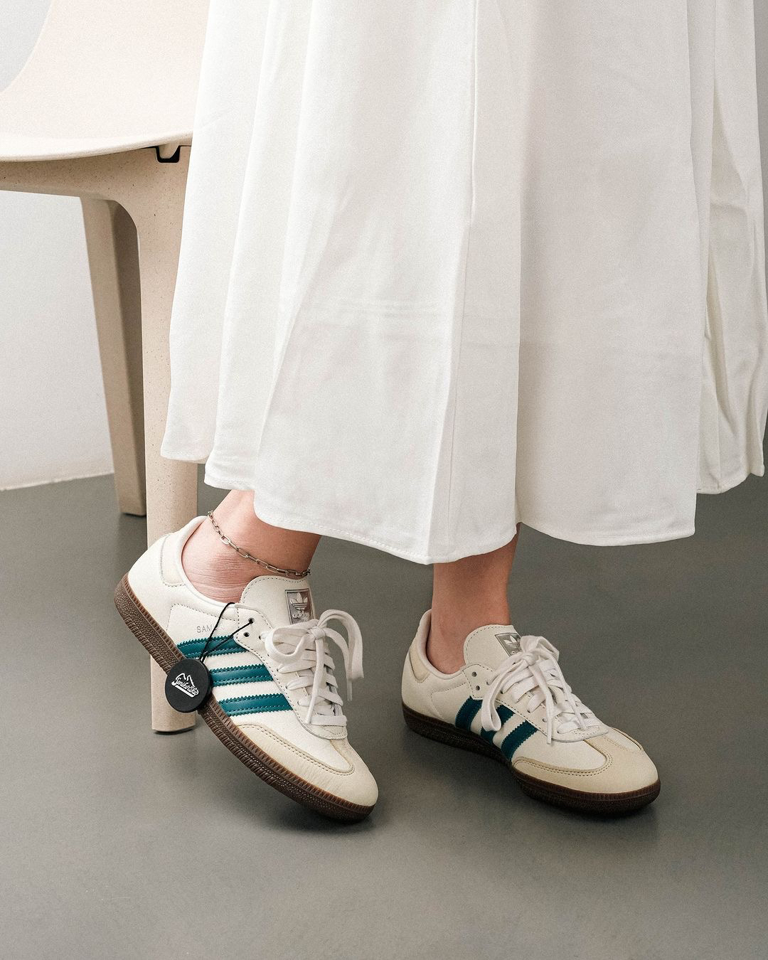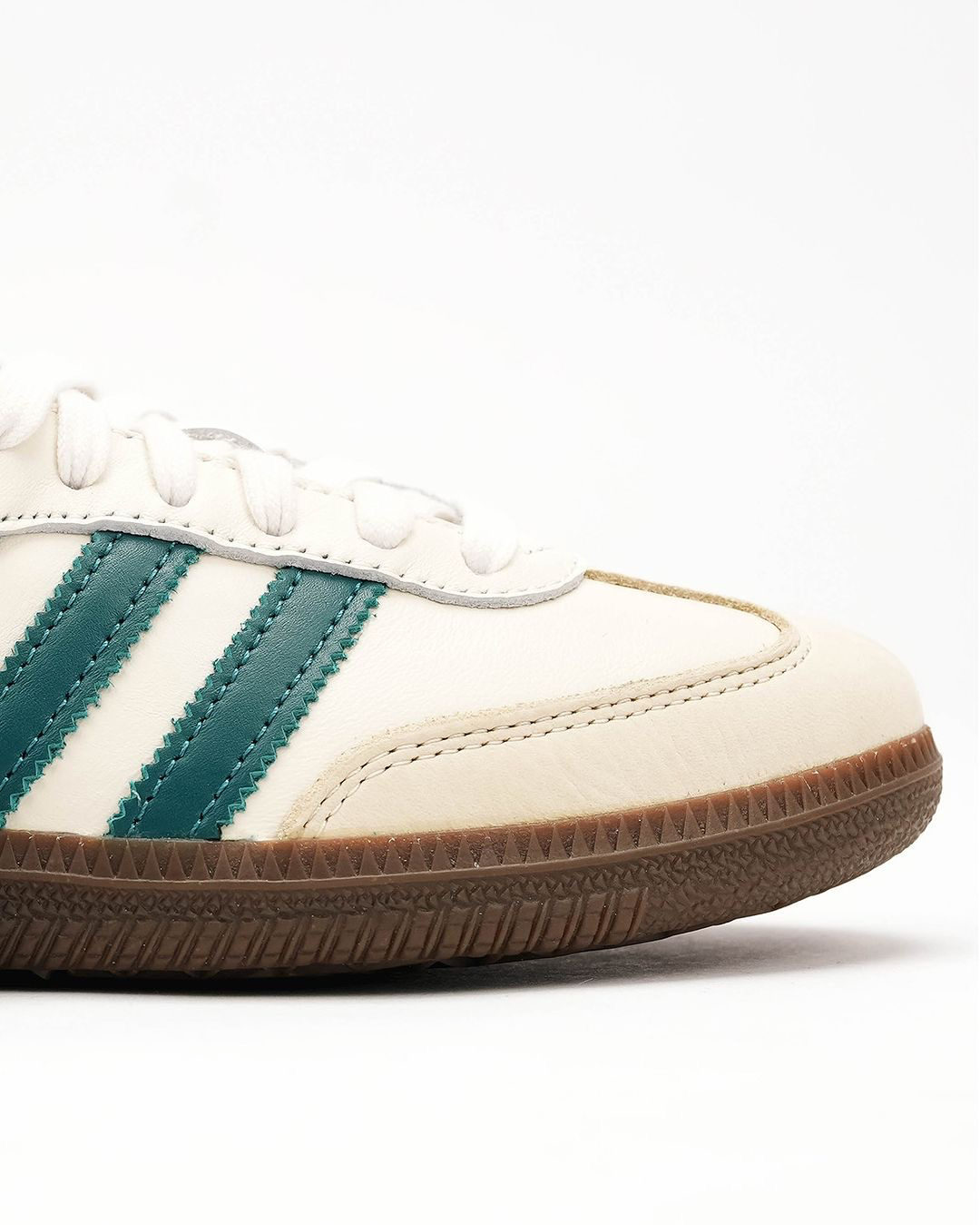Adidas Samba OG White Legacy Teal 优雅的奶油皮革上引人注目的青绿色口音给人一种别致的运动效果。这种清新的颜色组合将为你的三条纹系列做一个声明