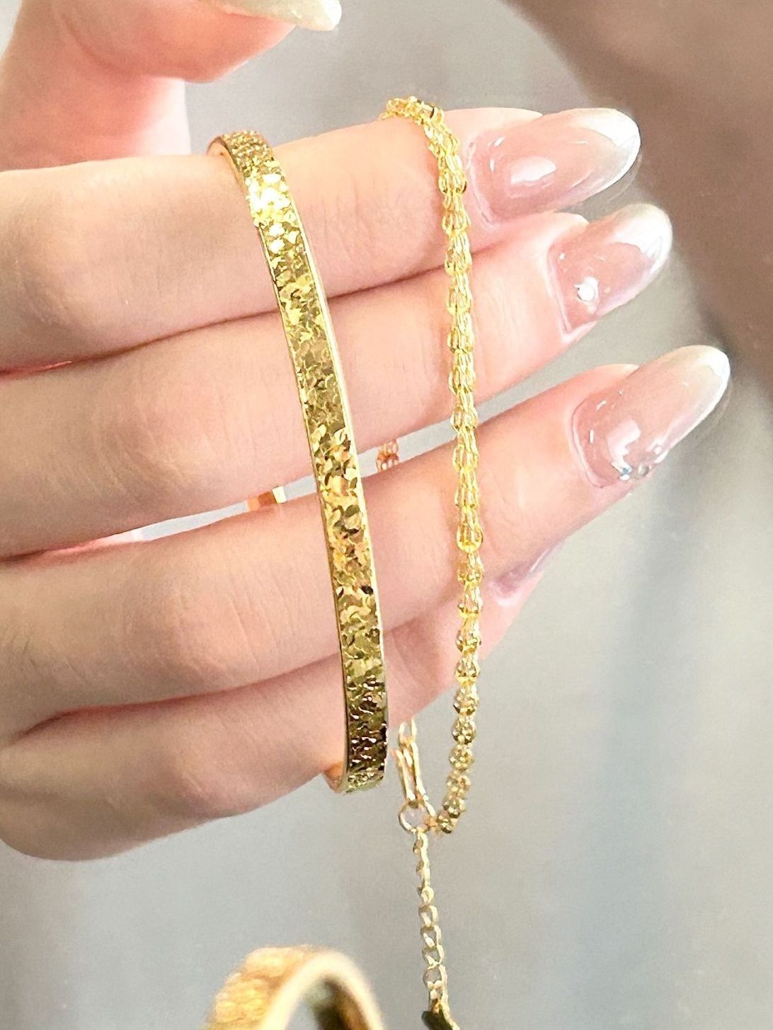 嗯?这难道不是七夕的送礼首选嘛? 不会不会不会还有人不知道碎碎冰金镯子吧 戴起来像是满天星河在腕间流转,又像是风过金色稻田麦浪扬~ 闪到难以聚焦再加上本身足金材质带来的贵气感~ 碎冰冰手搭上凤尾链金手链~ 上手灵动又贵气~ 碎金闪亮加倍 直接戴在手上被夸爆~ 图源网络侵删