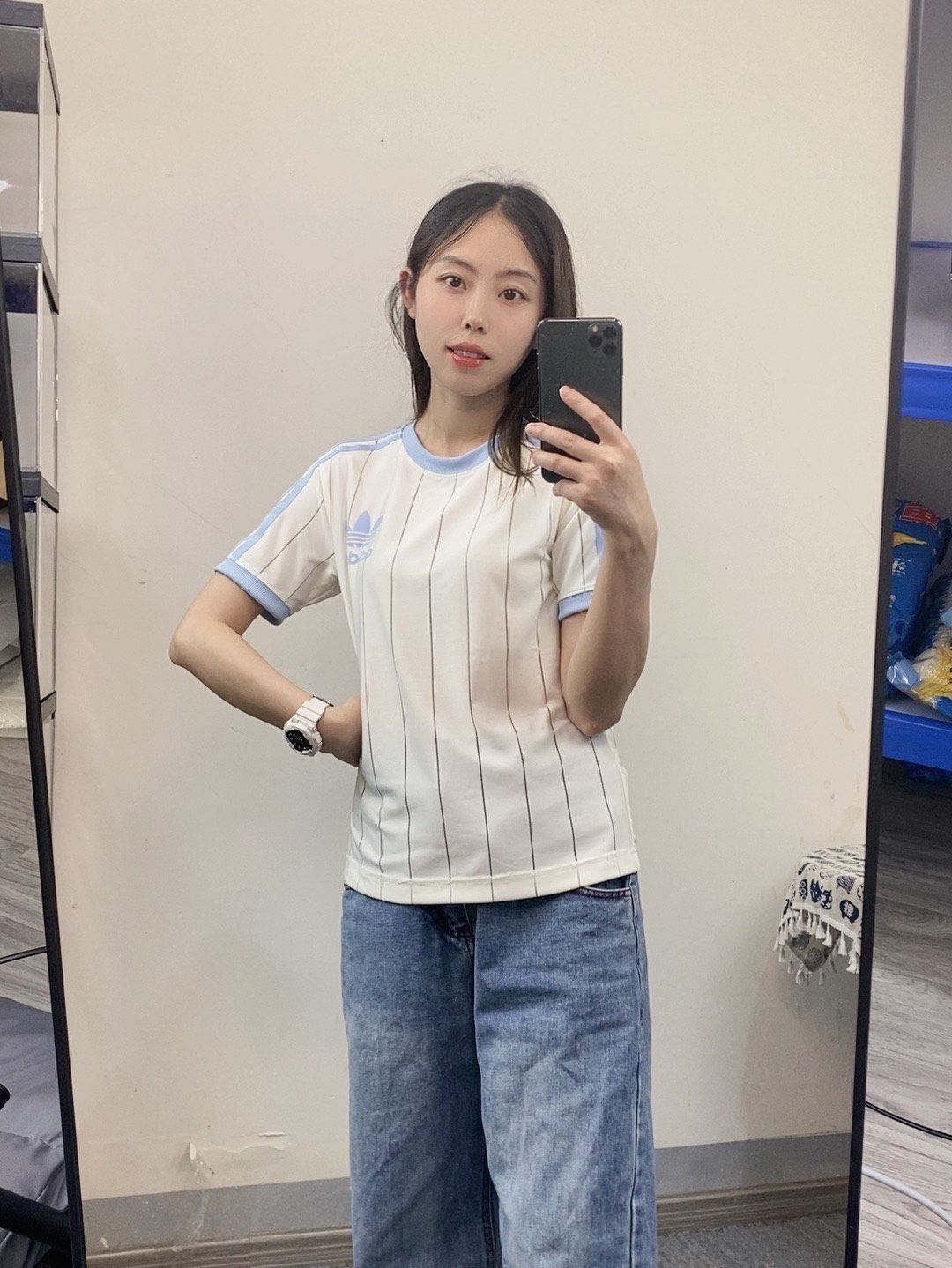 ✨今日份的蓝色系穿搭 好清爽! ✨155,83斤穿的XS码,码数是标准的 ✨胸前Logo印花的,T恤很薄,穿上非常凉快,衣服整体都有透气孔,就很适合夏天,运动的时候也很适合穿,蓝白配色的复古球衣风🌬让它变得不简单了 (图片来自博主:小易小易是科蜜)
