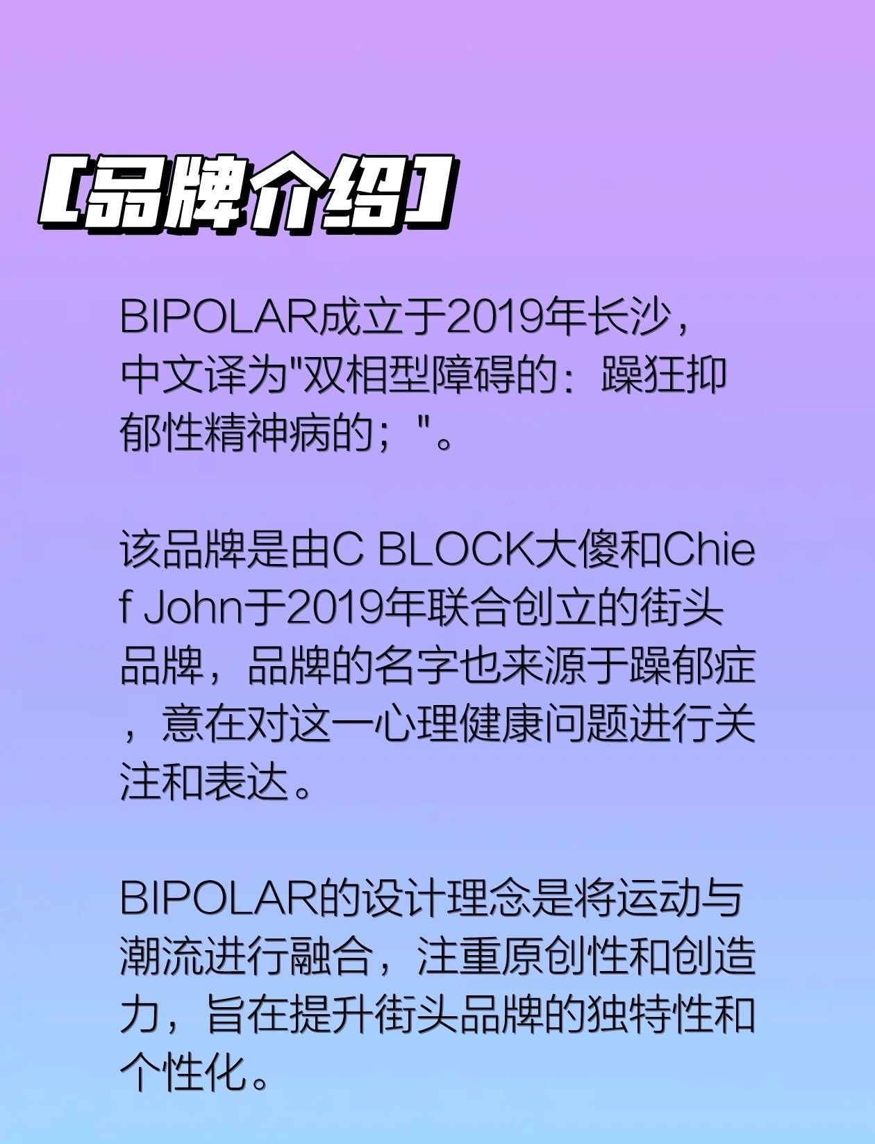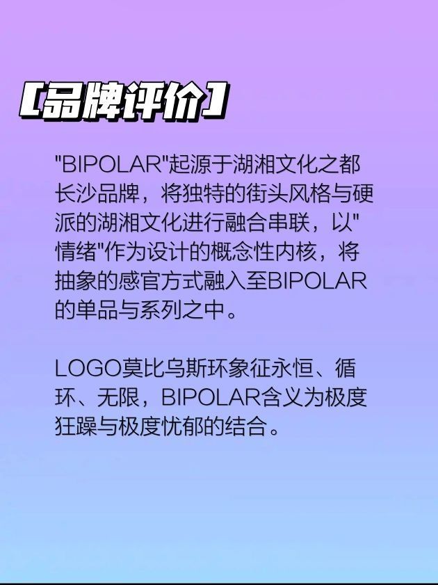 BIPOLAR成立于2019年长沙,中文译为"双相型障碍的:躁狂抑郁性精神病的;"。 BIPOLAR是由CBLOCK大傻和Chief John于2019年联合创立的街头品牌。品牌的名字来源于躁郁症,意在对这一心理健康问题进行关注和表达。BIPOLAR的设计理念是将运动与潮流进行融合,注重原创性和创造力,旨在提升街头品牌的独特性和个性化。 "BIPOLAR"起源于湖湘文化之都长沙品牌,将独特的街头风...